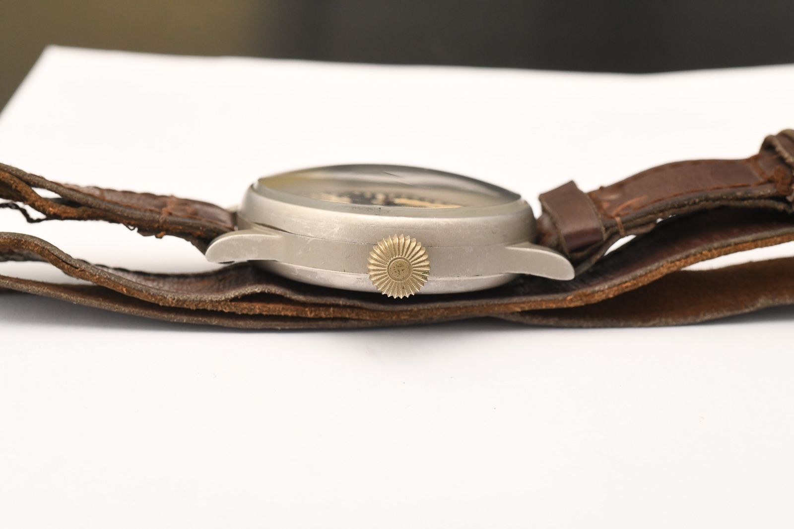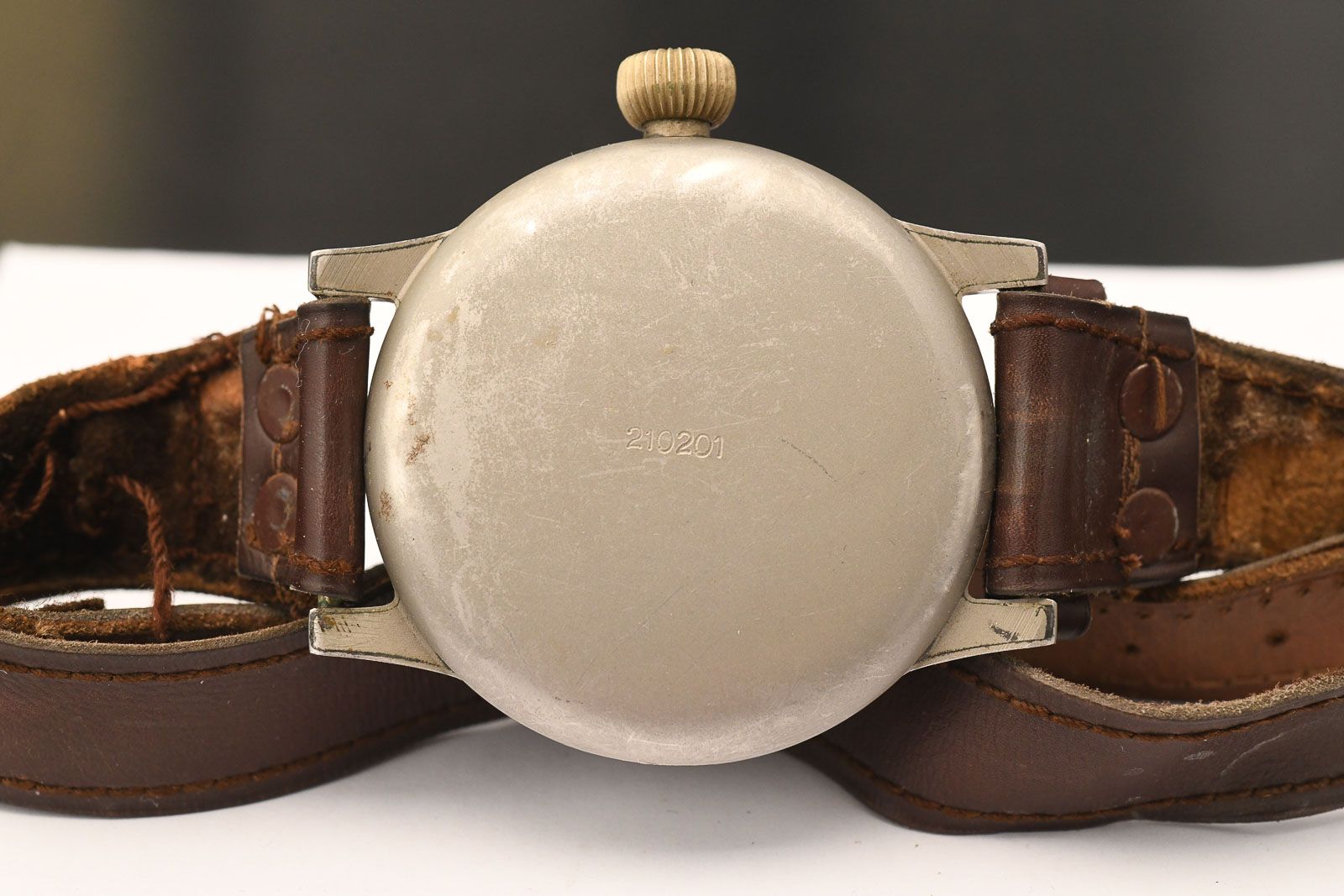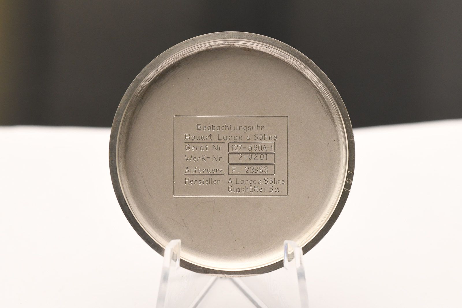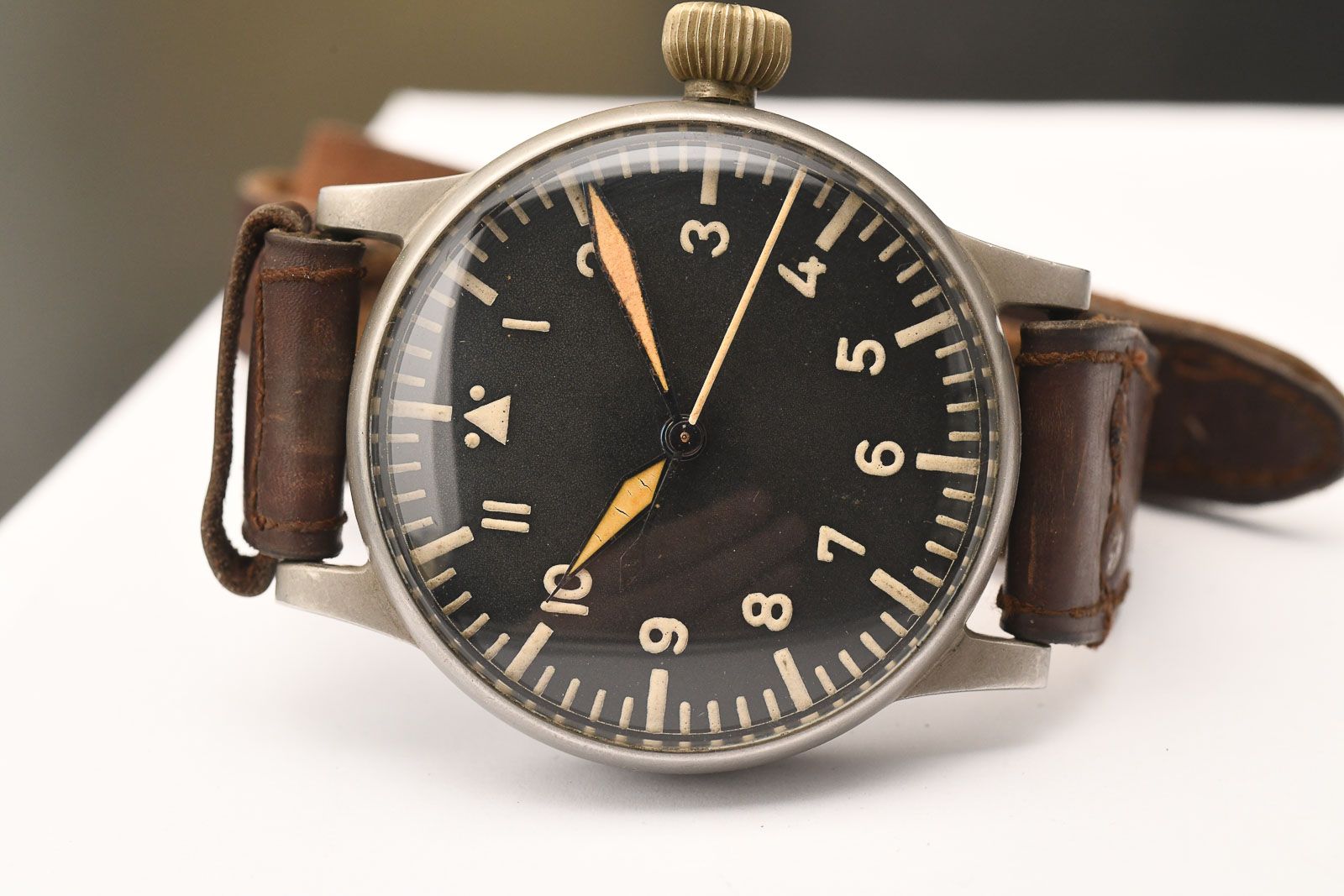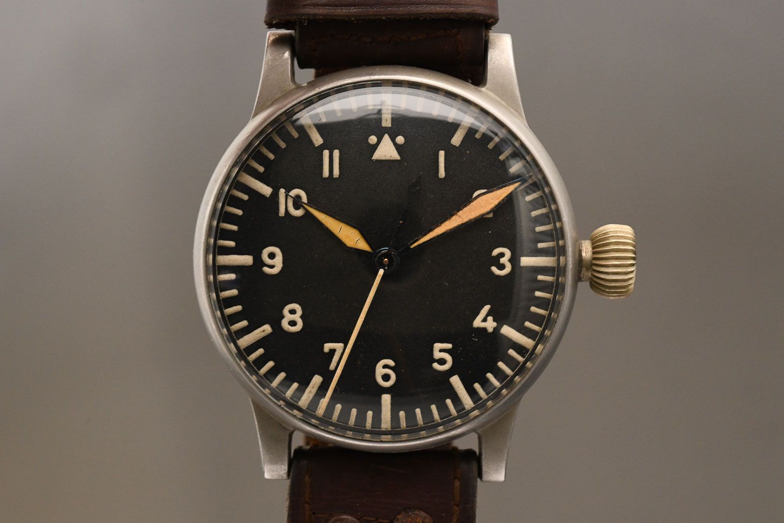 Lange und Söhne 1940ies WWII Military Aviaterswatch. Very well-preserved and rare Lange & Söhne observation watch, which was also built by Lange & Söhne in Glashütte. It is a rare type A design. Watches in this condition with the original leather strap and well-preserved case lacquer are hardly to be found on the market anymore, as they are all tucked away in collections. All numbers match and are completely authentic. The dial and hands are also very well preserved and show little patina. The movement is very clean and runs with an amplitude of 260 degrees and has a minimal deviation of 8 seconds per day. A rare opportunity for collectors of contemporary watches.