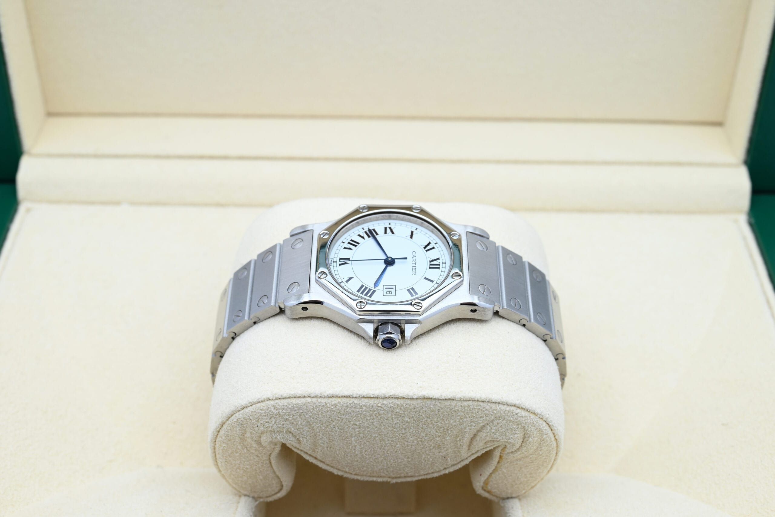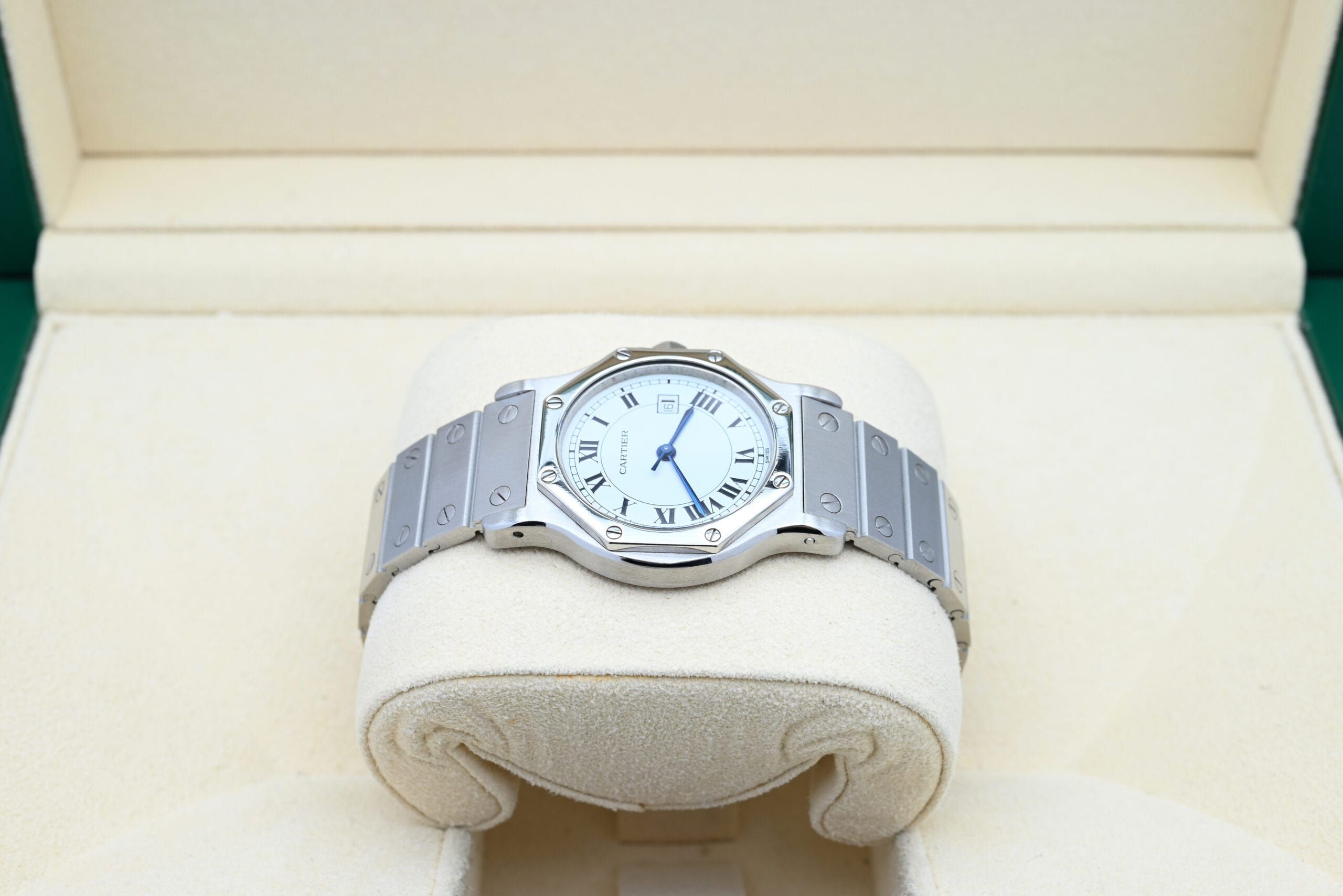 Cartier Santos Octagon 2965 des années 1990 en excellent état, incluant la boîte Cartier d'origine. Toutes nos montres ont été soigneusement vérifiées par notre propre horloger et entretenues si nécessaire.