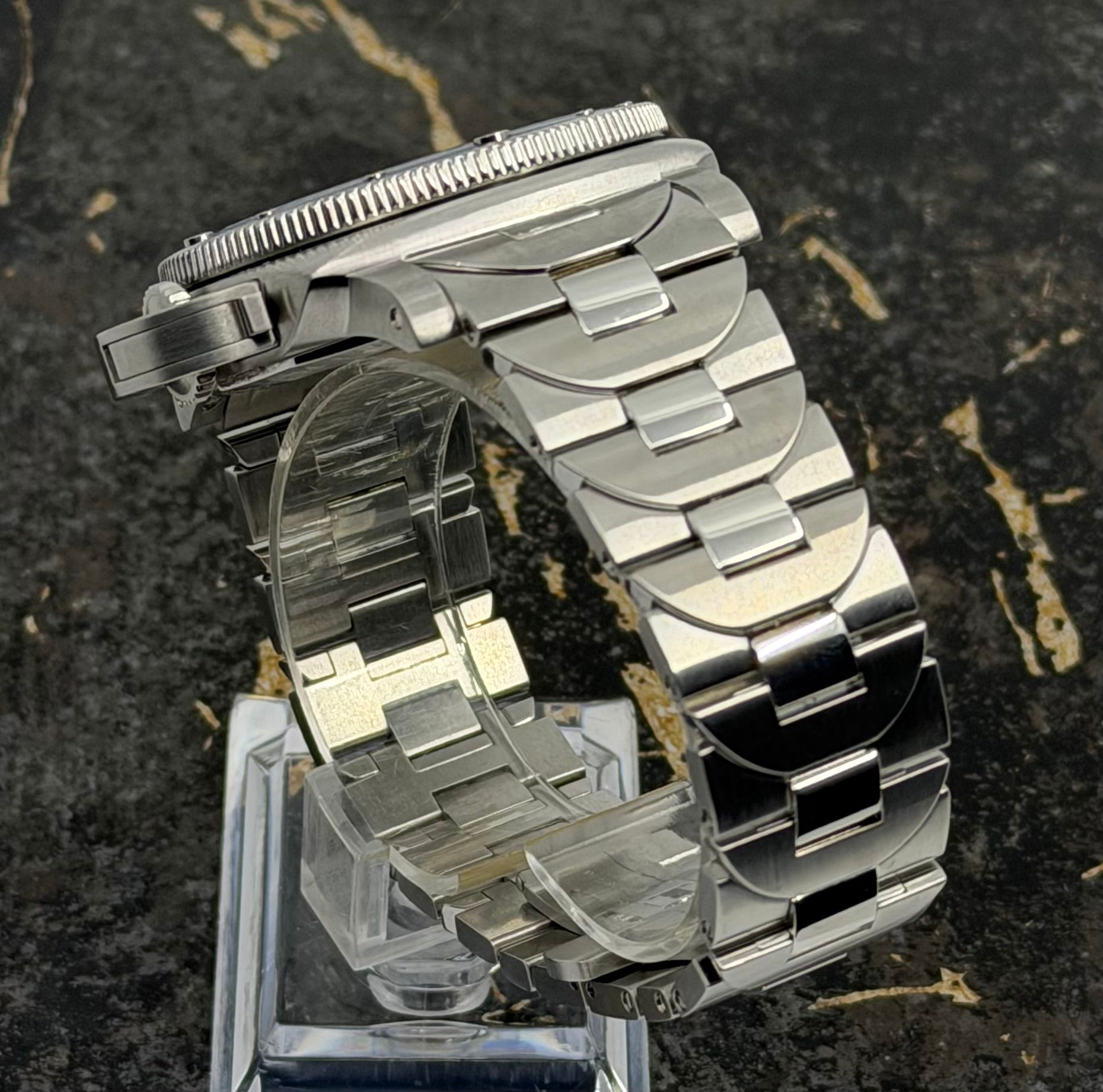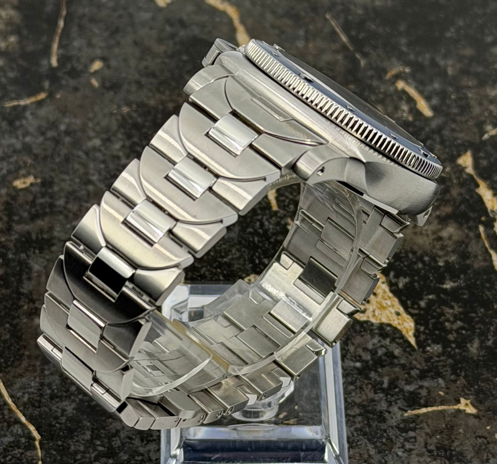 - Légères traces d’usure telles que de fines rayures ou micro-rayures. Le boîtier, la lunette et le bracelet conservent leurs arêtes nettes et leur forme générale. Peut avoir été poli professionnellement sans altérer les contours d’origine. Entièrement fonctionnelle mécaniquement.