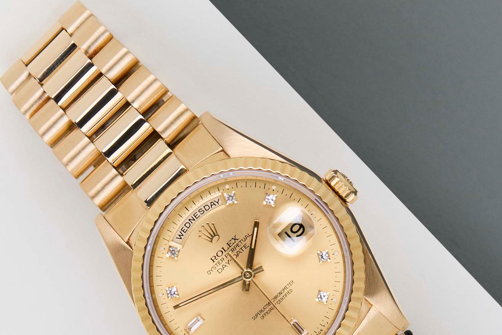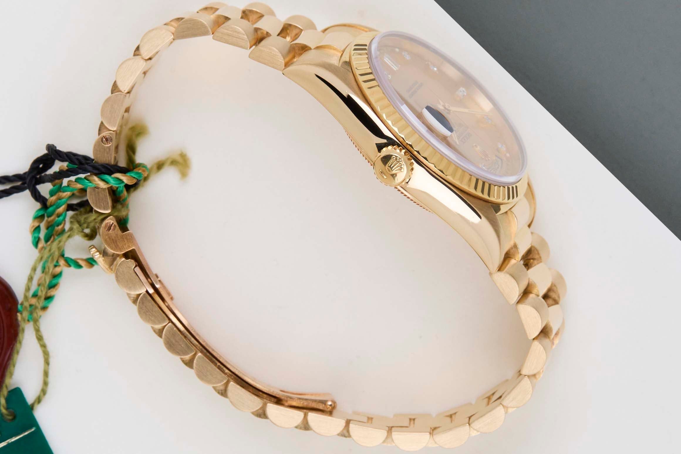Cette Rolex Day-Date 36 'Cadran Diamant Champagne' date de mars 1996. Cette Day-Date est en Or Jaune 18k et est équipée d'un bracelet Président qui dissimule le fermoir Crown.
