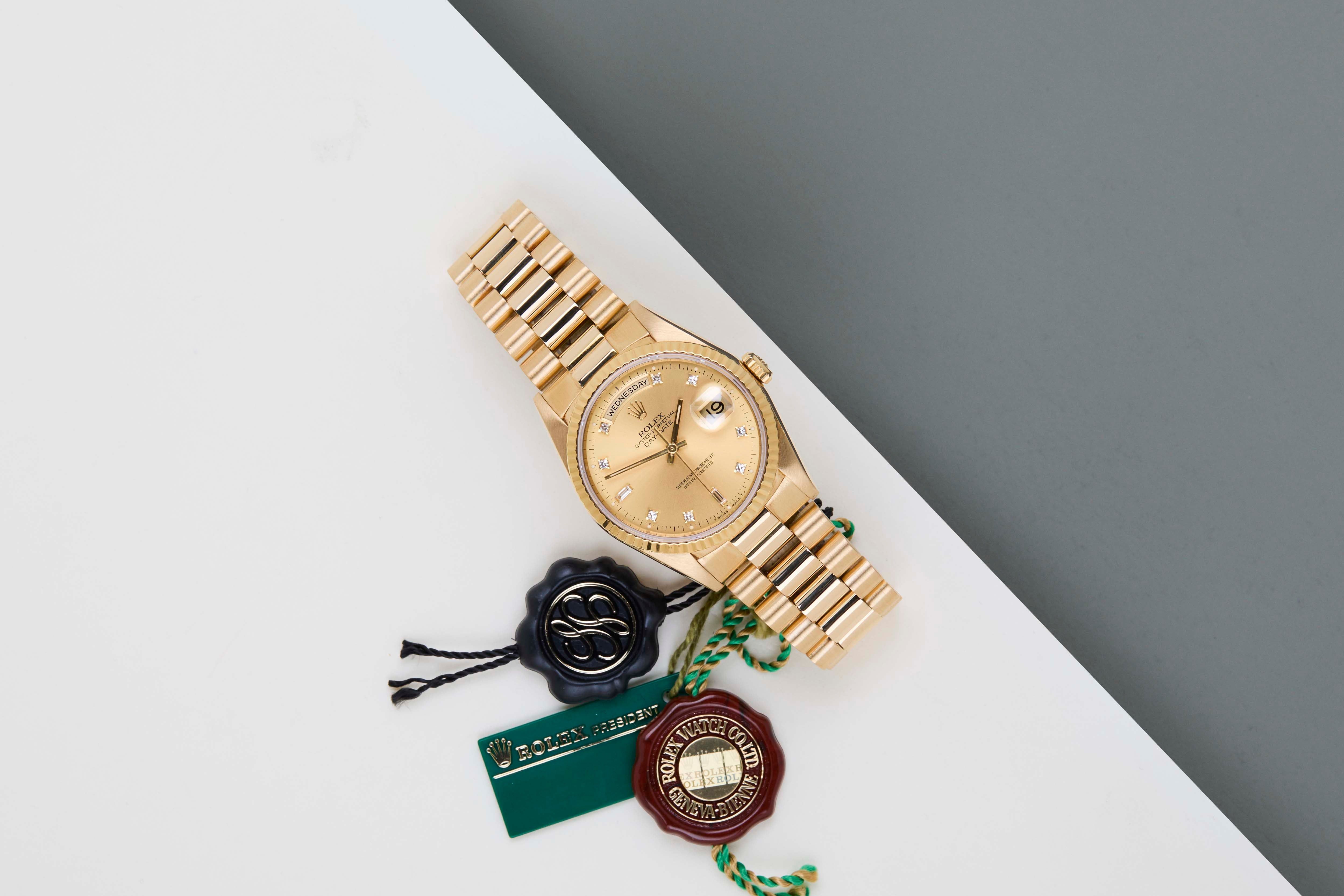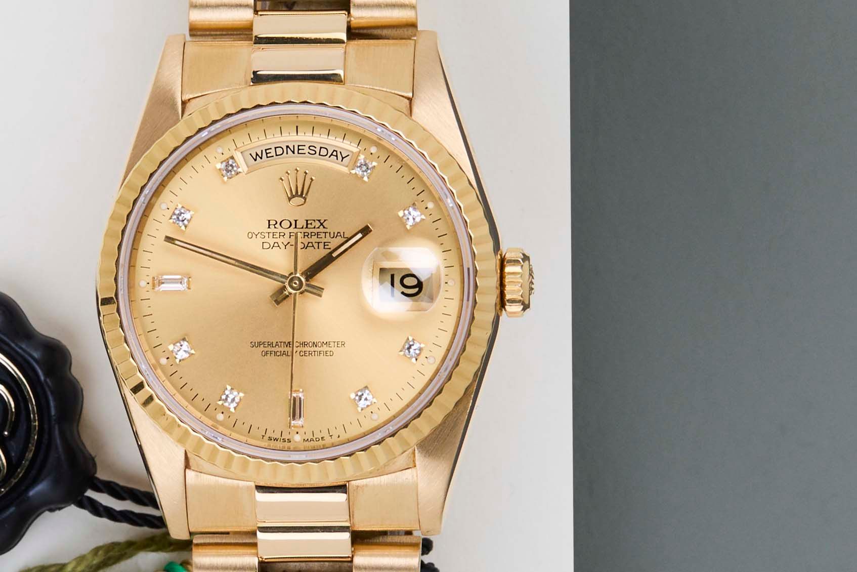 Full Set | Including Rolex Green Tag | English Day Disk | Bracelet 8385The Day-Date was originally designed to be a precious instrument for everyday use. Thanks to a watchmaking prowess that was unprecedented at the time. The Day-Date was the first self-winding, waterproof chronometer wristwatch to display, in addition to the date, the day of the week spelt out in full, in two separate windows. Both change simultaneously at midnight.The Day-Date is a perfect balance between elegance and technical excellence. Instantly recognizable, its unique design has forged its identity, as the Day-Date is only produced in the precious metals; Yellow Gold, White Gold, Everose Gold and Platinum.This Rolex Day-Date 36 'Champagne Diamond Dial' dates back to March 1996. This Day-Date is made out of 18k Yellow Gold and is fitted with a President bracelet which conceals the Crown clasp.The days on the Day-Date are written differently depending on the language. Using most writing systems as Latin, Arabic, and Dutch. This example has an English Day-wheel.This Rolex Day-Date 36 is in Mint condition and comes with the original Rolex Warranty Papers and box. Furthermore, the watch has been serviced by our watchmaker, and therefore it comes with one year of Steiner warranty.