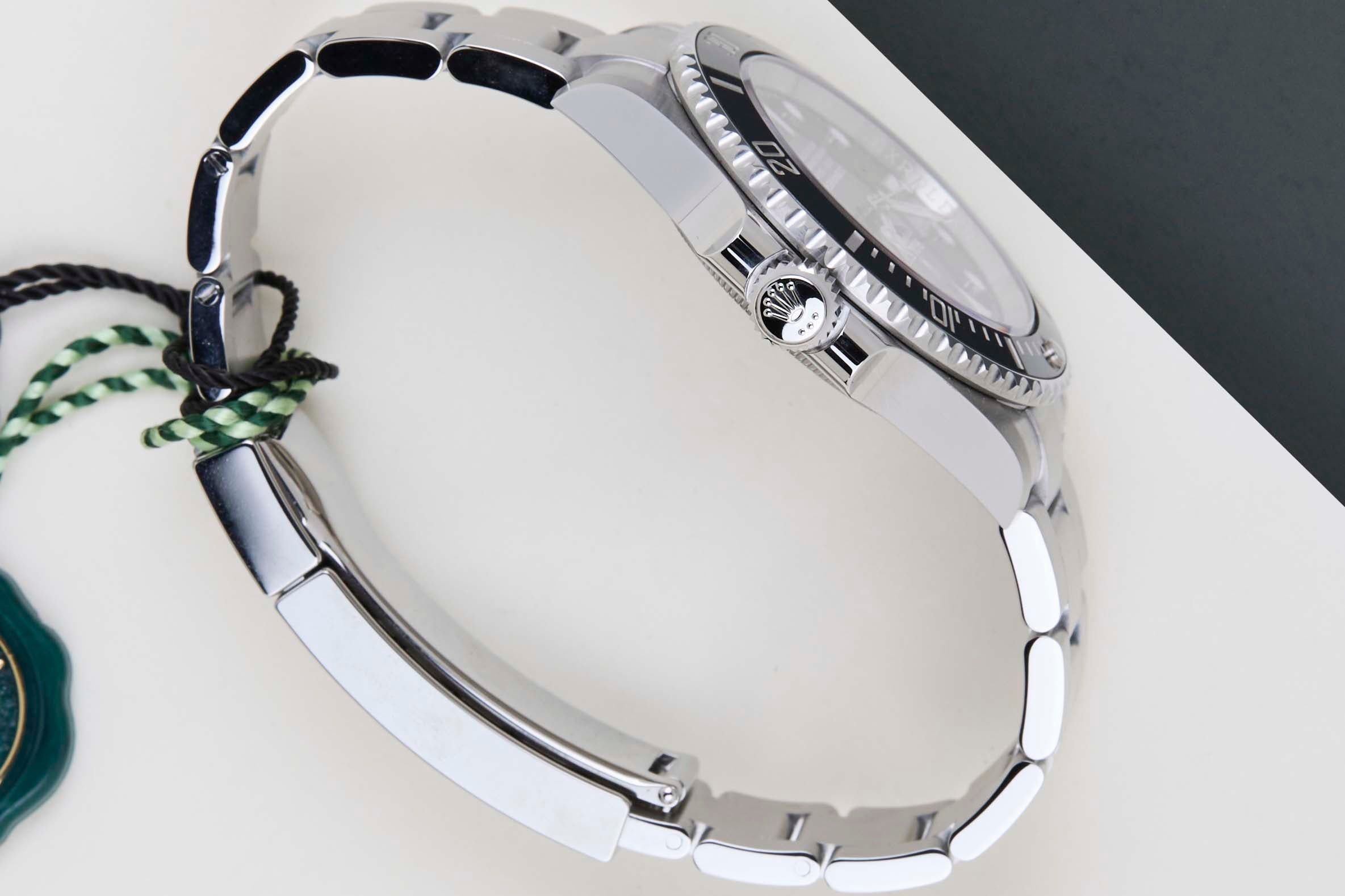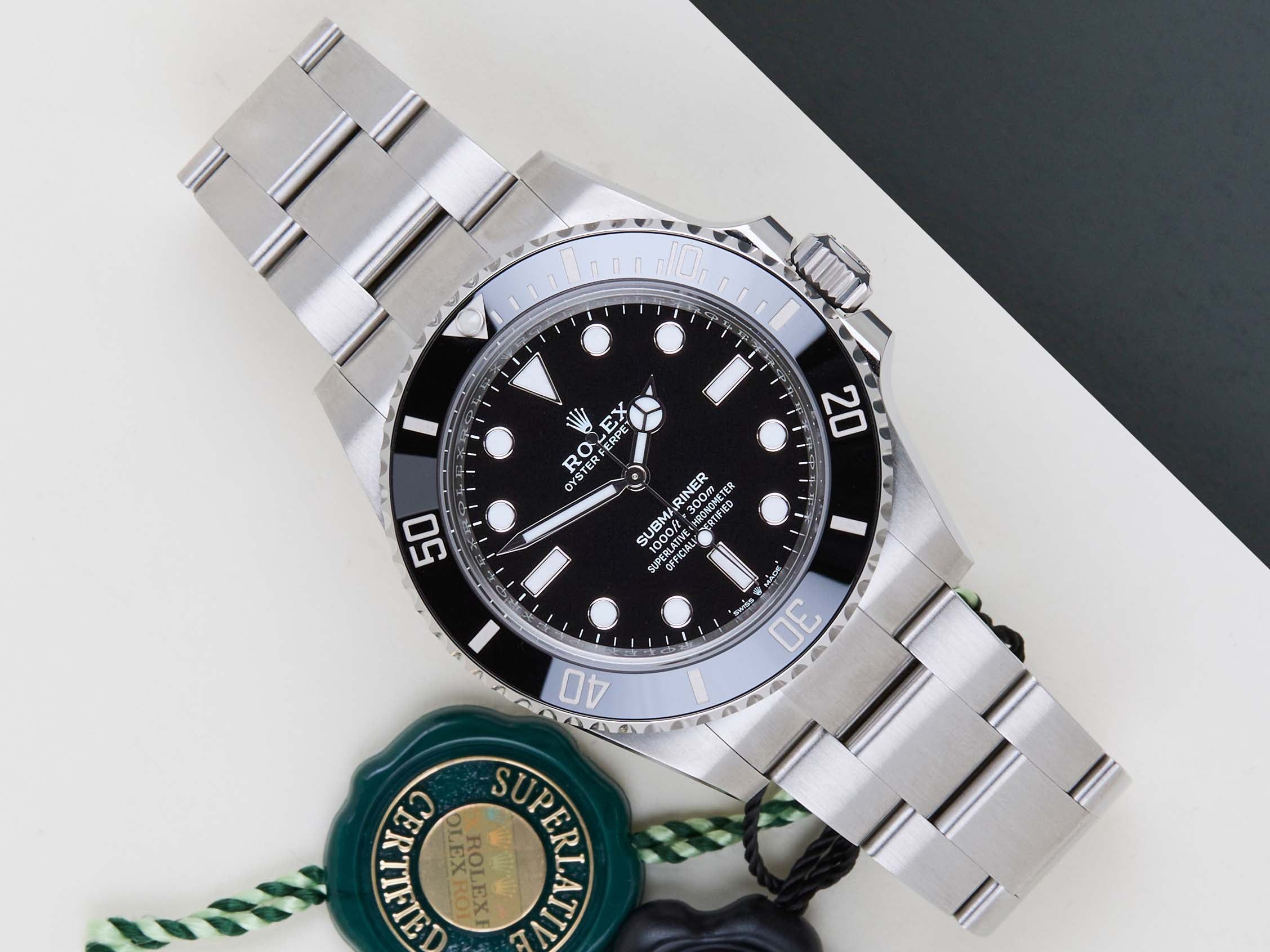 Cette Rolex Submariner No Date est en état neuf et jamais porté et est livrée avec la carte de garantie Rolex originale et la boîte d'origine. De plus, la montre bénéficie toujours de la garantie internationale Rolex jusqu'en mars 2031.