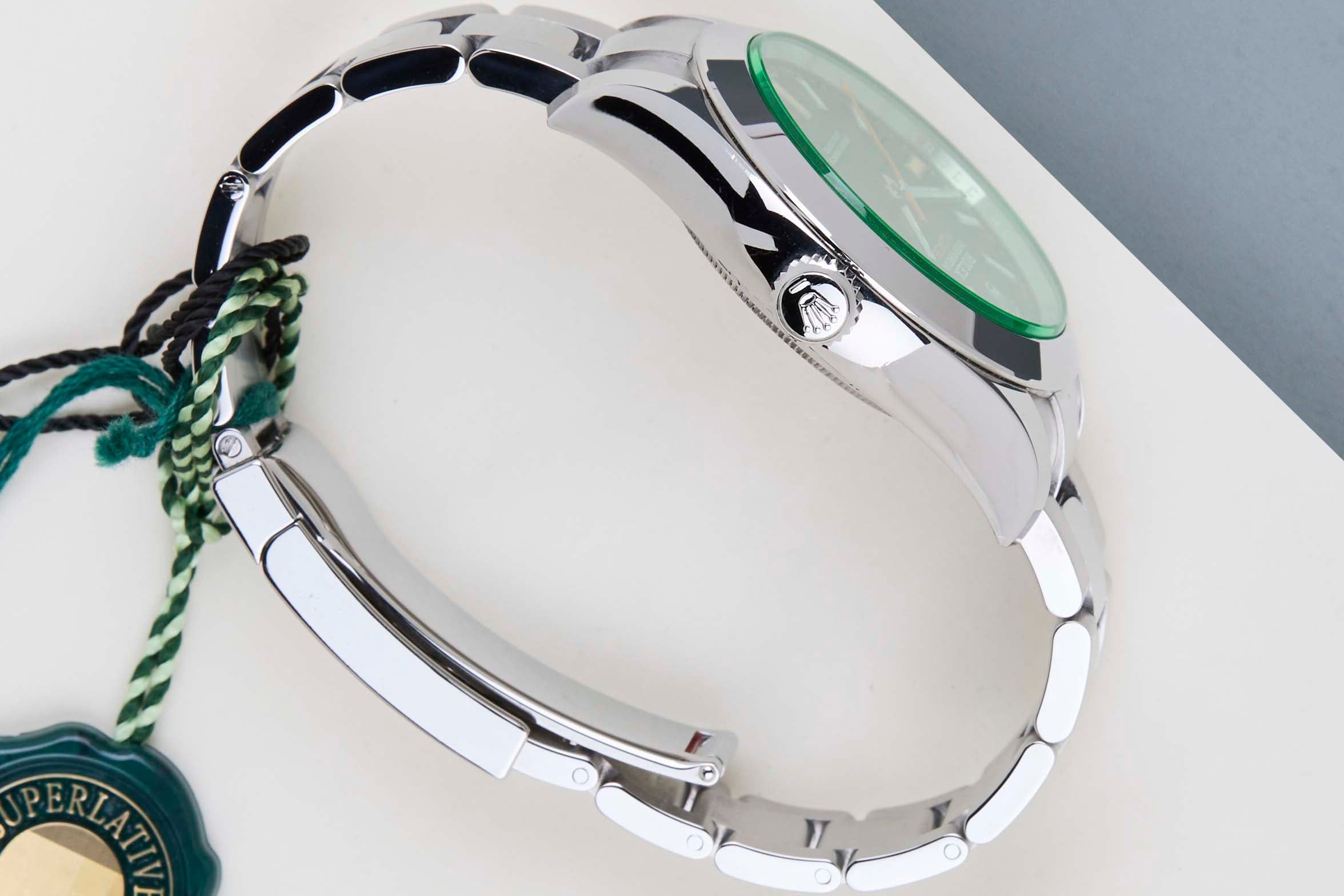 Full Set | Including Rolex White TagThe Rolex Milgauss was originally introduced in 1956 and has undergone several updates and redesigns over the years. The Rolex Milgauss is a watch that was designed for people who work in environments where strong magnetic fields can interfere with the accuracy of a mechanical timepiece. The name "Milgauss" comes from the French word "mille," which means "thousand," and the unit of magnetic field strength, the "gauss." The watch is able to withstand magnetic fields up to 1,000 gauss, hence the name. This Rolex Milgauss 'Black Dial' was sold for the first time in March 2021.The Rolex Milgauss reference 116400 is a version of the watch that was introduced in 2007. The 116400GV also features a green sapphire crystal, which is a signature feature of this generation of the Milgauss.This Rolex Milgauss is in Mint condition and comes with the original Rolex Warranty Card and box. Furthermore, the watch has been serviced by our watchmakers and therefore comes with one year Steiner Warranty.