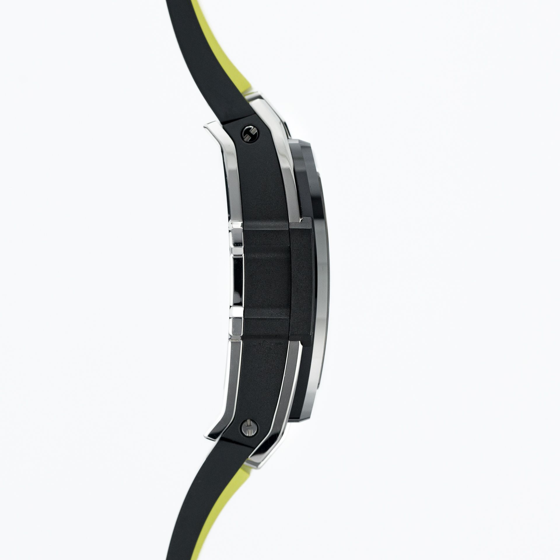 Très probablement, lorsque vous entendez Big Bang, vous imaginez ce boîtier bien connu avec les six vis proverbiales de la marque et sa forme ronde, et nous pouvons supposer avec une grande certitude que cette forme allongée, courbée et extravagante, qui paraît plus massive et renforce la présence de la montre au poignet, ne vous vient pas à l'esprit. La montre que nous vous présentons fait partie de la série Spirit of Big Bang de la marque, un chronographe automatique, avec un boîtier de 51 mm par 45 mm en céramique noire et un bracelet en caoutchouc avec une boucle en céramique et titane.