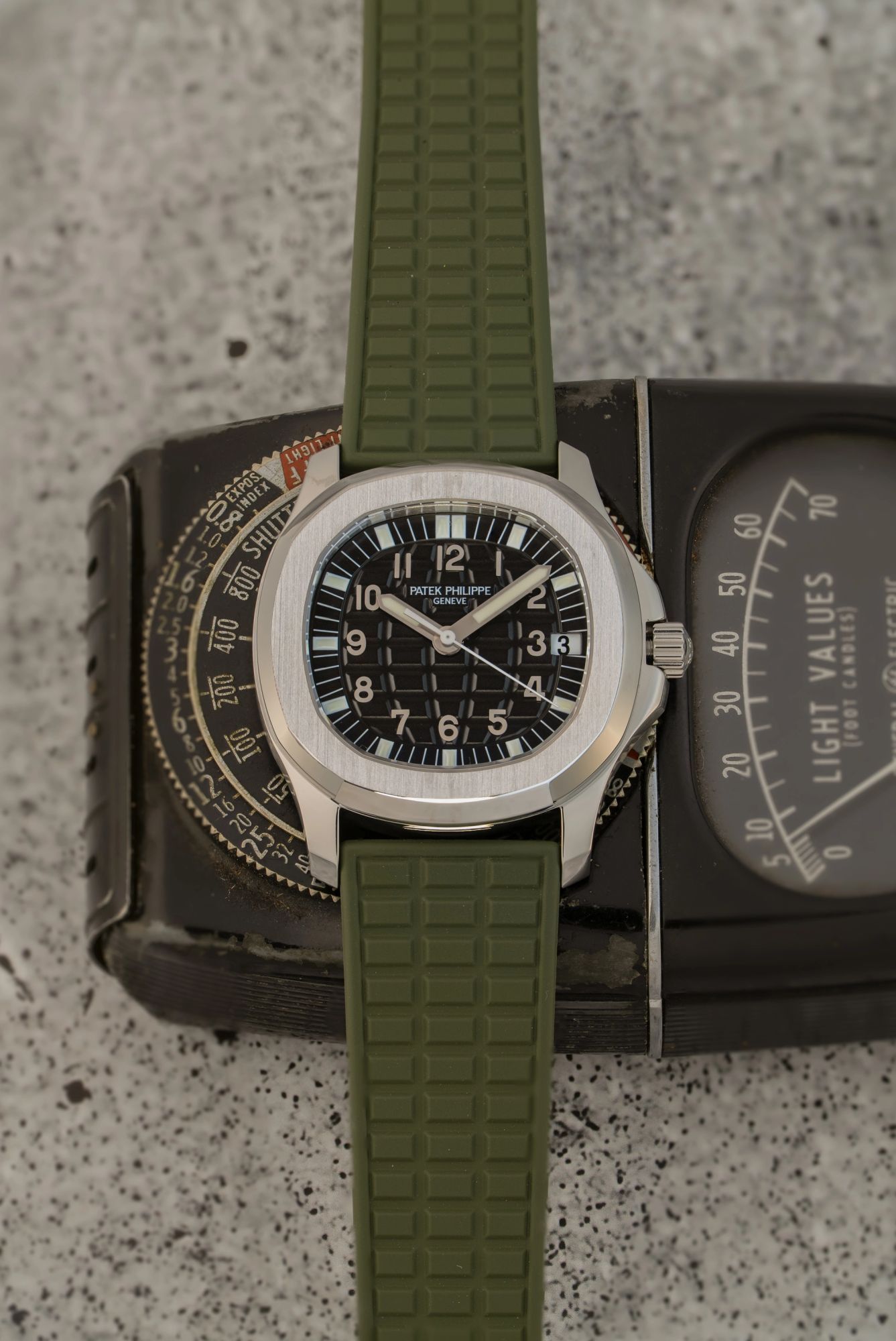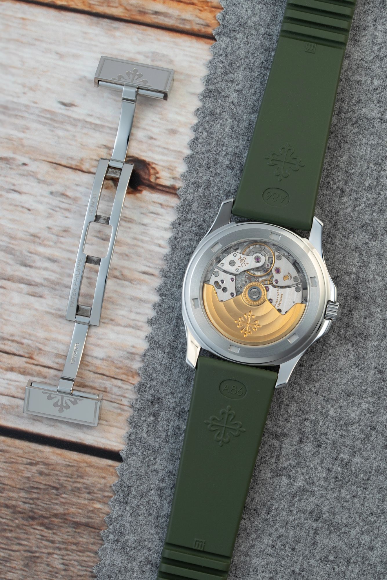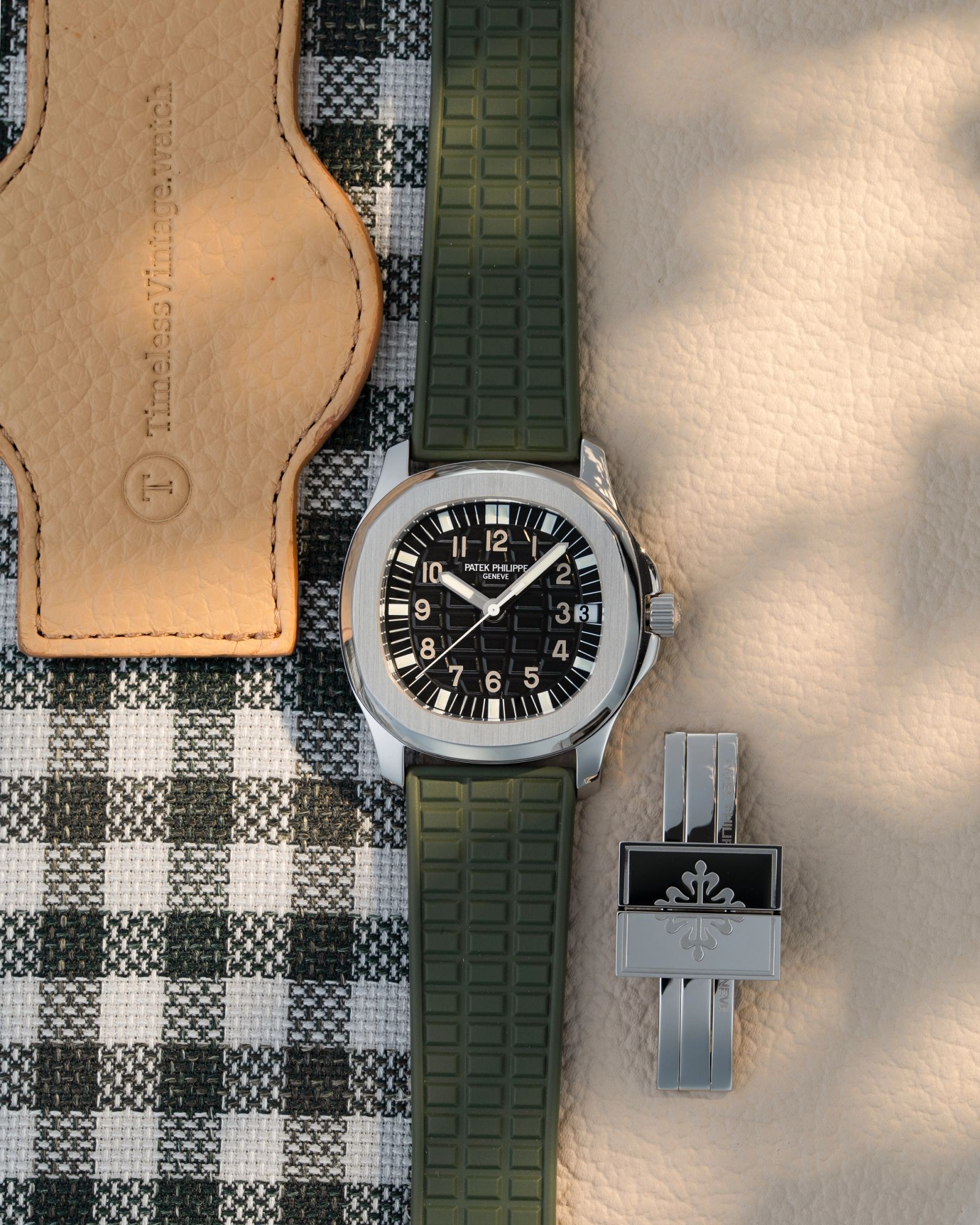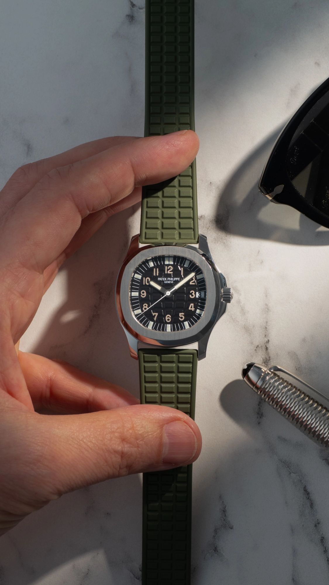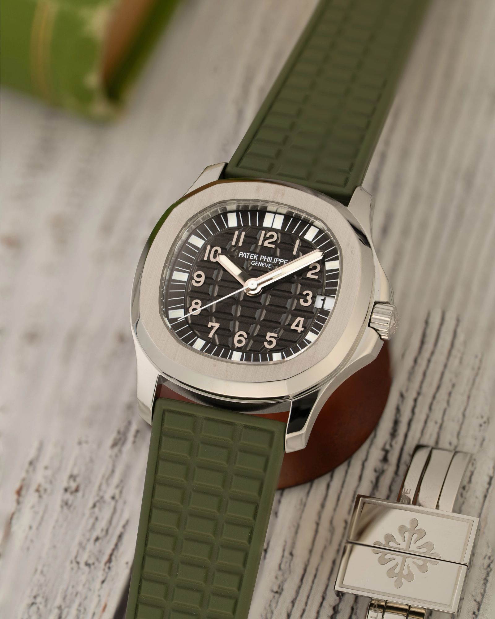 The watch is fitted with a green composite strap, which complements the sporty yet sophisticated nature of the Aquanaut design. If you prefer a black or dark red strap instead, we we have both in stock. The overall configuration reflects a thoughtful balance between durability and elegance, which has contributed to the enduring appeal of this reference.