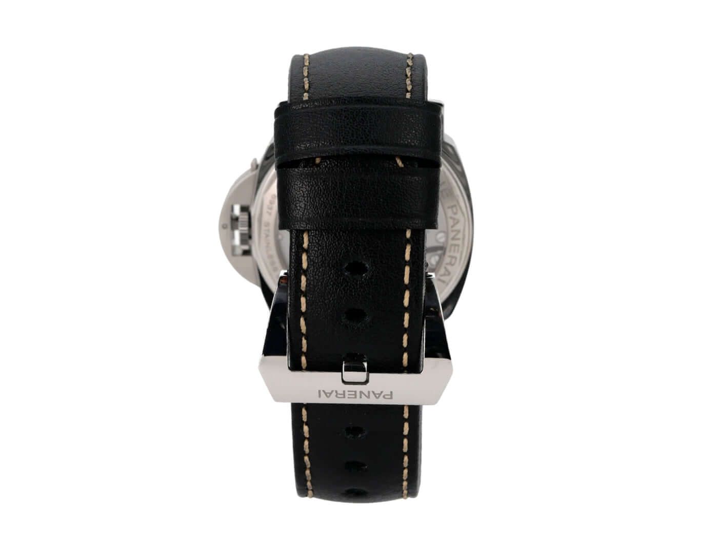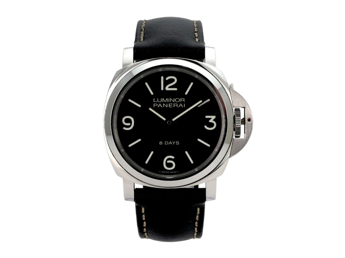Panerai Luminor Base 8 Days Acciaio Ref. PAM00560 from 2016Polished stainless steel case, case diameter 44 mm, polished stainless steel bezel, black leather strap with polished stainless steel pin buckle, black dial with luminous Arabic numerals and luminous indices, mechanical hand-wound movement, Panerai caliber P.5000, fully in-house made by Panerai, 21 jewels, 21,600 A/h, power reserve 192 hours, crown protection bridge, anti-reflective sapphire crystal made of 2.5 mm thick corundum, stainless steel case back with sapphire crystal, water-resistant up to 30 bar.