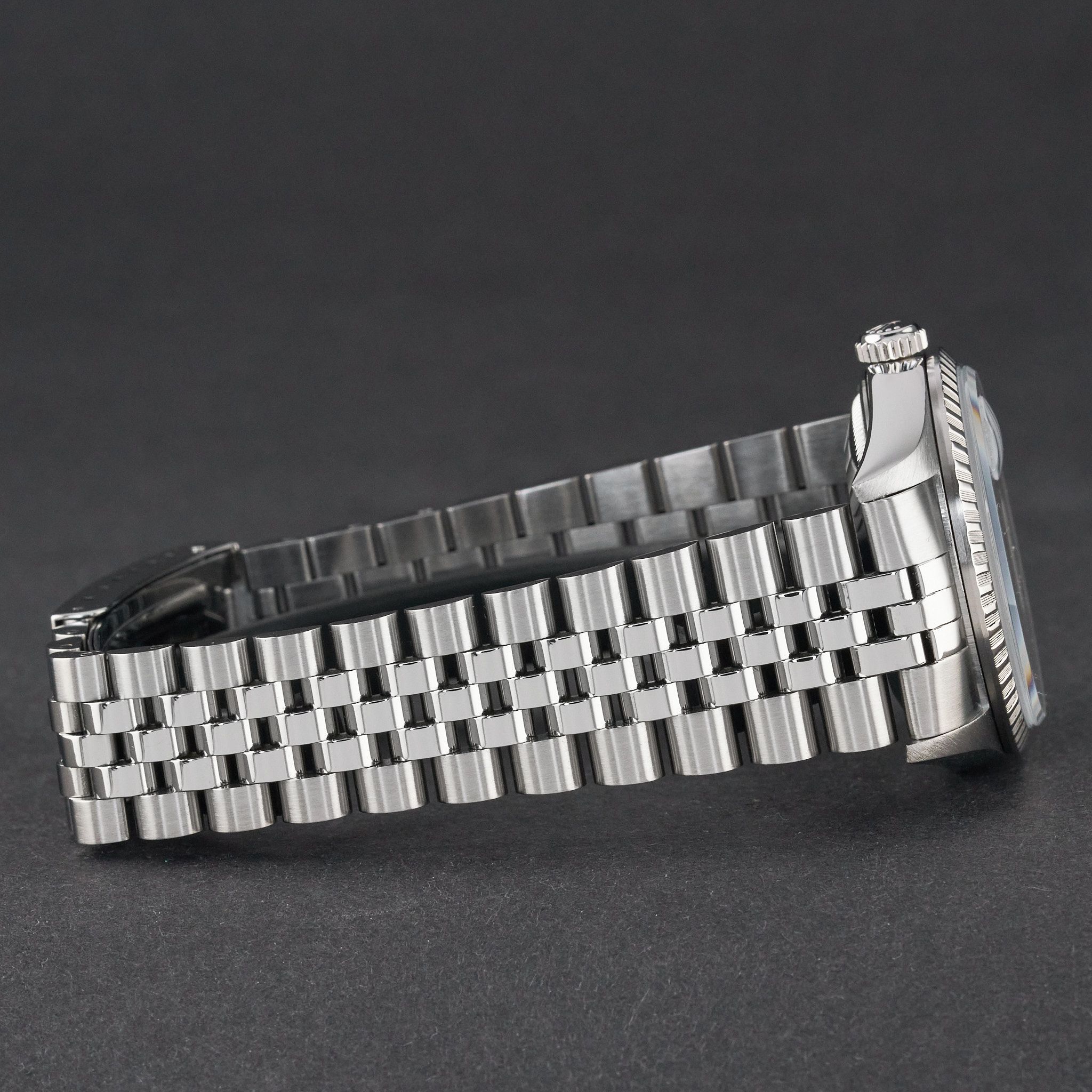 - Légères traces d’usure telles que de fines rayures ou micro-rayures. Le boîtier, la lunette et le bracelet conservent leurs arêtes nettes et leur forme générale. Peut avoir été poli professionnellement sans altérer les contours d’origine. Entièrement fonctionnelle mécaniquement.
