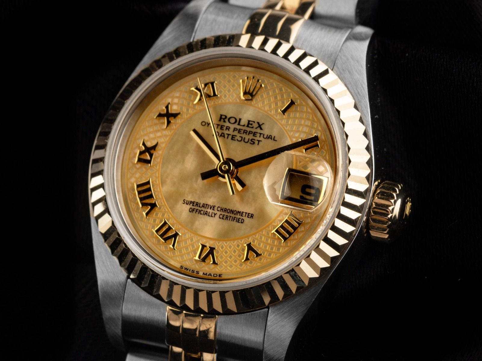 Rolex Datejust Lady Perlmutt Stahl 18kt Gelbgold Automatik Armband JubiléGehäuse Edelstahl poliert und satiniert, Gehäusedurchmesser ohne Krone 26mm, Gehäusehöhe 10,3mm. Lünette 18kt Gelbgold geriffelt und poliert. Armband Jubilé Edelstahl / 18kt Gelbgold poliert und satiniert, Faltschließe Edelstahl mit Hersteller-Logo. Zifferblatt champagnerfarben / Perlmutt hell mit aufgesetzten gelbgoldenen römischen Ziffern und gelbgoldenen Zeigern. Uhrwerk Automatik, Chronometer mit Zeugnis, Rolex Manufakturkaliber 2235 mit 31 Edelsteinen. Anzeige von Stunde, Minute und Sekunde über Zeiger aus der Mitte mit Sekundenstopp zur sekundengenauen Einstellung der Uhrzeit, Datumsanzeige mit Schnellverstellung unter Glaslupe bei 3 Uhr. Saphirglas kratzfest. Krone verschraubbar mit Hersteller-Logo. Boden Edelstahl verschraubt. Gewicht der Uhr inklusive Armband 55g, Länge des Armbandes inklusive Gehäuse 165mm. Referenznummer: 79173, Gehäusenummer: Y365XXX, Baujahr: 2002, ID: P2751100000326HW-8500, Artikelnummer: 10000085294. Mit Gangkontrolle und kompletter äußerlicher Aufarbeitung von März 2026. Original Rolex Box und Garantie Papiere von Oktober 2004, LC 888 / Hong Kong sowie Beschreibung, Ledermäppchen, Übersetzungsheft, Rolex Chronometer-Siegel und Watchregister Auszug von März 2026, The Watch Register Zertifikat / ohne Eintrag (Internationale Datenbank für verlorene oder gestohlene Uhren), Full Set.. Lieferzeit sofort.