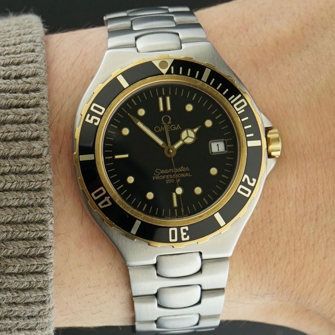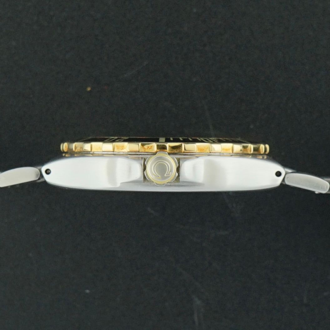 This vintage Omega Seamaster Professional 200M was produced in 1975 and is an early production Seamaster diver with the Mercedes hour hand. Although that already is becoming increasingly uncommon, this watch also features a golden bezel with black lacquer and a gold and black dial, while the rest of the case remains stainless steel, with its original polish still fully present, as well as the gold and black back emblem on the clasp. This watch has a quartz movement which was overhauled in March 2026 and now runs and functions perfectly. The overall condition is incredible, making this watch a beautiful and increasingly uncommon daily wearer from the vintage era.Year of production: 1975