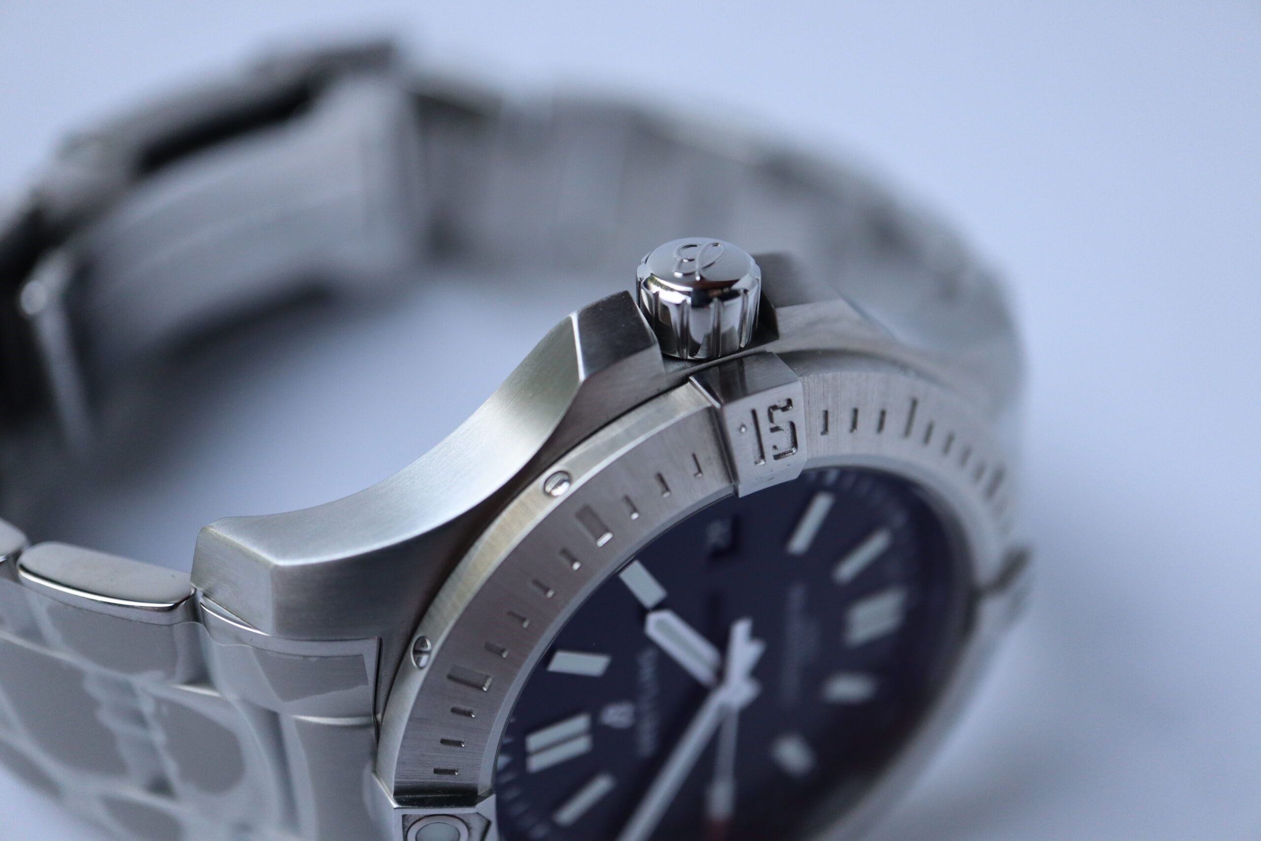 In the 1980s, Breitling developed the Colt for the armed forces. The no-nonsense dial had luminescent indexes with a subset of military hours for easy readability, even in low light. Breitling gave it a super sturdy case, with an extra-wide bezel and raised riders, so the crystal wouldn’t take a beating during military exercises. The Colt came in a variety of calibers, both mechanical and SuperQuartz. While this line has been discontinued, you can find an updated alternative in our Avenger collection.
