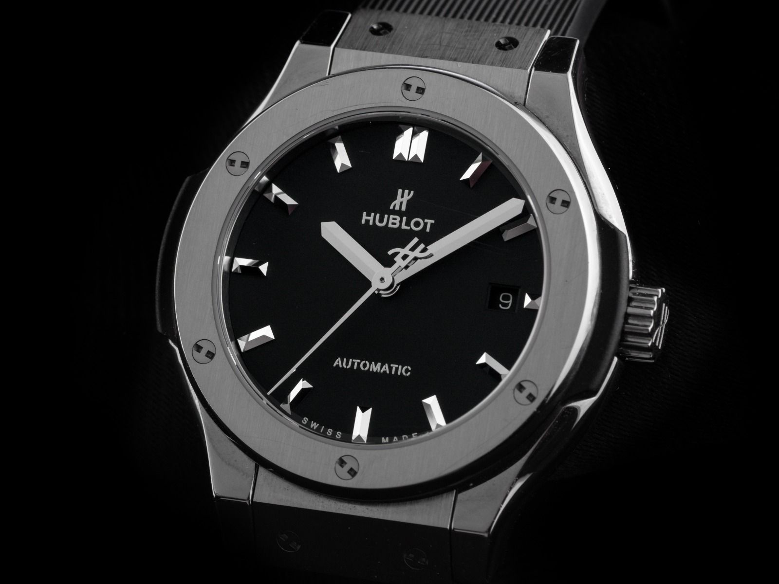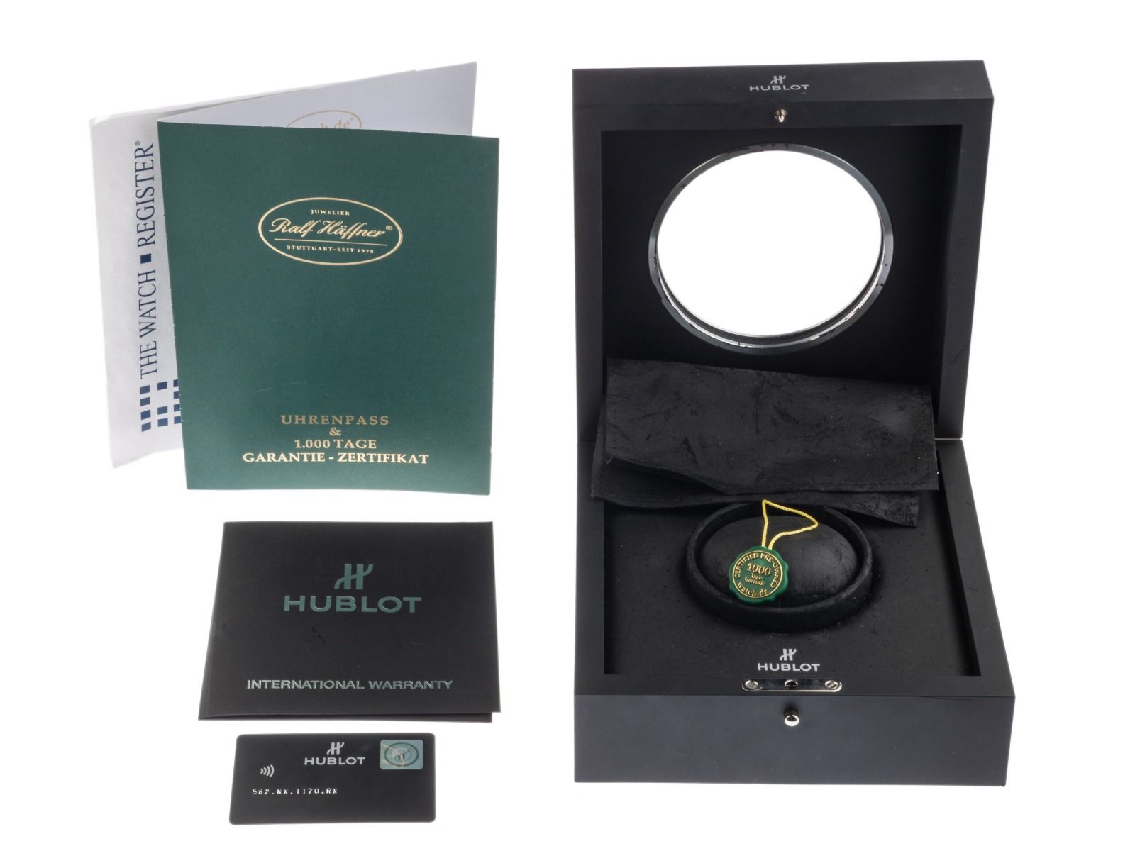 Boîtier en titane poli et satiné, diamètre du boîtier sans couronne 33mm, hauteur du boîtier 9,2mm. Lunette en titane poli et satiné, fixée par 6 vis. Bracelet Hublot en caoutchouc noir, largeur de l'attache 15mm, boucle déployante de sécurité en titane avec logo du fabricant. Cadran noir avec index appliqués et aiguilles polies. Mouvement automatique, calibre HUB1120 avec 18 pierres précieuses. Affichage des heures, minutes et secondes par aiguilles centrales avec arrêt des secondes pour un réglage précis de l'heure, affichage de la date avec réglage rapide à 3 heures. Verre saphir résistant aux rayures. Couronne avec logo du fabricant. Fond en titane fixé par 6 vis et gravé avec fenêtre en verre saphir. Poids de la montre avec bracelet 42g. Numéro de référence : 582.NX.1170.RX, numéro de boîtier : 1304XXX, ID : P279251000326HW-6100, numéro d'article : 10000085381. Avec contrôle de marche et révision extérieure complète de mars 2026. Boîte Hublot d'origine et papiers de garantie d'août 2018 et extrait du Watchregister de mars 2026, Certificat The Watch Register / sans inscription (base de données internationale pour montres perdues ou volées), Full Set. Super affaire, investissement avec potentiel de valorisation, presque pas porté. Comme neuf. Délai de livraison immédiat.