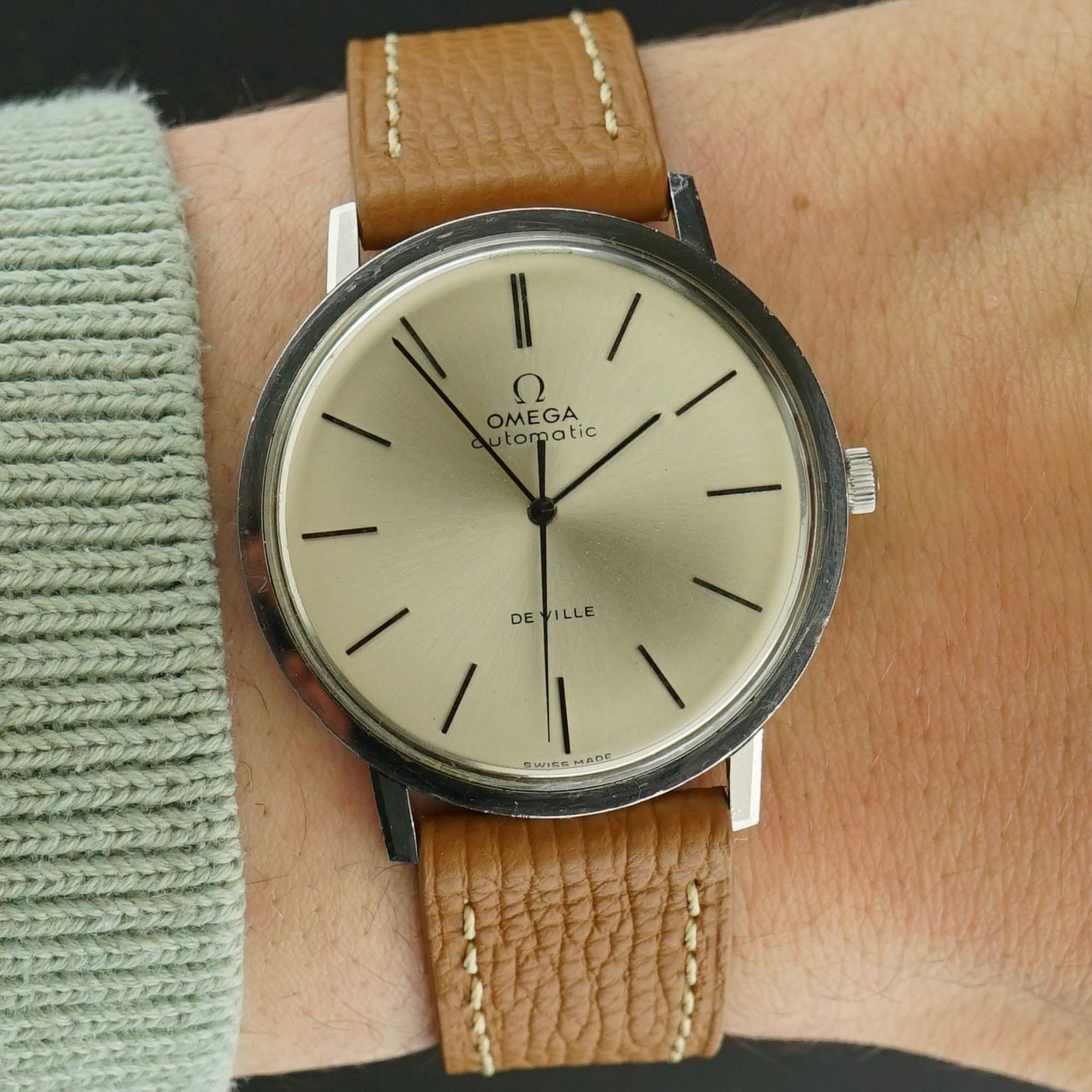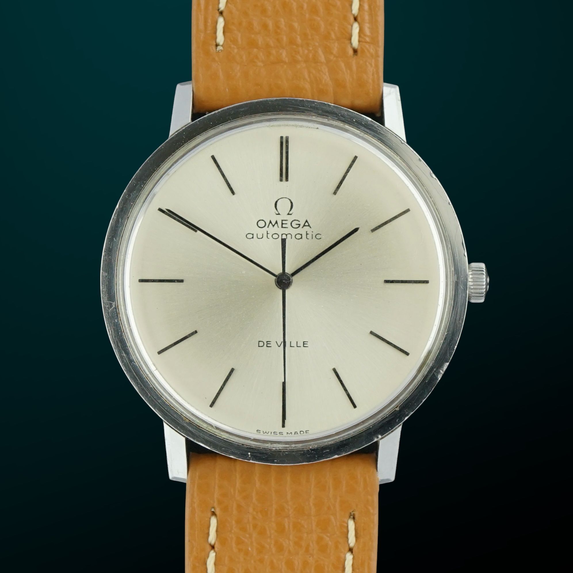 Vintage Omega De Ville from 1968 in great overall condition. It features a white sunburst dial and a 34.5mm stainless steel case that retains most of its original polish. Thanks to the thin automatic caliber 711 movement, the case measures only 7.6mm in thickness, giving it an elegant and refined profile.It comes on a brown calf leather strap and wears comfortably as both a daily watch or a classic dress piece.