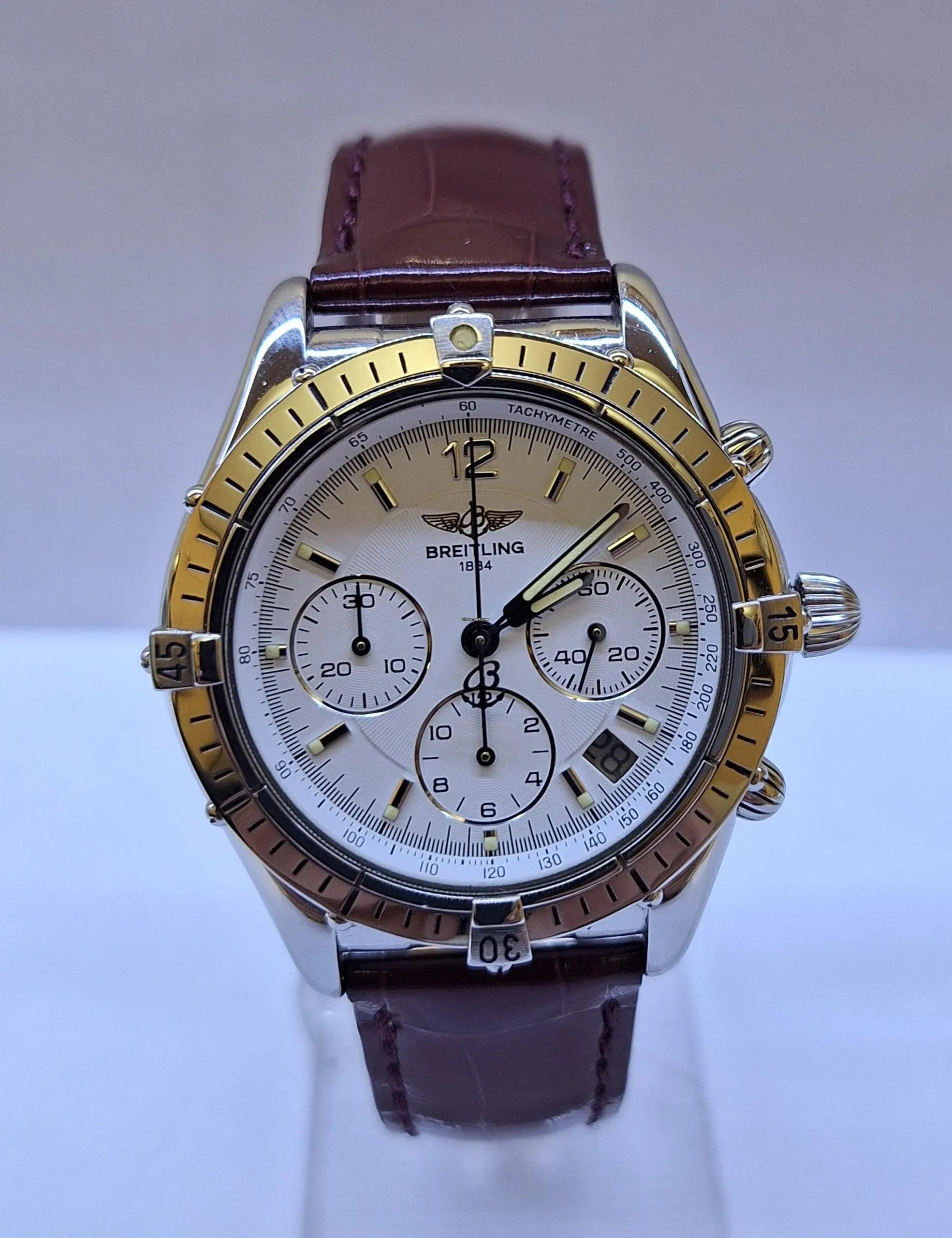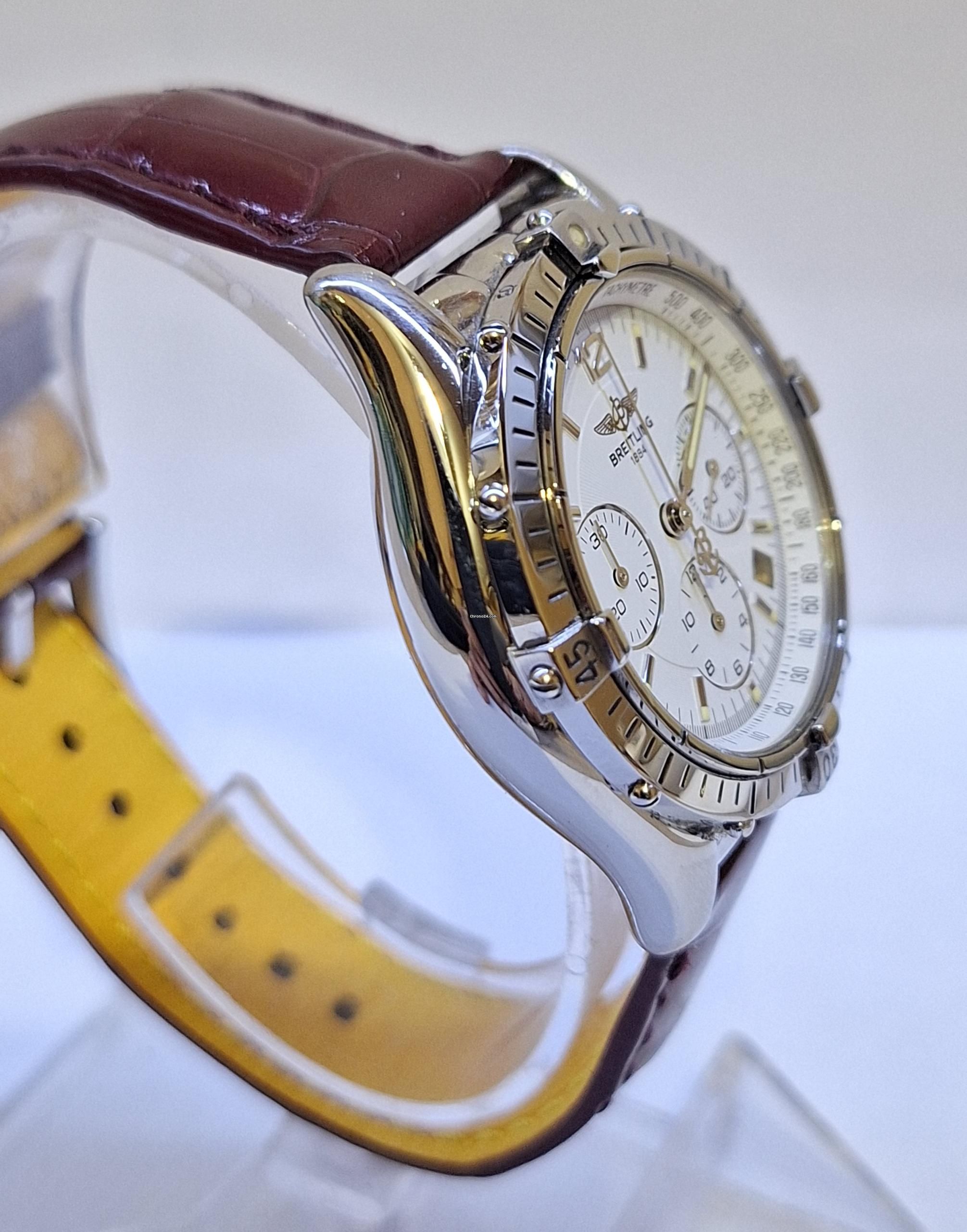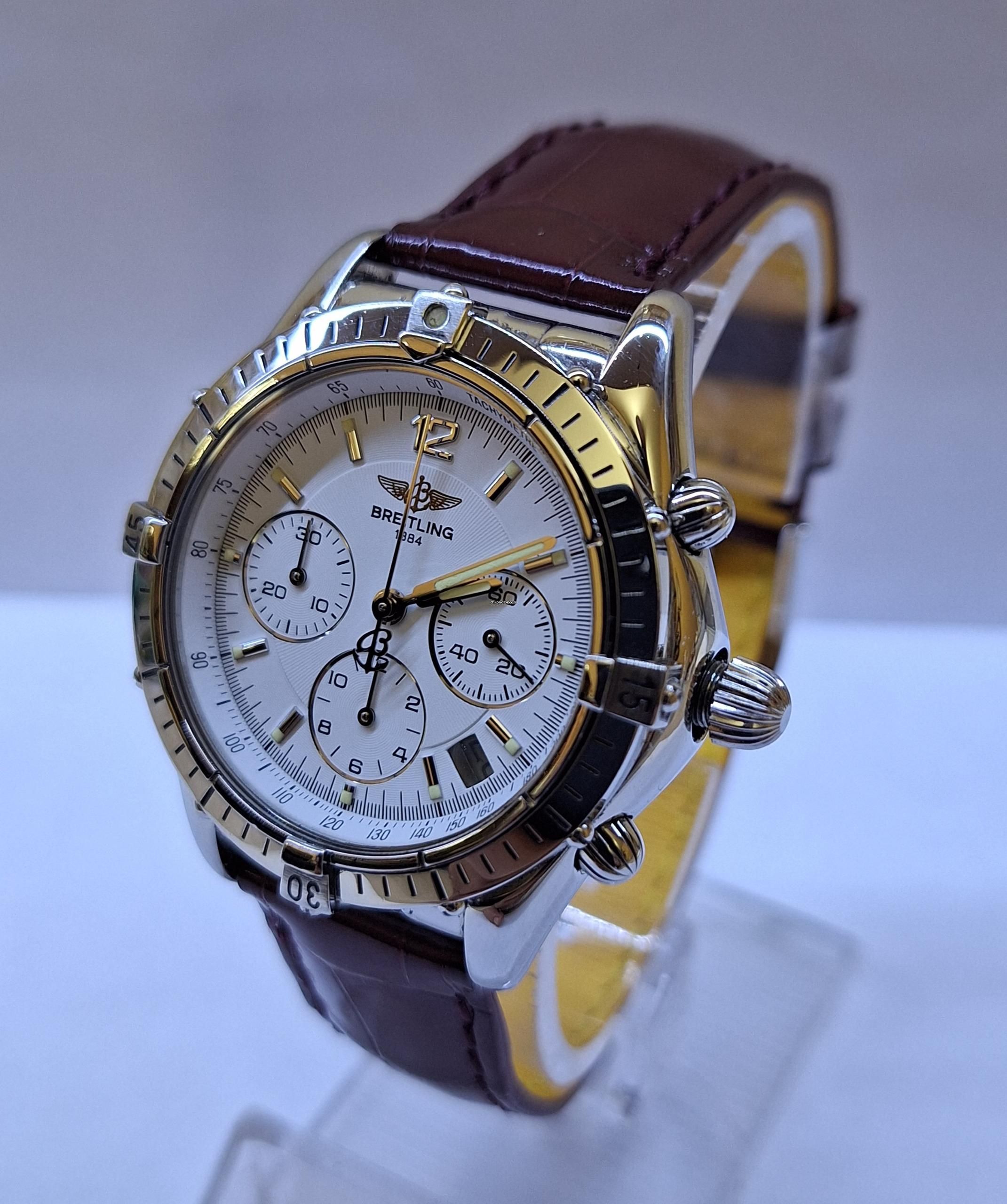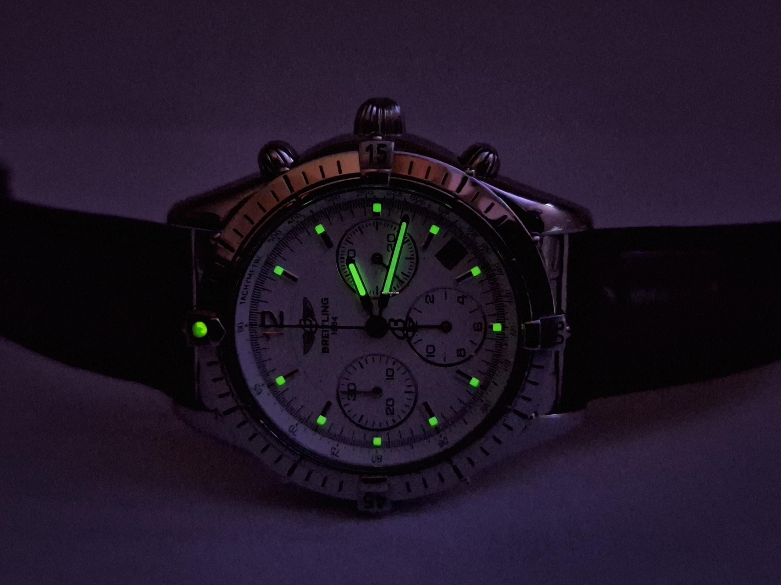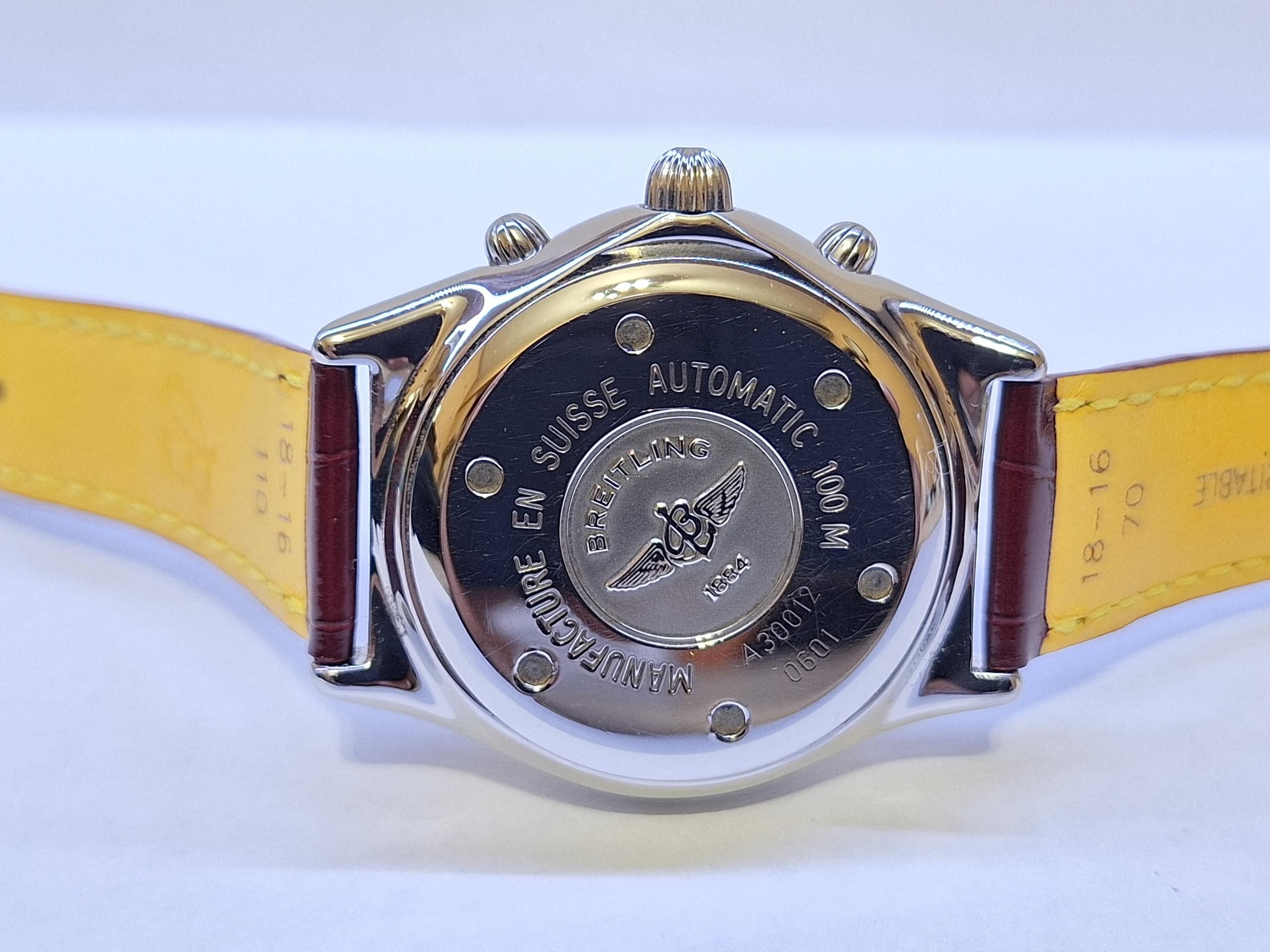 Shows date, between 3 and 4 o'clock. Massive stainless steel screw back and Breitling engraving.