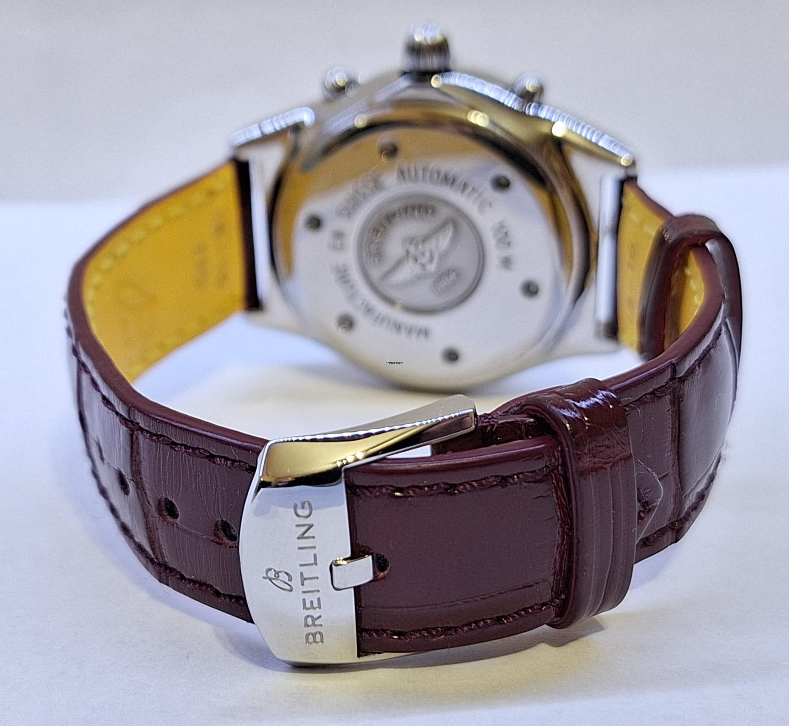 Affiche la date, entre 3 et 4 heures. Fond de boîte en acier inoxydable massif et gravure Breitling.