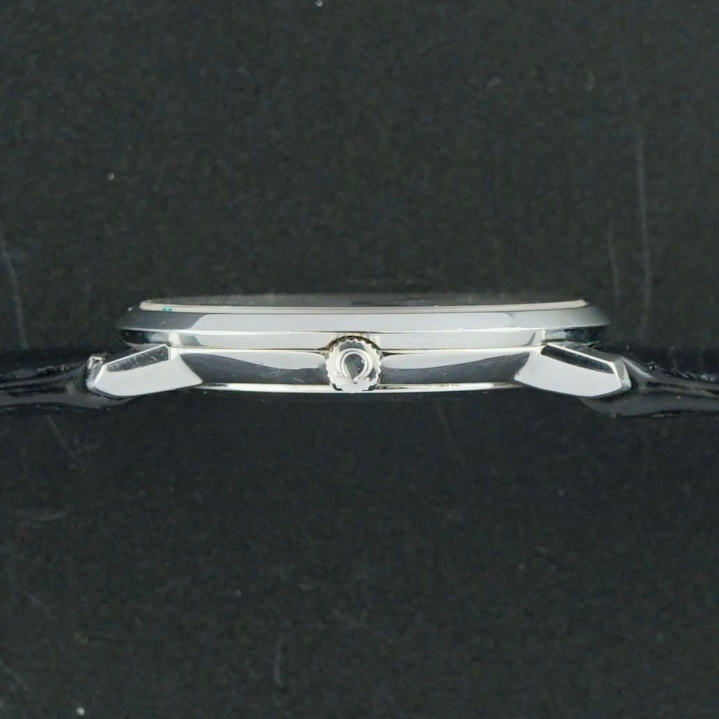 A Vintage Omega De Ville from 1973, featuring a clean white dial with Roman numerals and elegant leaf hands. The 33mm stainless steel case is in very good condition. Inside is a caliber 625 manual wind movement, serviced in April 2026, running and functioning excellently. It is paired with a black top grain leather strap with a crocodile motif. Overall condition is very good, making it a beautiful dress watch or daily wearer.Year of production: 1973