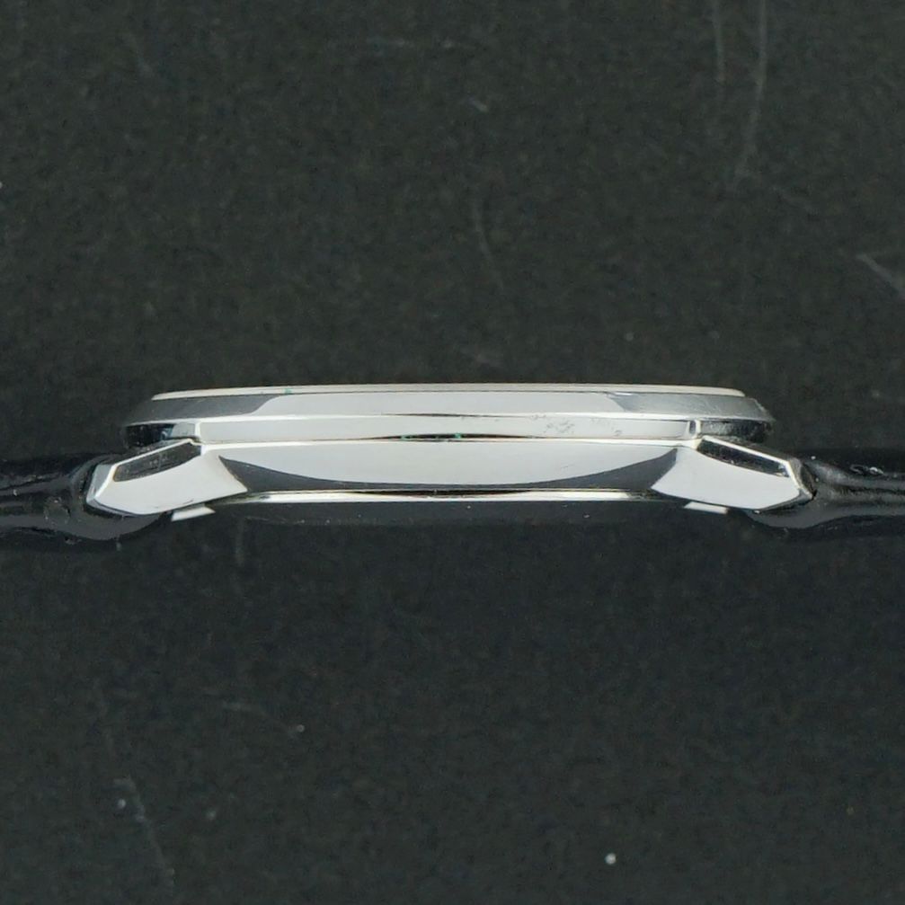Une Omega De Ville vintage de 1973, avec un cadran blanc épuré, des chiffres romains et des aiguilles en forme de feuille élégantes. Le boîtier en acier inoxydable de 33 mm est en très bon état. À l'intérieur se trouve un mouvement à remontage manuel calibre 625, révisé en avril 2026, qui fonctionne et tourne parfaitement. Il est associé à un bracelet en cuir noir de première qualité avec un motif crocodile. L'état général est très bon, ce qui en fait une belle montre habillée ou un modèle à porter au quotidien.