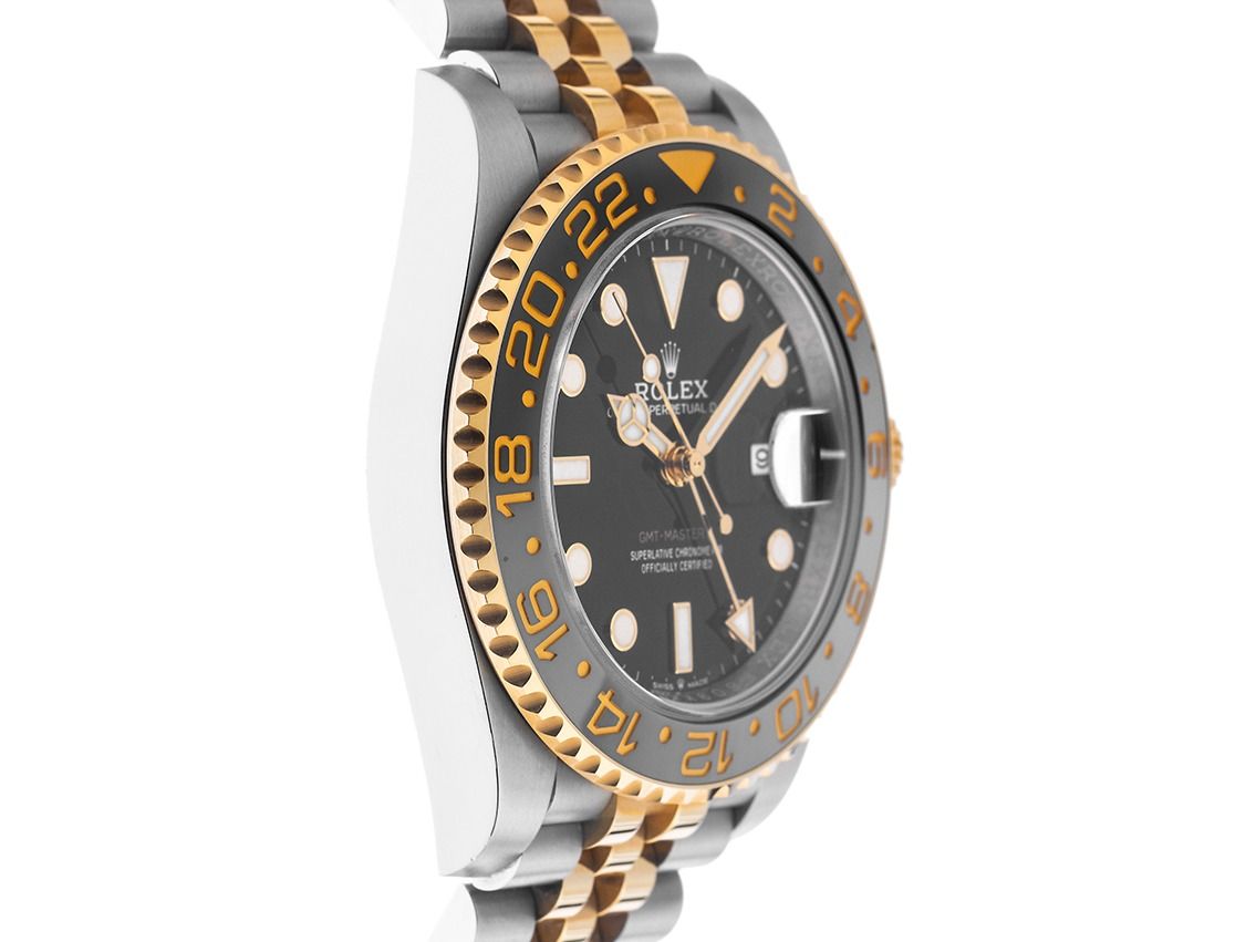 Rolex GMT Master II Stahl 18kt Gelbgold Keramik Automatik Armband JubiléGehäuse Edelstahl poliert und satiniert, Gehäusedurchmesser ohne Krone 40mm, Gehäusehöhe 12,0mm. Lünette 18kt Gelbgold gerädelt mit schwarz / grauem Keramik Inlay, graviert mit gelbgoldener 24-Stunden Skala, beidseitig drehbar. Armband Jubilé Edelstahl / 18kt Gelbgold poliert und satiniert, Sicherheitsfaltschließe Edelstahl / 18kt Gelbgold mit Hersteller-Logo. Zifferblatt schwarz mit aufgesetzten in Gelbgold gefassten Leuchtindexen und Leuchtpunkten sowie gelbgoldenen Leuchtzeigern. Uhrwerk Automatik, Chronometer mit Zeugnis, Rolex Manufakturkaliber 3285 mit 31 Edelsteinen, Gangreserve ca. 70 Stunden. Anzeige von Stunde, Minute und Sekunde über Zeiger aus der Mitte mit Sekundenstopp zur sekundengenauen Einstellung der Uhrzeit, Datumsanzeige mit Schnellverstellung unter Glaslupe bei 3 Uhr, zweite Zeitzone (GMT) ablesbar über Lünette, einstellbar über Zeiger mit Leuchtspitze aus der Mitte. Saphirglas kratzfest. Krone verschraubbar mit Flankenschutz und Hersteller-Logo. Boden Edelstahl verschraubt. Gewicht der Uhr inklusive Armband 163g, Länge des Armbandes inklusive Gehäuse 175mm. Referenznummer: 126713GRNR, ID: P2811390000426HW-23800/19250, Artikelnummer: 10000085422. Original Rolex Box mit Umkarton und Garantie Papiere von Mai 2025, neue Rolex Garantie Karte ohne Ländercode sowie Beschreibung, Ledermäppchen, Rolex Chronometer-Siegel, Erstkaufrechnung und Watchregister Auszug von April 2026, The Watch Register Zertifikat / ohne Eintrag (Internationale Datenbank für verlorene oder gestohlene Uhren), Full Set. Superschnäppchen, Kapitalanlage mit Wertsteigerungspotential, aus erster Hand. Ungetragen. Lieferzeit sofort.