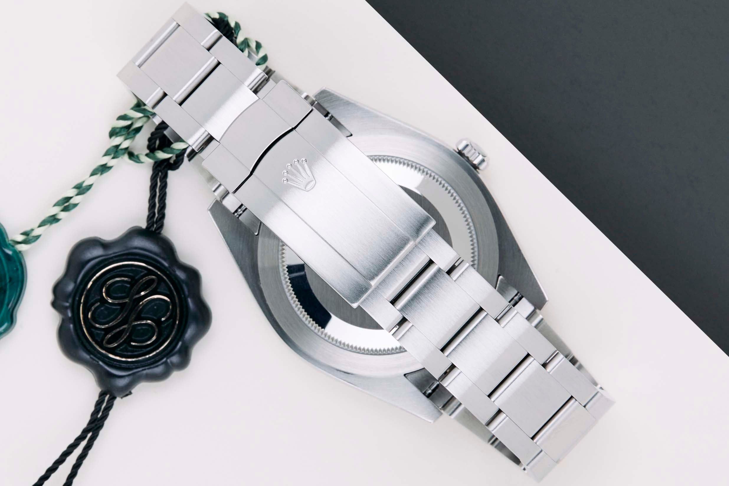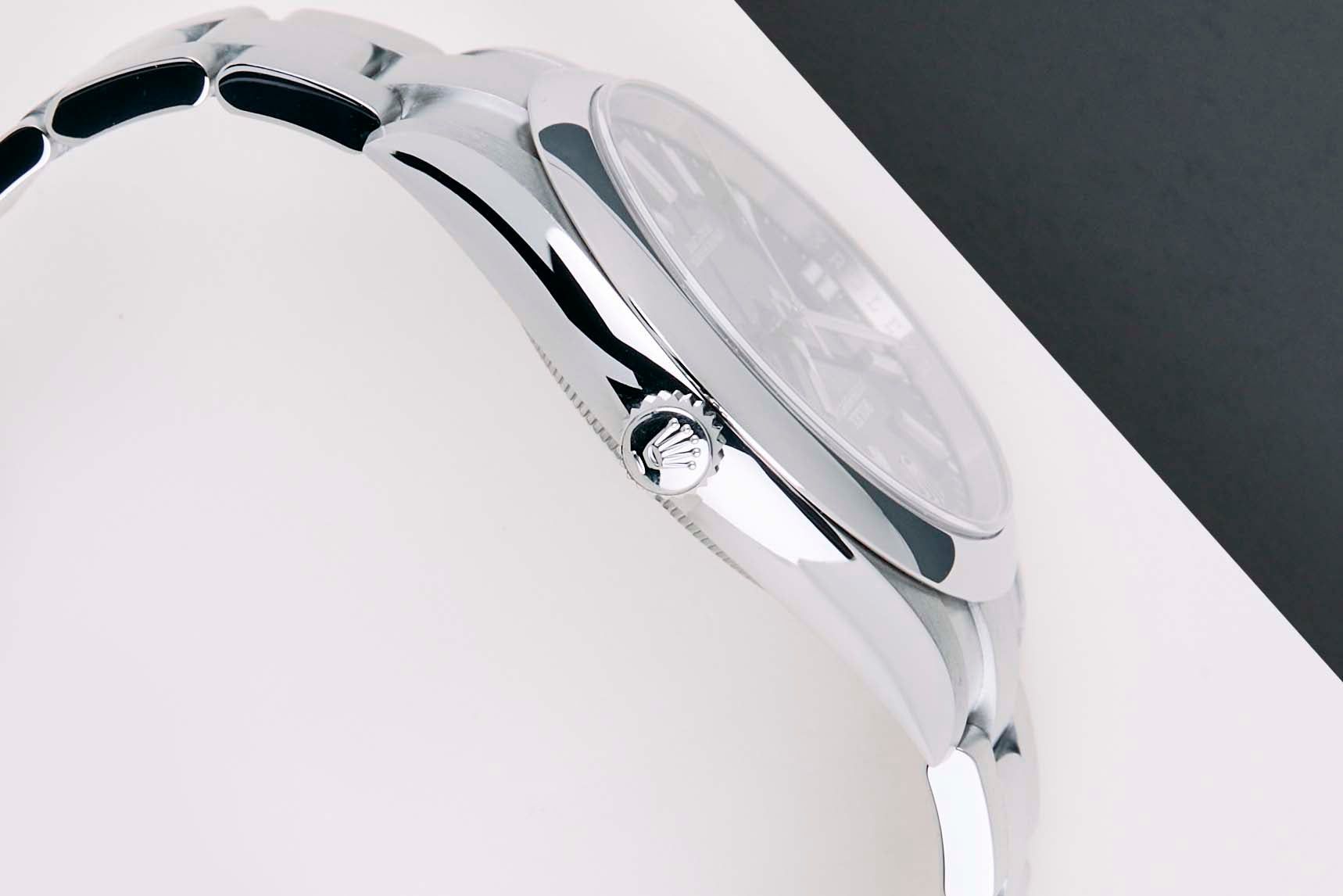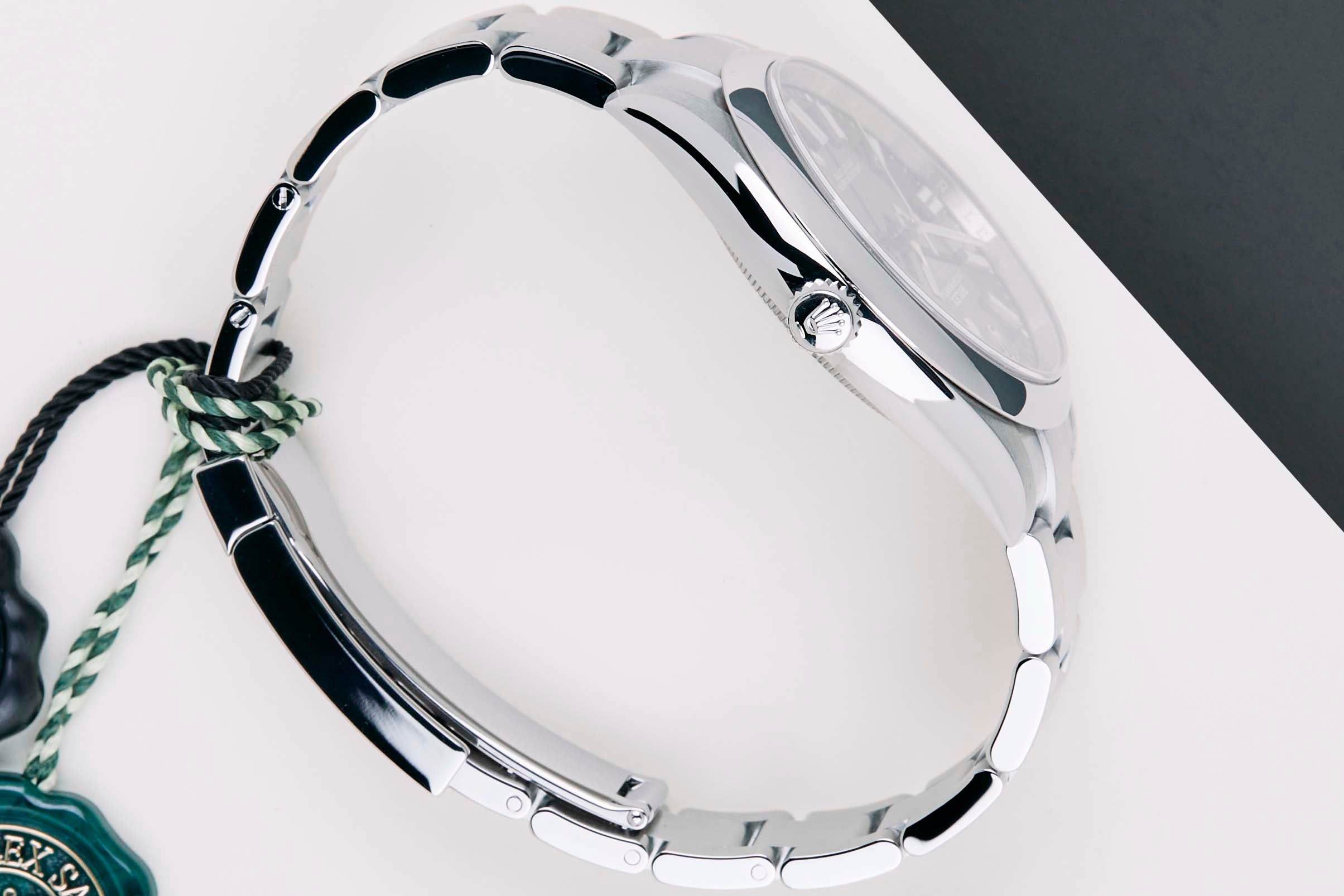 Cette Rolex Oyster Perpetual 'Cadran Noir' a été vendue pour la première fois en septembre 2021. La montre est entièrement en acier inoxydable. Rolex utilise de l'acier 904L dans ses montres en acier, qui est un superalliage extrêmement résistant et hautement poli.