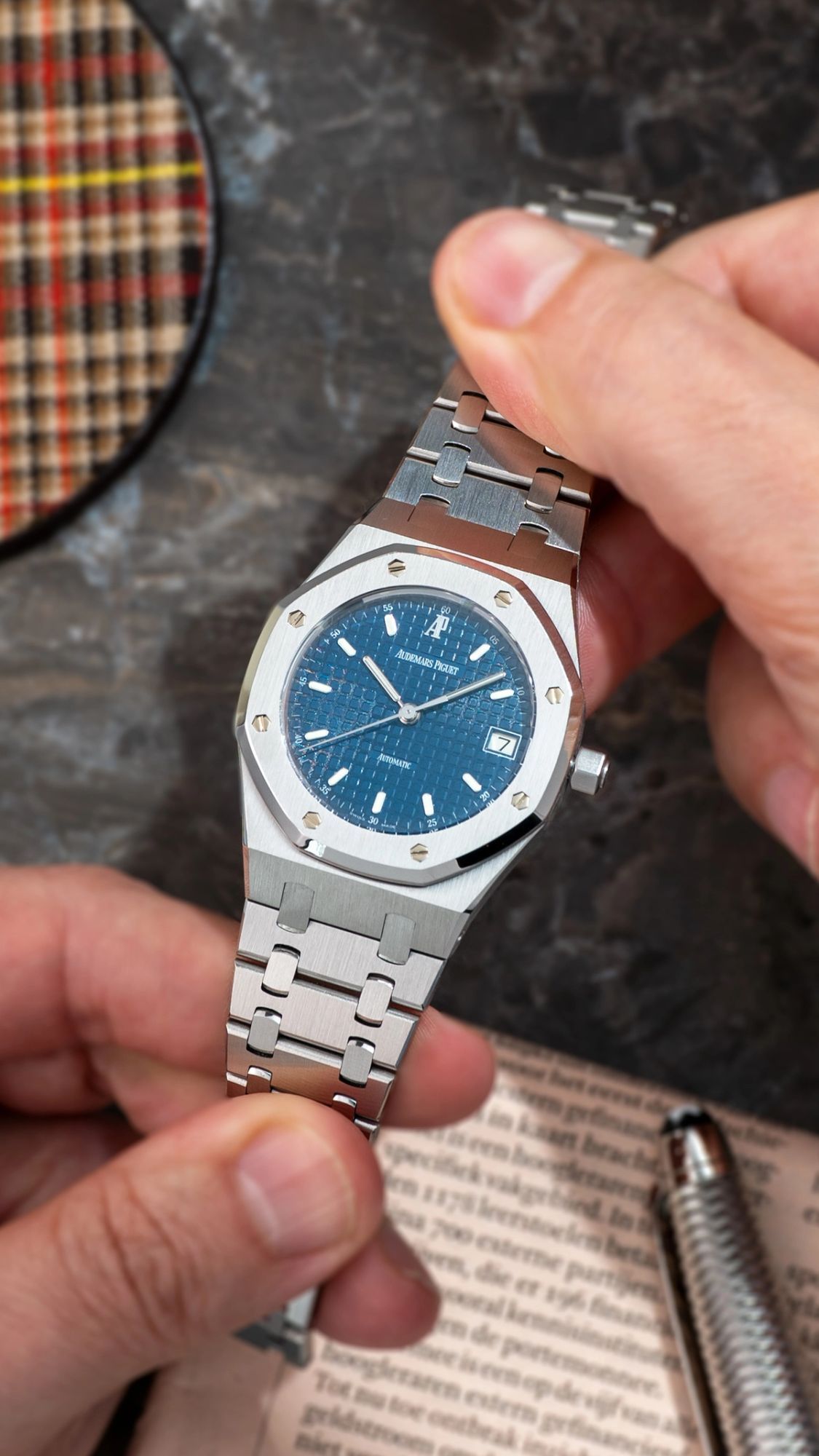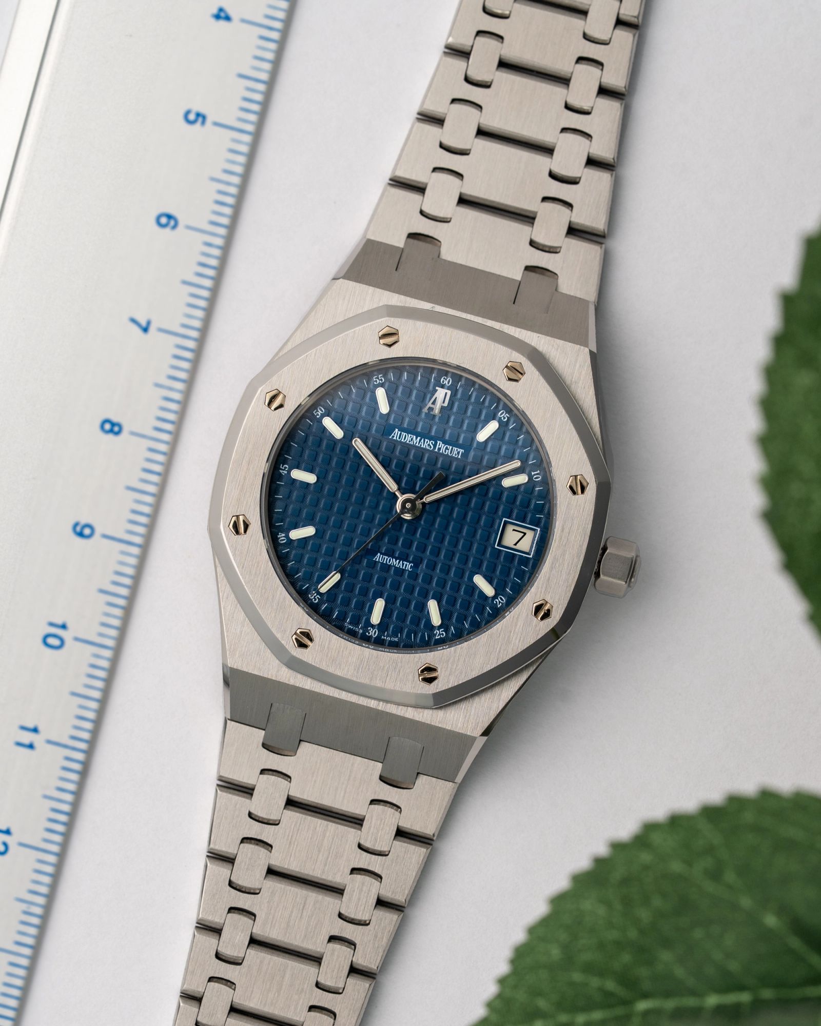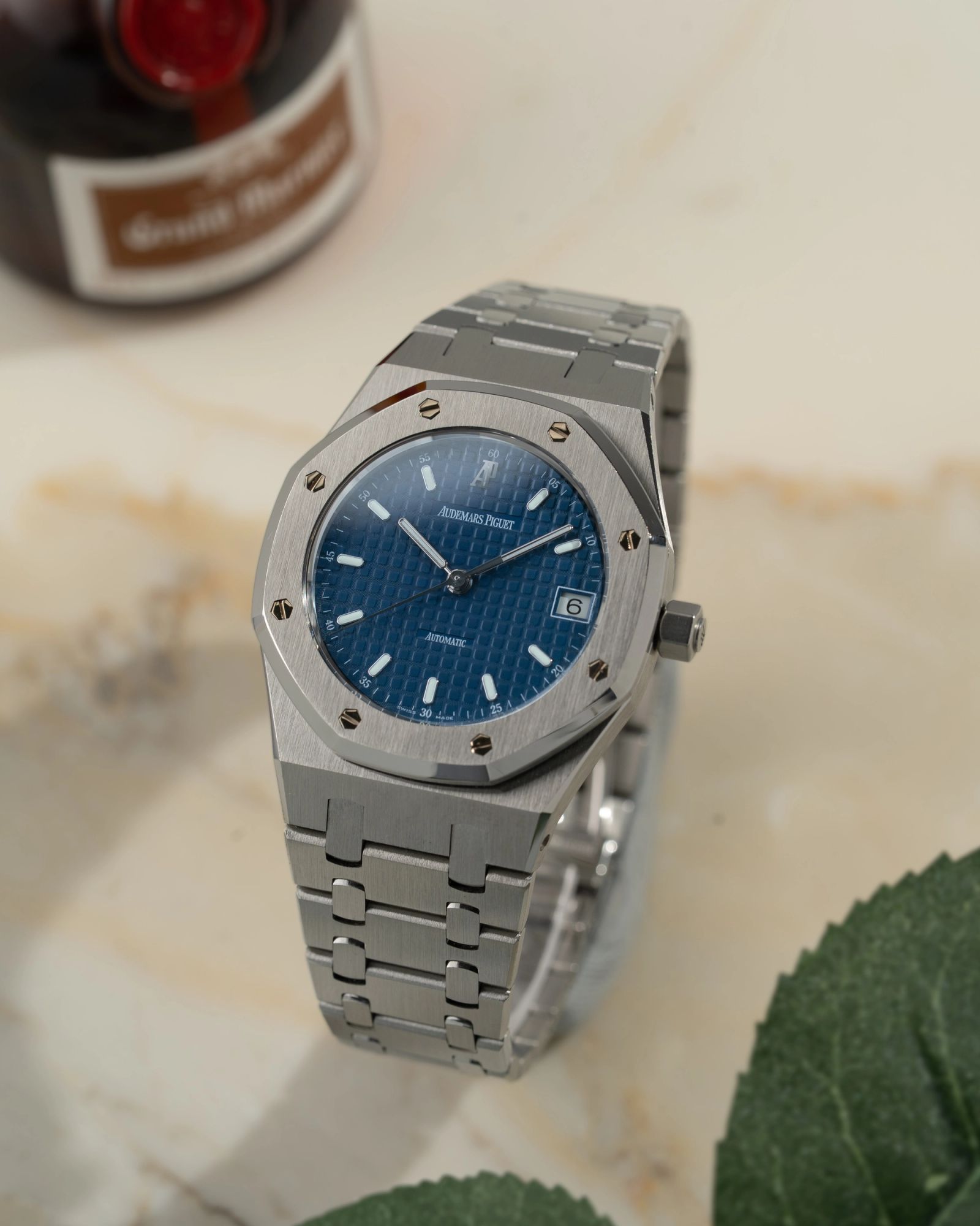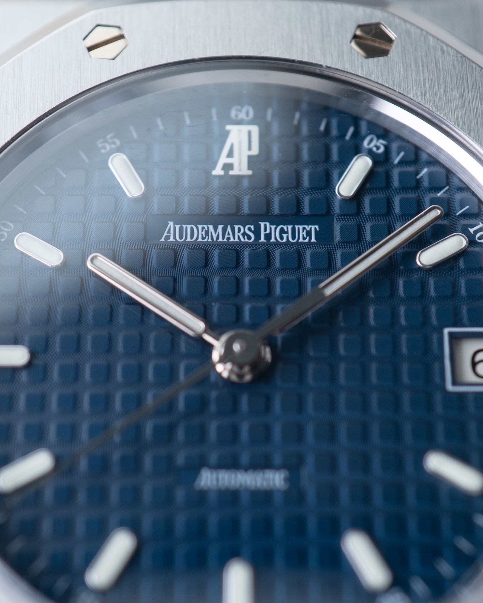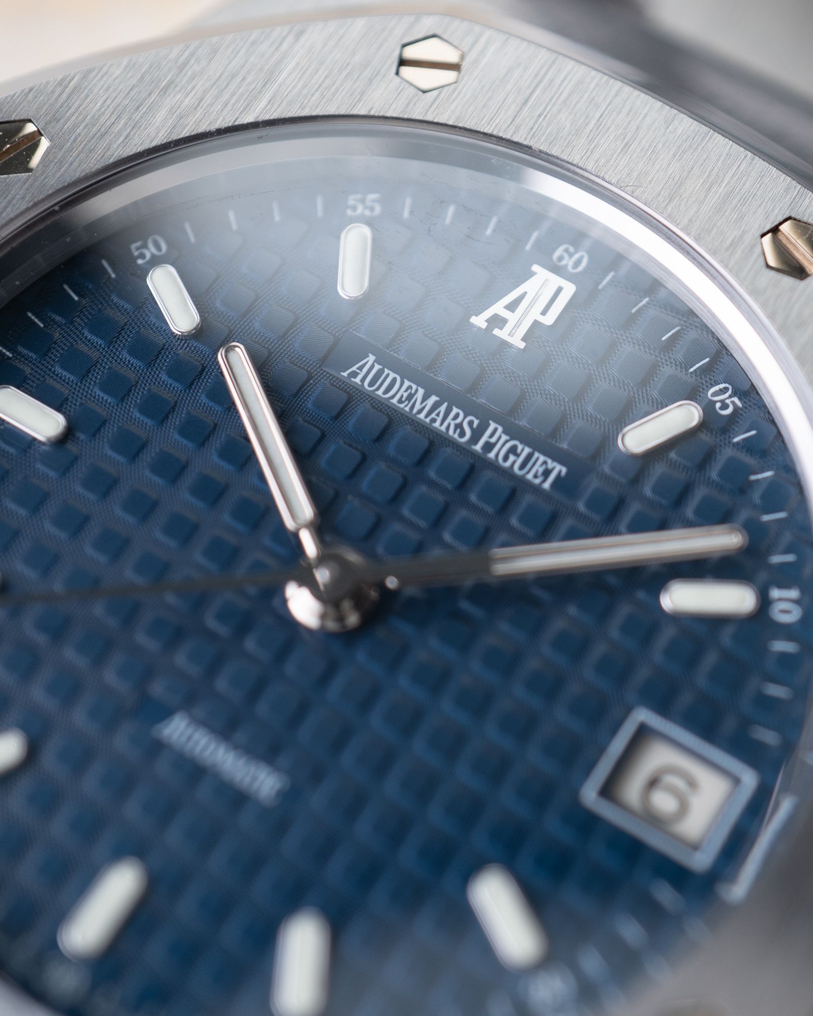 This watch, is a late version of the third E-series of ref. 14790ST, recognisable by the fantastic “Cosmos Blue” dial, the window around the date at 3 o’clock and the modern “Audemars Piguet” font on the dial and the capitalised A and P logo.