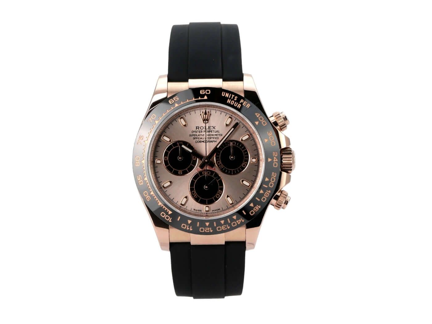 Rolex Cosmograph Daytona 18 kt Everose Gold / Oysterflex Ref. 116515LN SundustCase made of polished and satin-finished 18 kt Everose Gold, case diameter 40 mm, ceramic bezel with tachymeter, black Oysterflex strap with folding clasp, Sundust dial with luminous indices, black subdials, luminous hands, automatic movement, Rolex manufacture caliber 4130 with 44 jewels, frequency 28,800 vibrations per hour, chronometer, small seconds display at 6 o’clock, scratch-resistant sapphire crystal, screw-down 18 kt Everose Gold crown with crown guards, screw-down case back in 18 kt Everose Gold, water-resistant up to 10 bar.