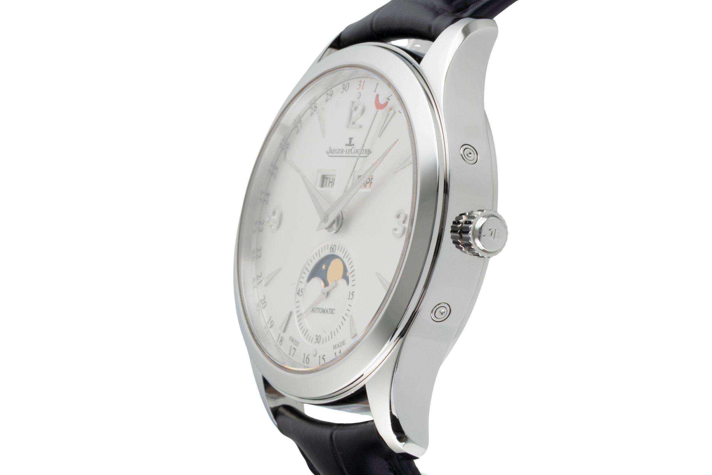 Alternative title: Jaeger-LeCoultre Q1558420 Master Calendar Stainless Steel / Silver / Alligator; Jaeger-LeCoultre Master Calendar Automatik Stahl Ref Q1558420 176.8.12.S Papers [2601777]