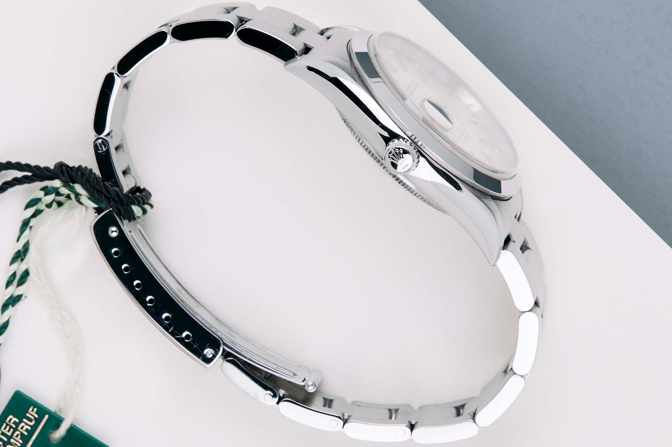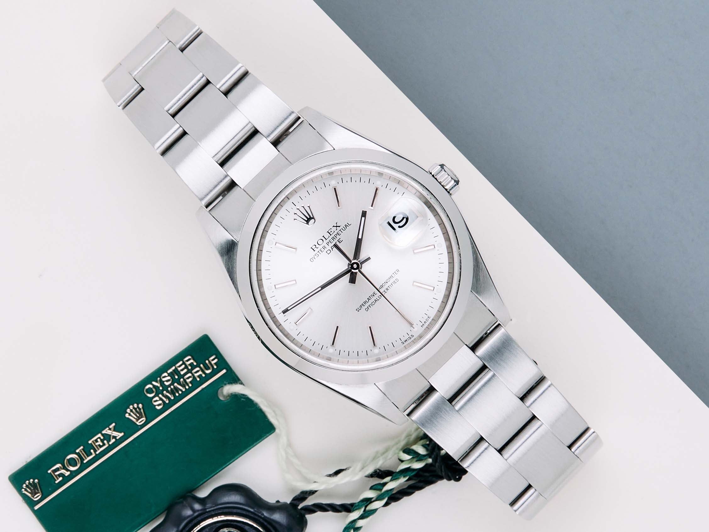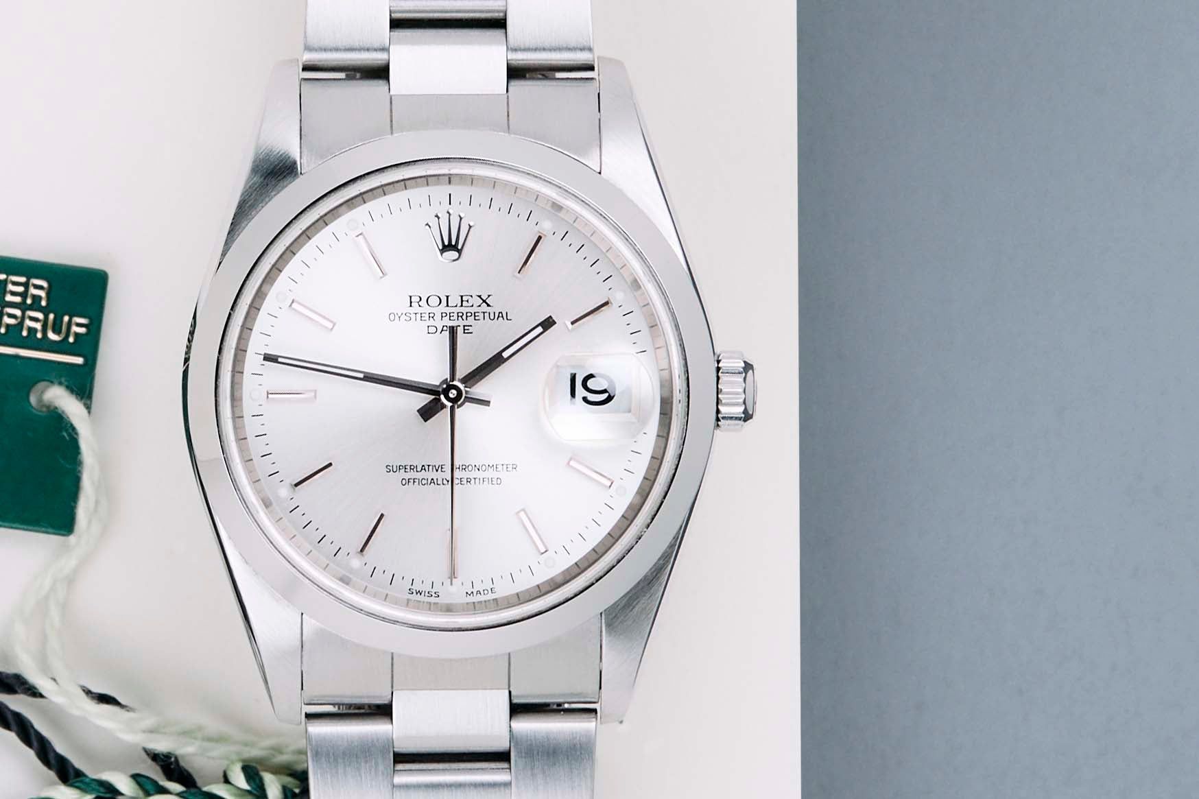Full Set | Including Rolex Green TagThe Rolex Date was introduced in the 1950s as the slightly smaller and more utilitarian brother of the iconic Datejust.This Rolex Date 34 'Silver Dial' was sold for the first time in June 2006.This Rolex Date features a stainless steel case with a diameter of 34mm, a Silver dial with 18ct. White Gold hour markers and hands, and a stainless steel bracelet with a folding clasp. This generation of Date is known for its reliability and accuracy, as well as its timeless design.This Rolex Oyster Perpetual Date is in Mint condition and comes with the original Rolex Warranty Papers and Box. Furthermore, the watch has been serviced by our watchmaker, and therefore it comes with One Year of Steiner Warranty.