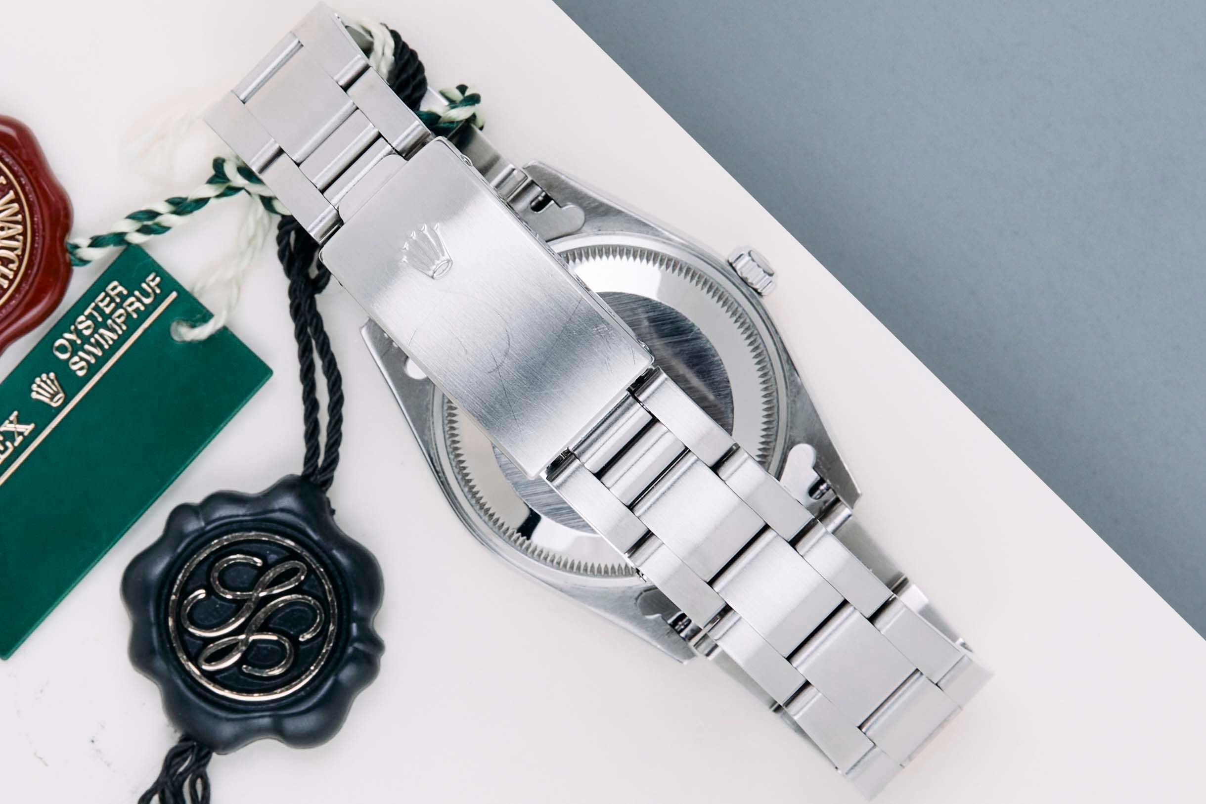 Cette Rolex Oyster Perpetual Date est en excellent état et est livrée avec les documents de garantie Rolex d'origine et sa boîte. De plus, la montre a été révisée par notre horloger, et elle est donc accompagnée d'une garantie Steiner d'un an.