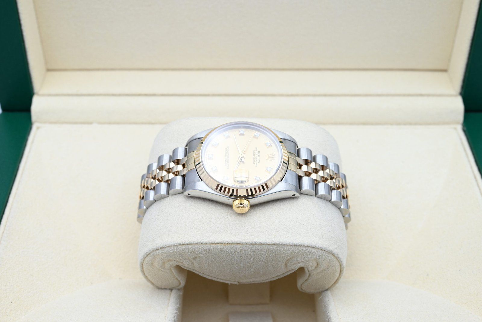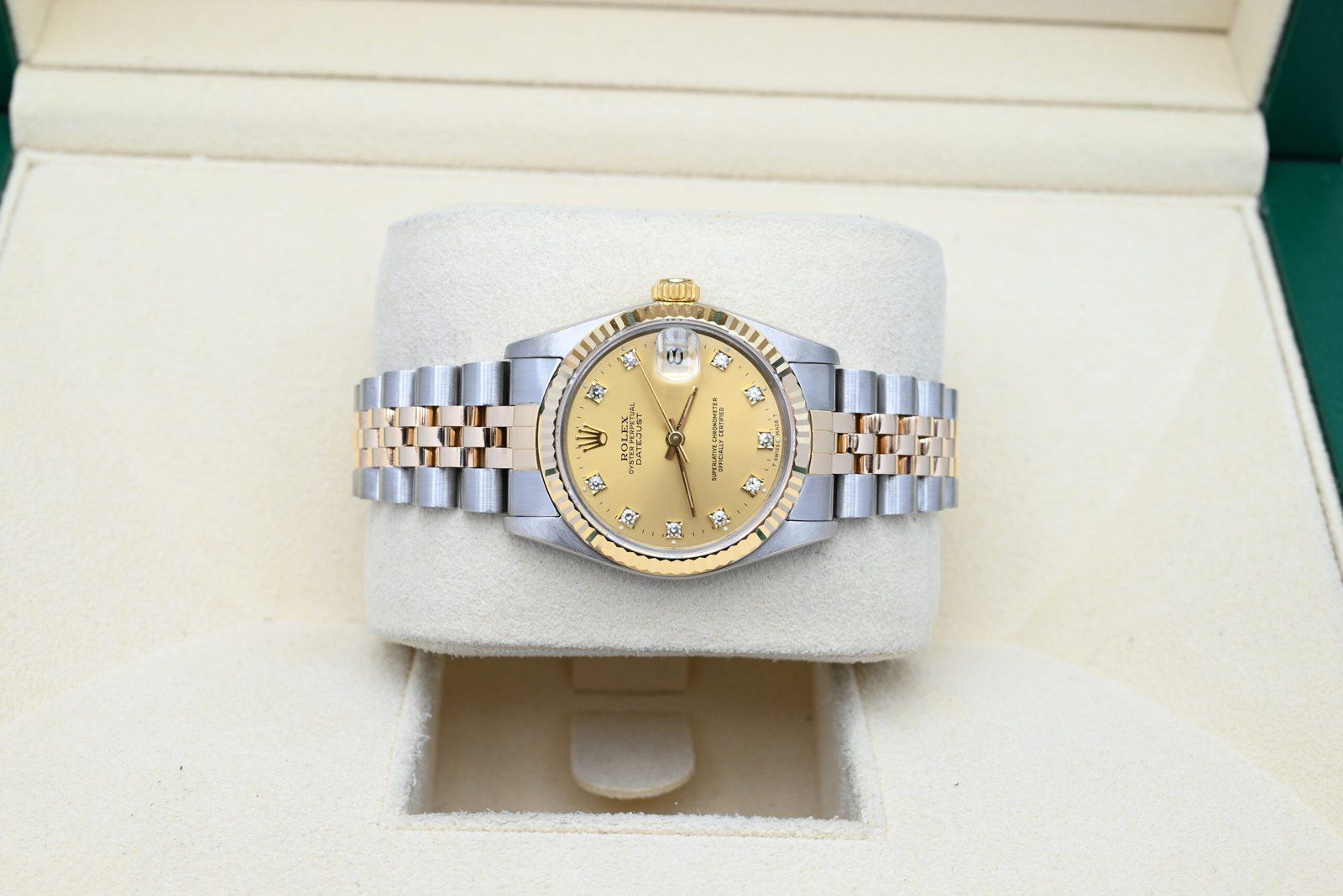Rolex Datejust 68273 from 1990 with the champagne diamond dial in excellent condition, including the original box and papers. All of our watches have been thoroughly checked by our own watchmaker and serviced when needed.
