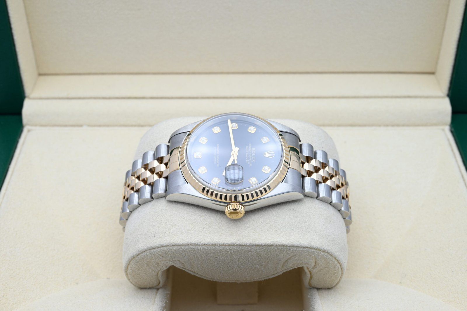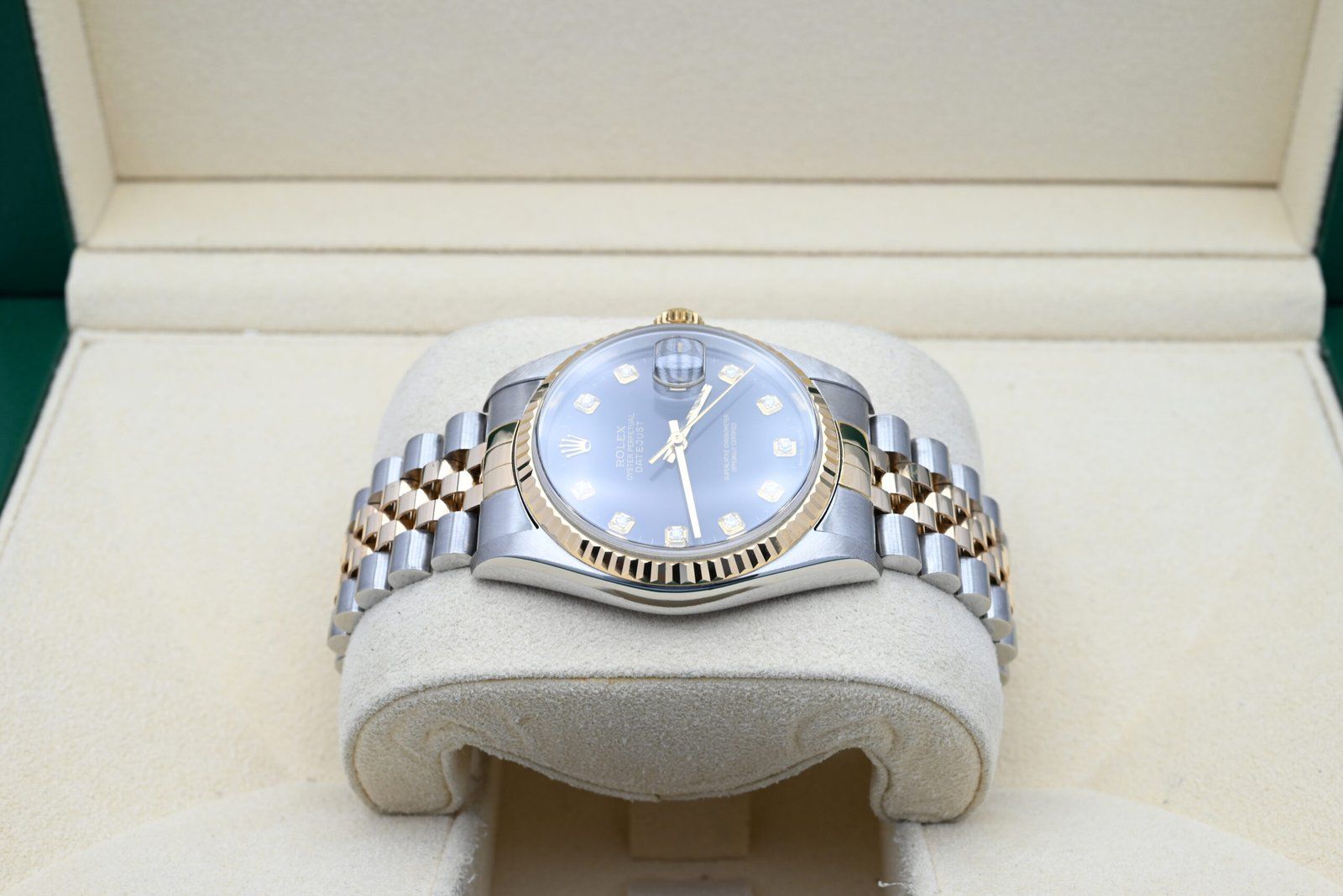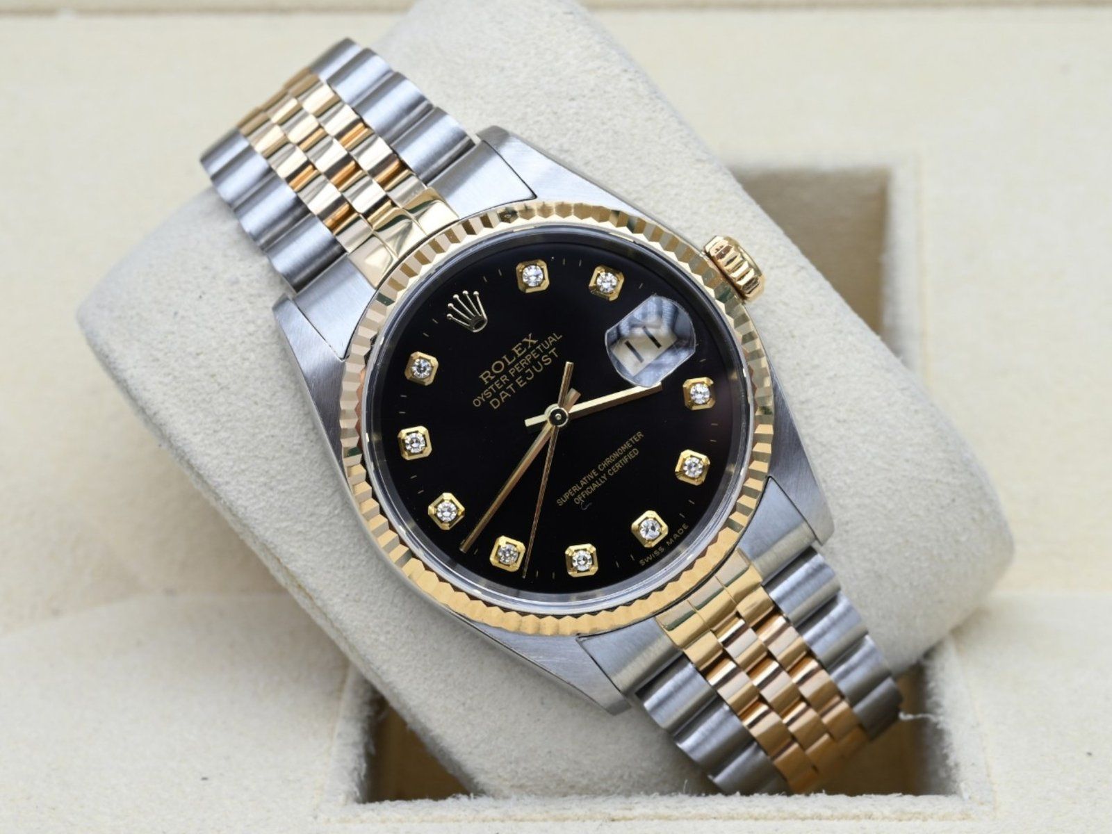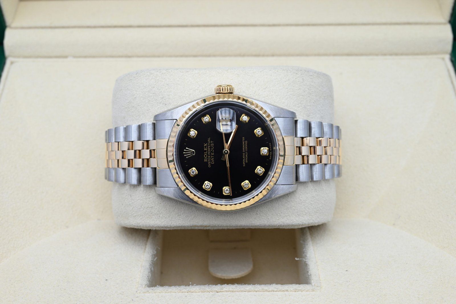 Rolex Datejust Réf. 16233 de 2002 avec le cadran noir en diamant en excellent état, incluant la boîte et les papiers d'origine. Tous nos montres ont été soigneusement vérifiées par notre propre horloger et entretenues si nécessaire.