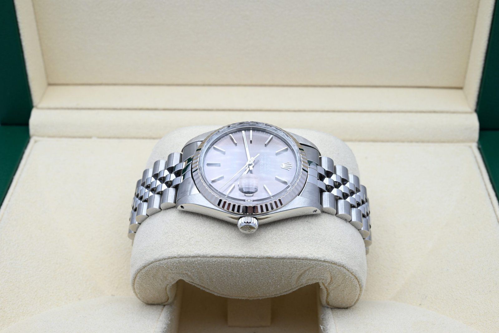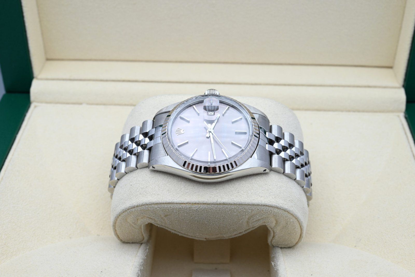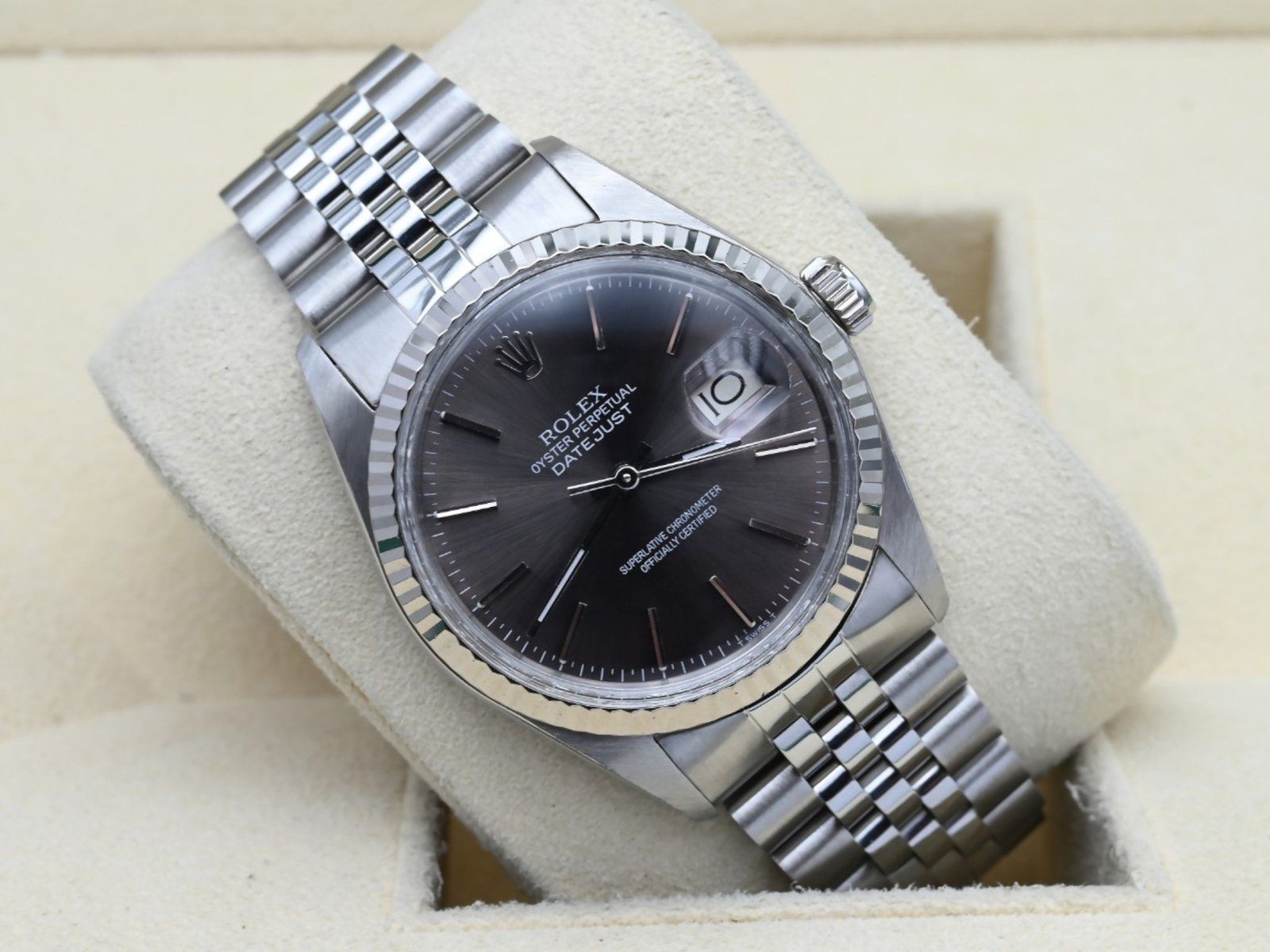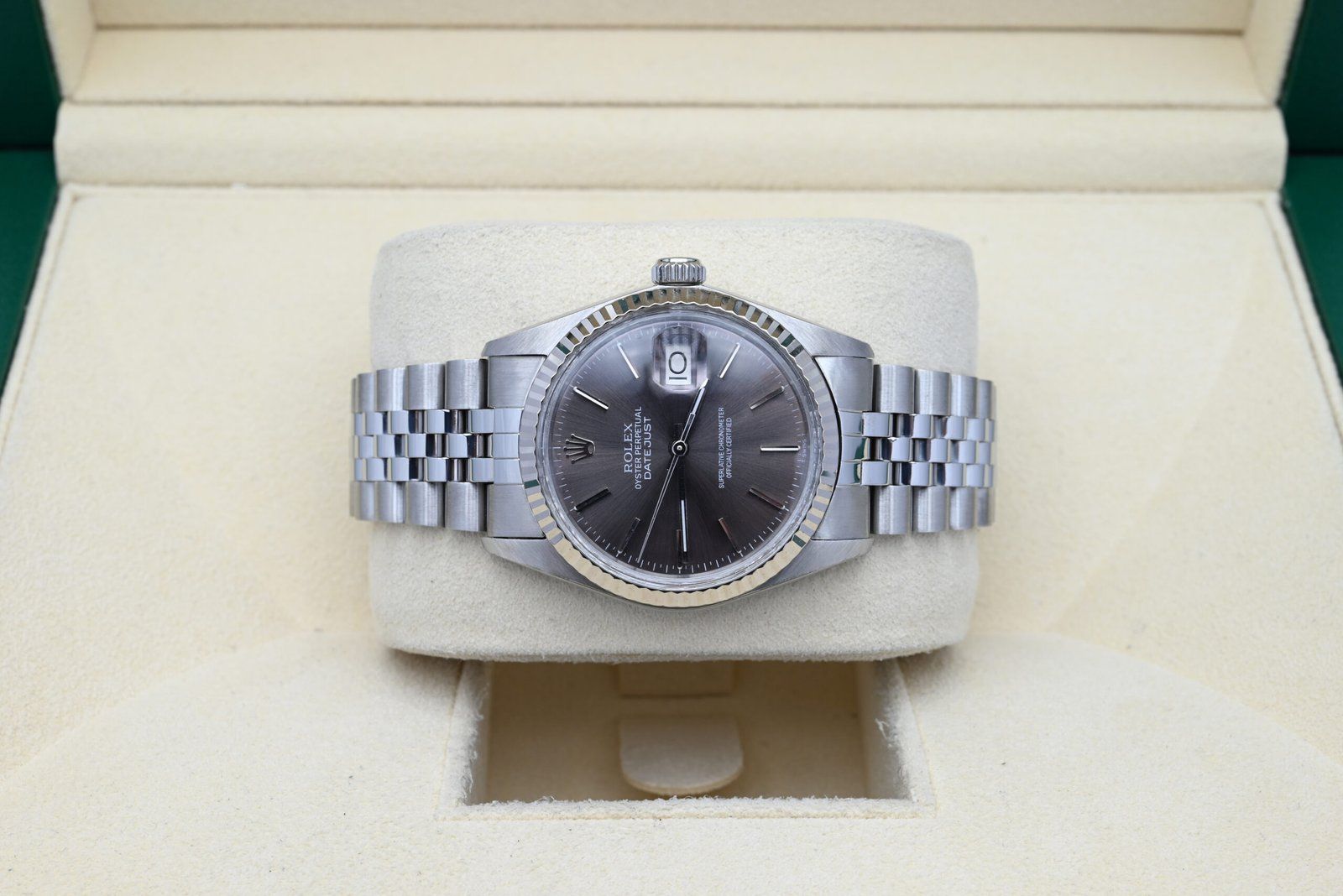 Rolex Datejust Ref. 16014 from 1982 with the grey dial in excellent condition, including the original box and papers. All of our watches have been thoroughly checked by our own watchmaker and serviced when needed.
