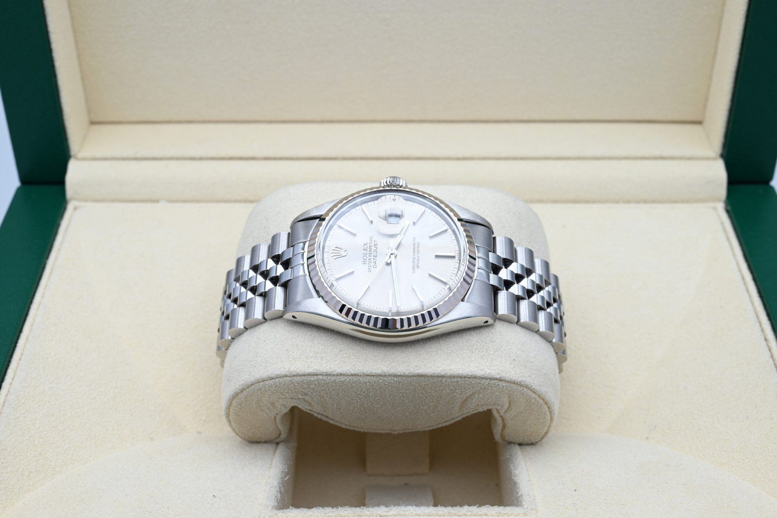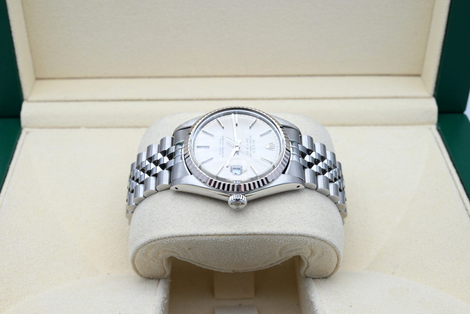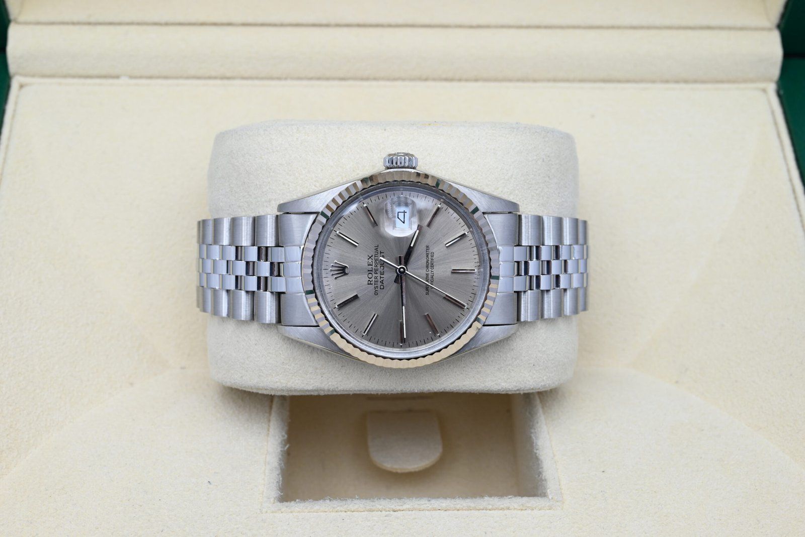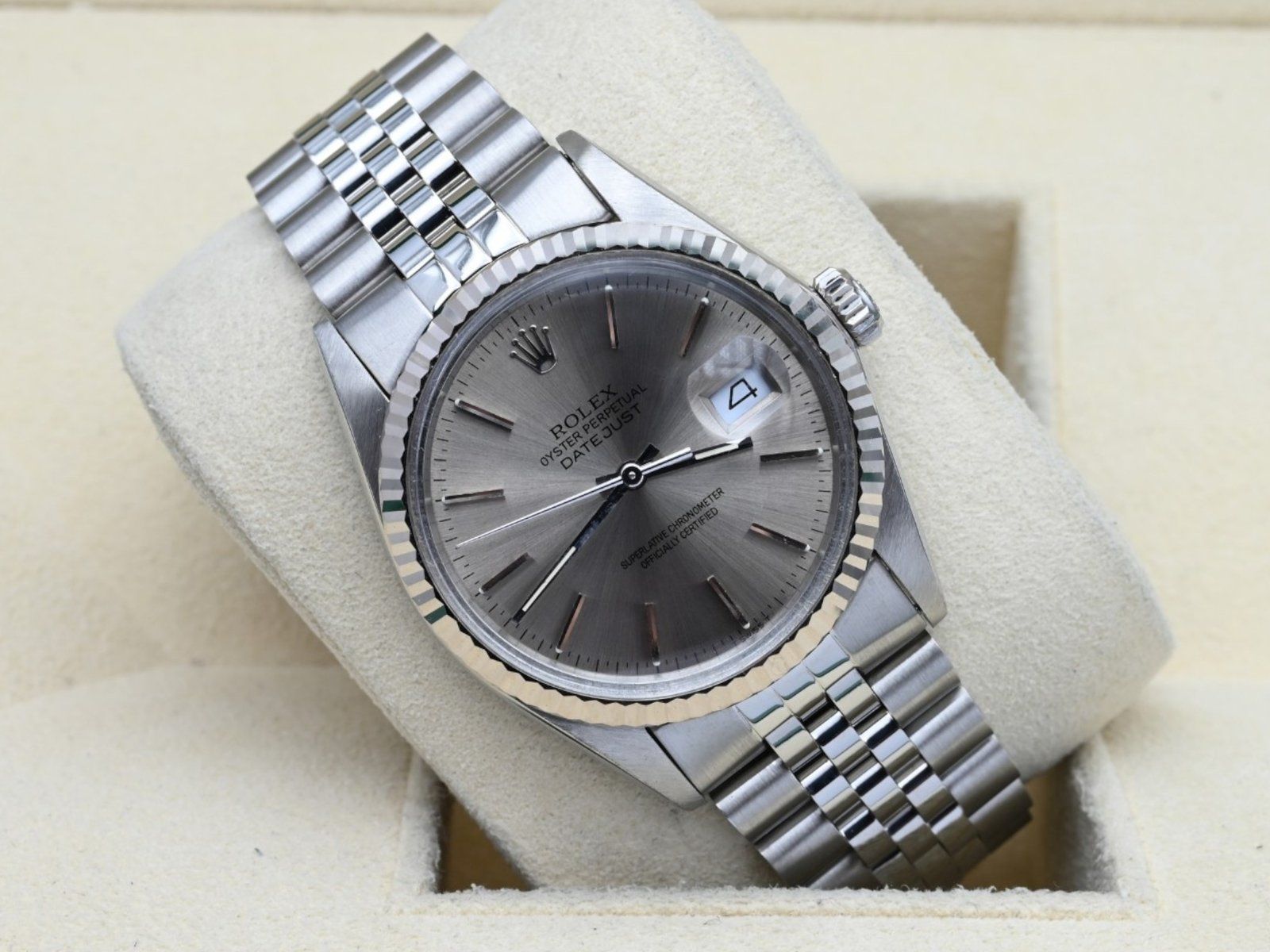 Rolex Datejust Ref. 16014 from 1982 with the grey dial in excellent condition, including the original box and papers. All of our watches have been thoroughly checked by our own watchmaker and serviced when needed.
