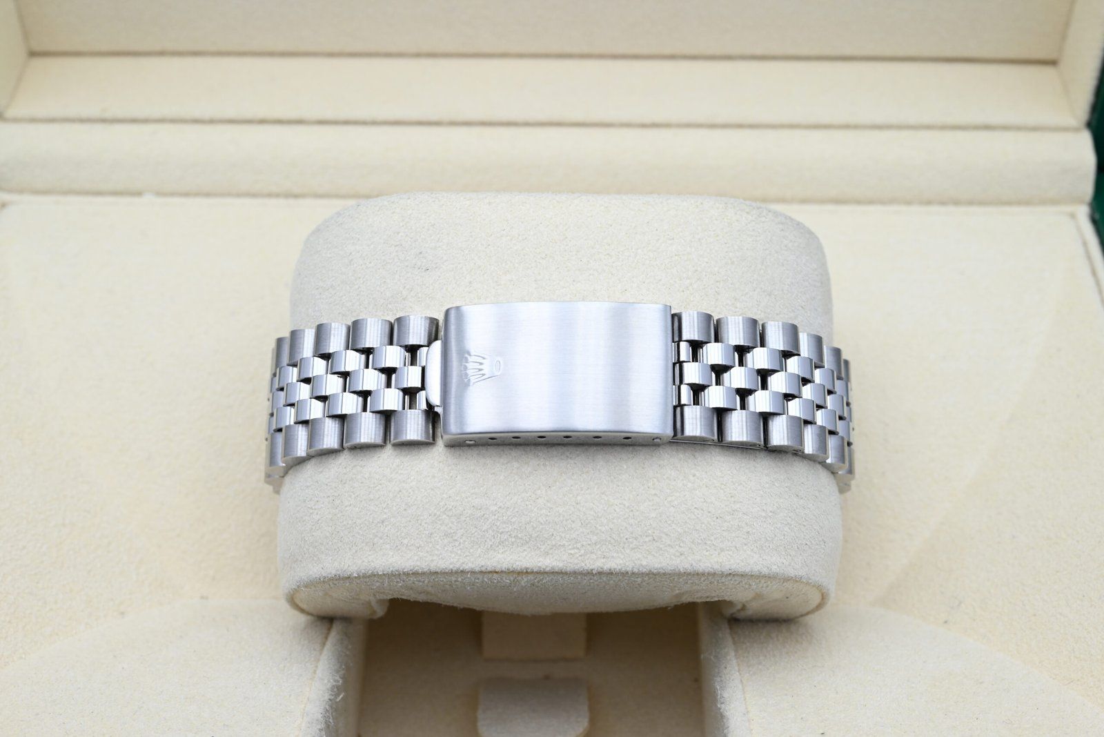 Légères traces d’usure telles que de fines rayures ou micro-rayures. Le boîtier, la lunette et le bracelet conservent leurs arêtes nettes et leur forme générale. Peut avoir été poli professionnellement sans altérer les contours d’origine. Entièrement fonctionnelle mécaniquement.
