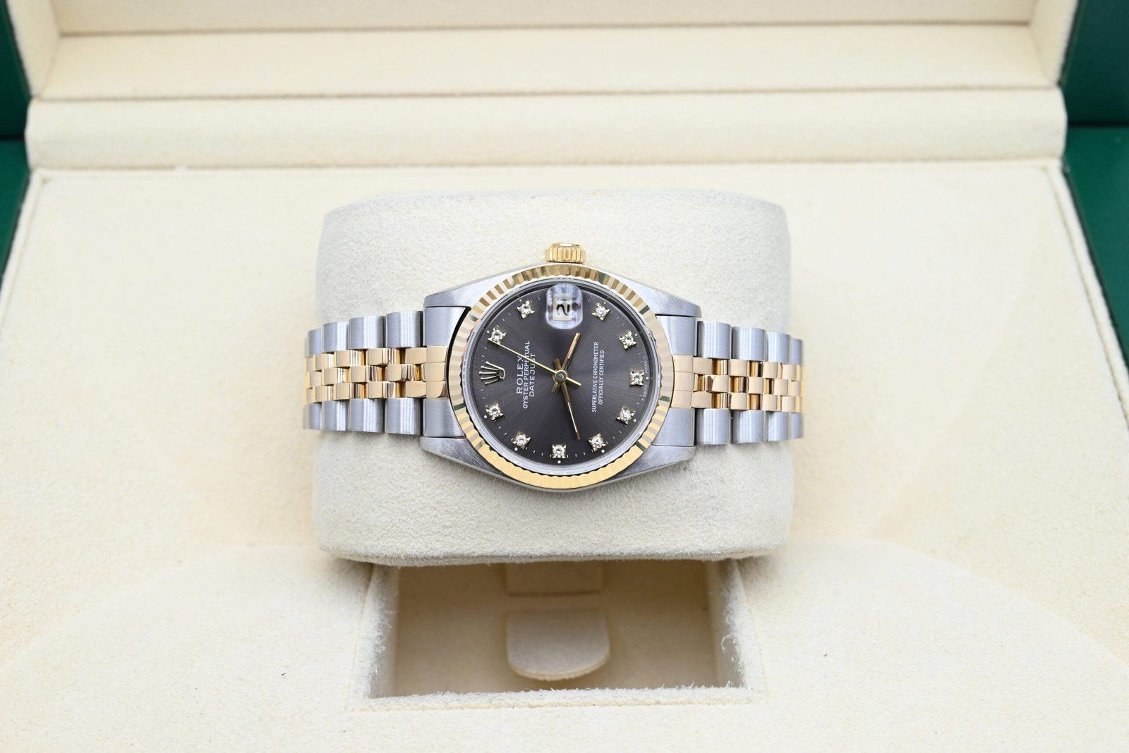 Rolex Datejust Ref. 68273 from 1994 with the grey diamond dial in excellent condition, including the original box and papers. All of our watches have been thoroughly checked by our own watchmaker and serviced when needed.