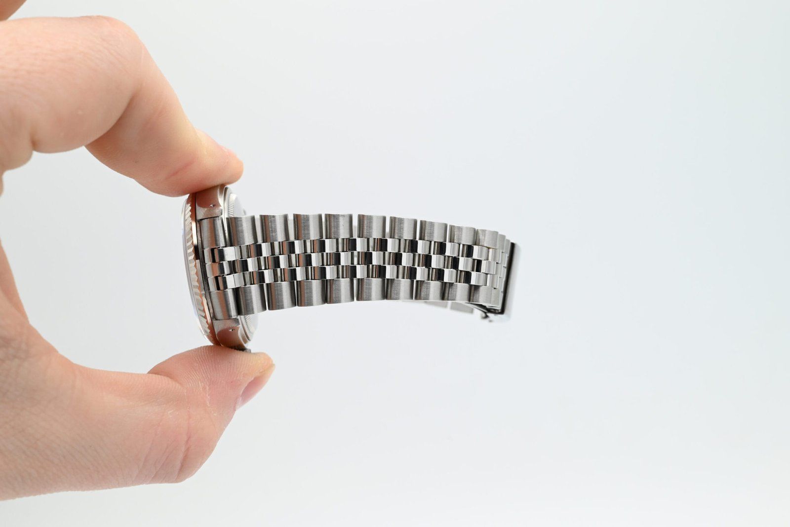 - Légères traces d’usure telles que de fines rayures ou micro-rayures. Le boîtier, la lunette et le bracelet conservent leurs arêtes nettes et leur forme générale. Peut avoir été poli professionnellement sans altérer les contours d’origine. Entièrement fonctionnelle mécaniquement.