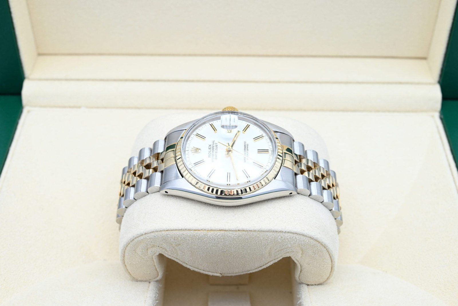 Rolex Datejust 16013 from 1988 with the silver dial in excellent condition, including the original box and papers. All of our watches have been thoroughly checked by our own watchmaker and serviced when needed.