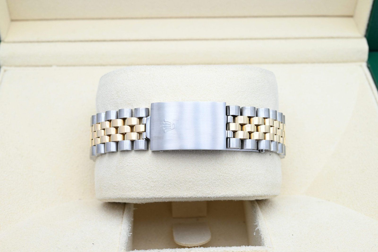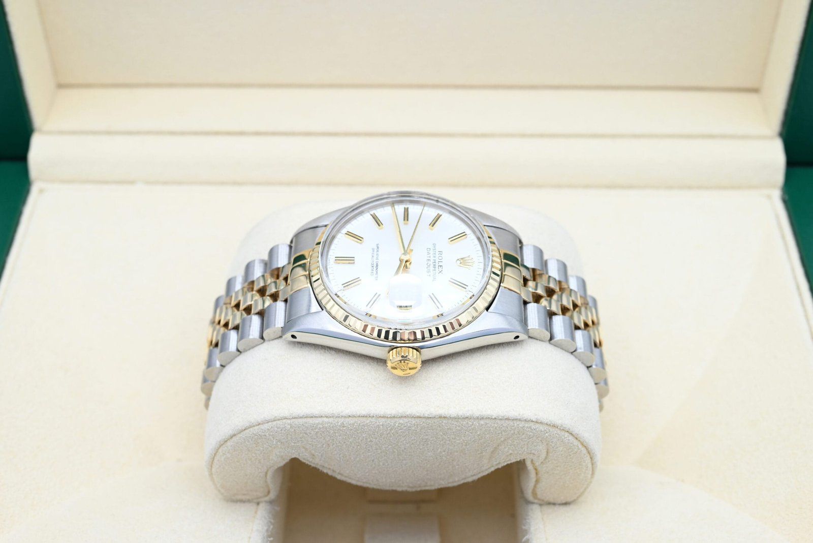 - Légères traces d’usure telles que de fines rayures ou micro-rayures. Le boîtier, la lunette et le bracelet conservent leurs arêtes nettes et leur forme générale. Peut avoir été poli professionnellement sans altérer les contours d’origine. Entièrement fonctionnelle mécaniquement.