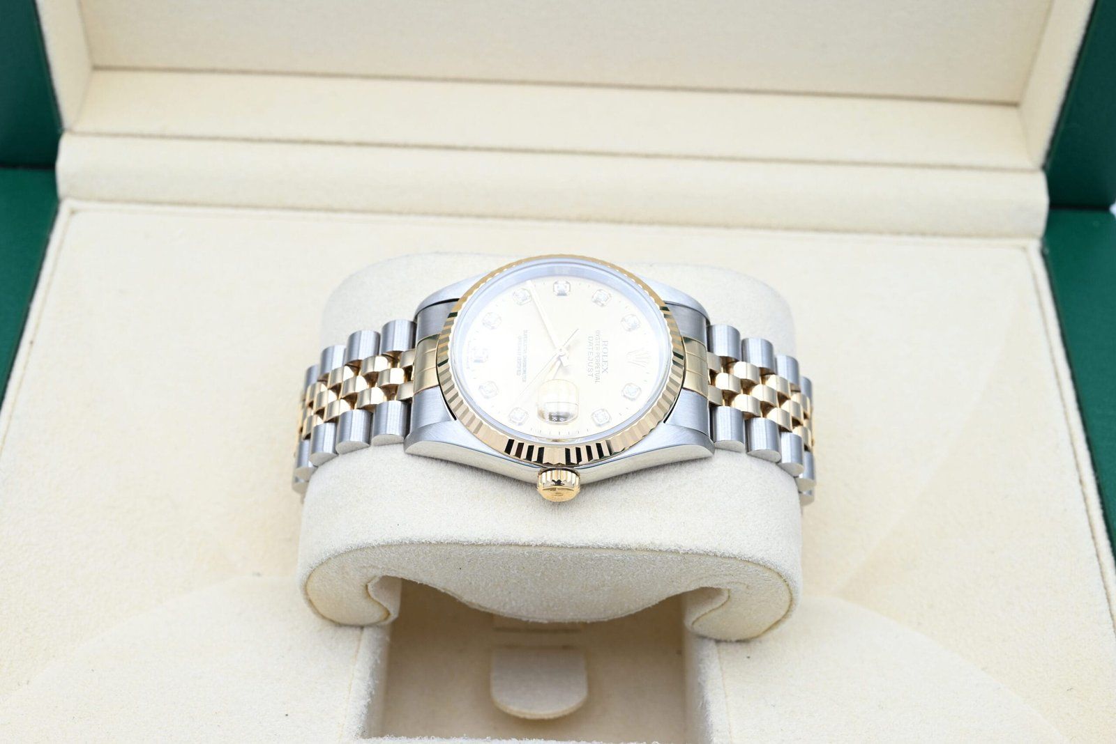 Rolex Datejust Réf. 16233 de 1995 avec le cadran en diamant champagne en excellent état, incluant la boîte et les papiers d'origine. Tous nos montres ont été soigneusement vérifiées par notre propre horloger et entretenues si nécessaire.