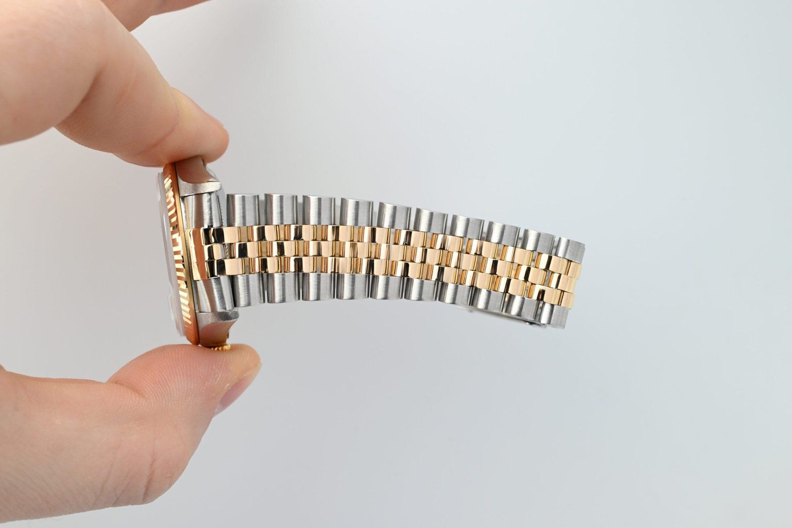 - Légères traces d’usure telles que de fines rayures ou micro-rayures. Le boîtier, la lunette et le bracelet conservent leurs arêtes nettes et leur forme générale. Peut avoir été poli professionnellement sans altérer les contours d’origine. Entièrement fonctionnelle mécaniquement.