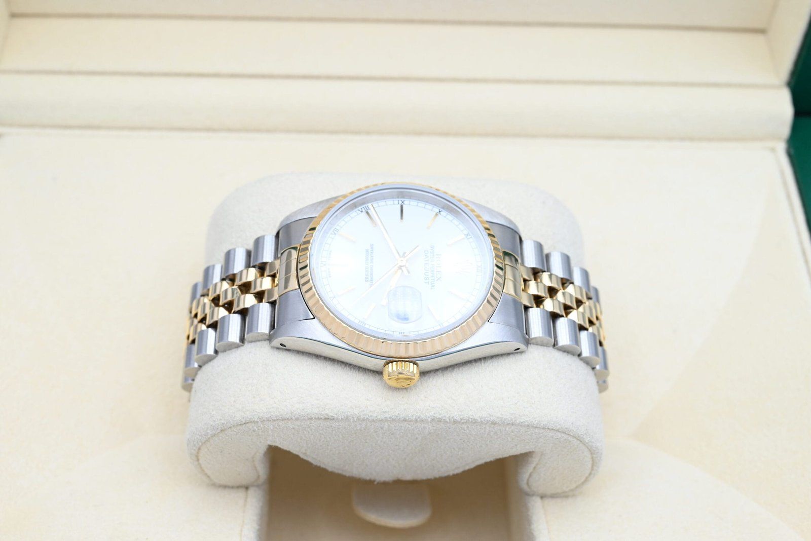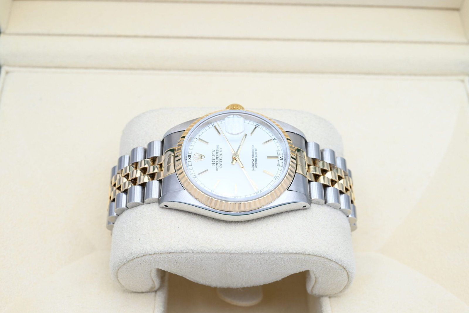 Rolex Datejust Réf. 16233 de 1990 avec le cadran blanc en excellent état, incluant la boîte et les papiers d'origine. Tous nos montres ont été soigneusement vérifiées par notre propre horloger et entretenues si nécessaire.