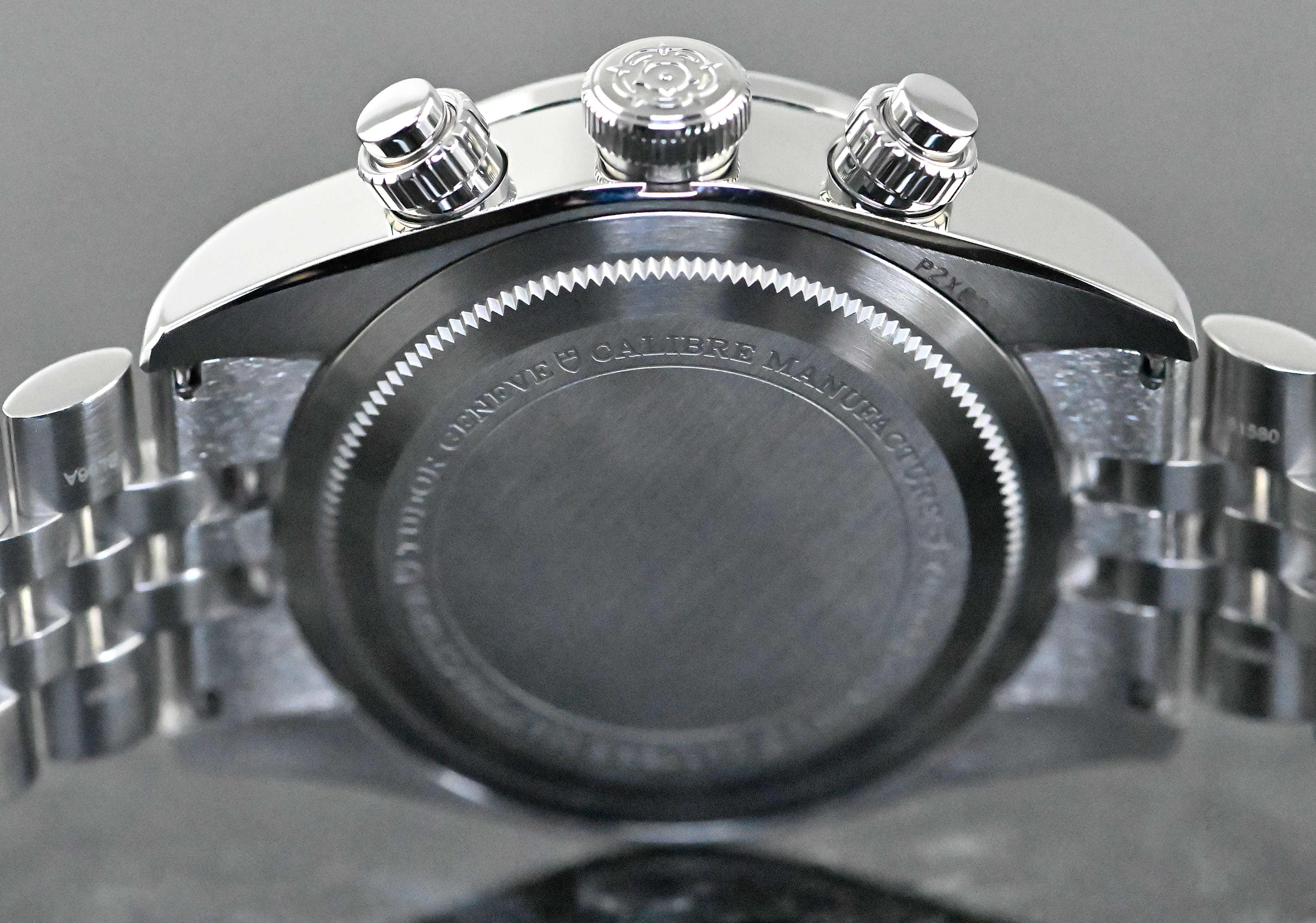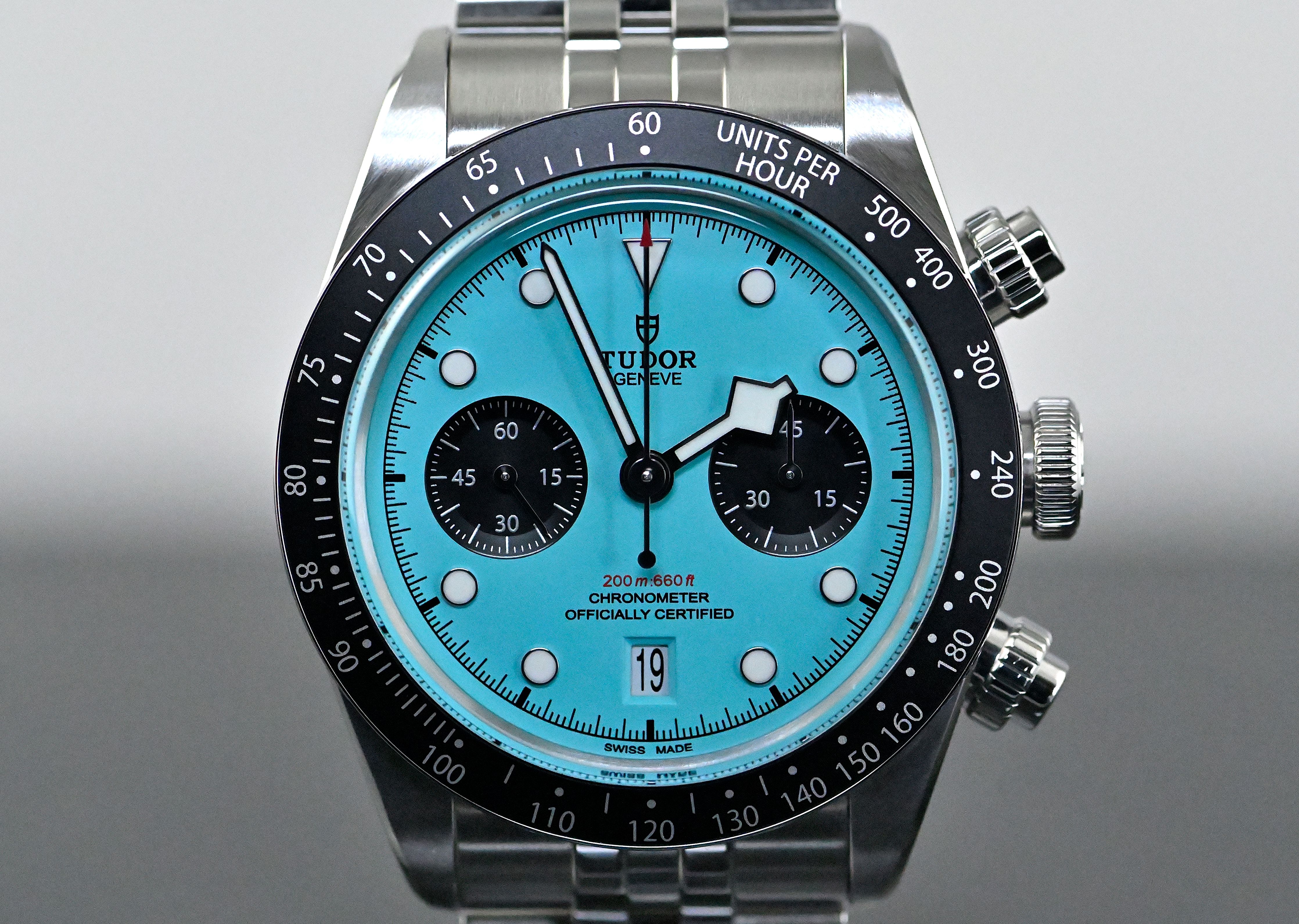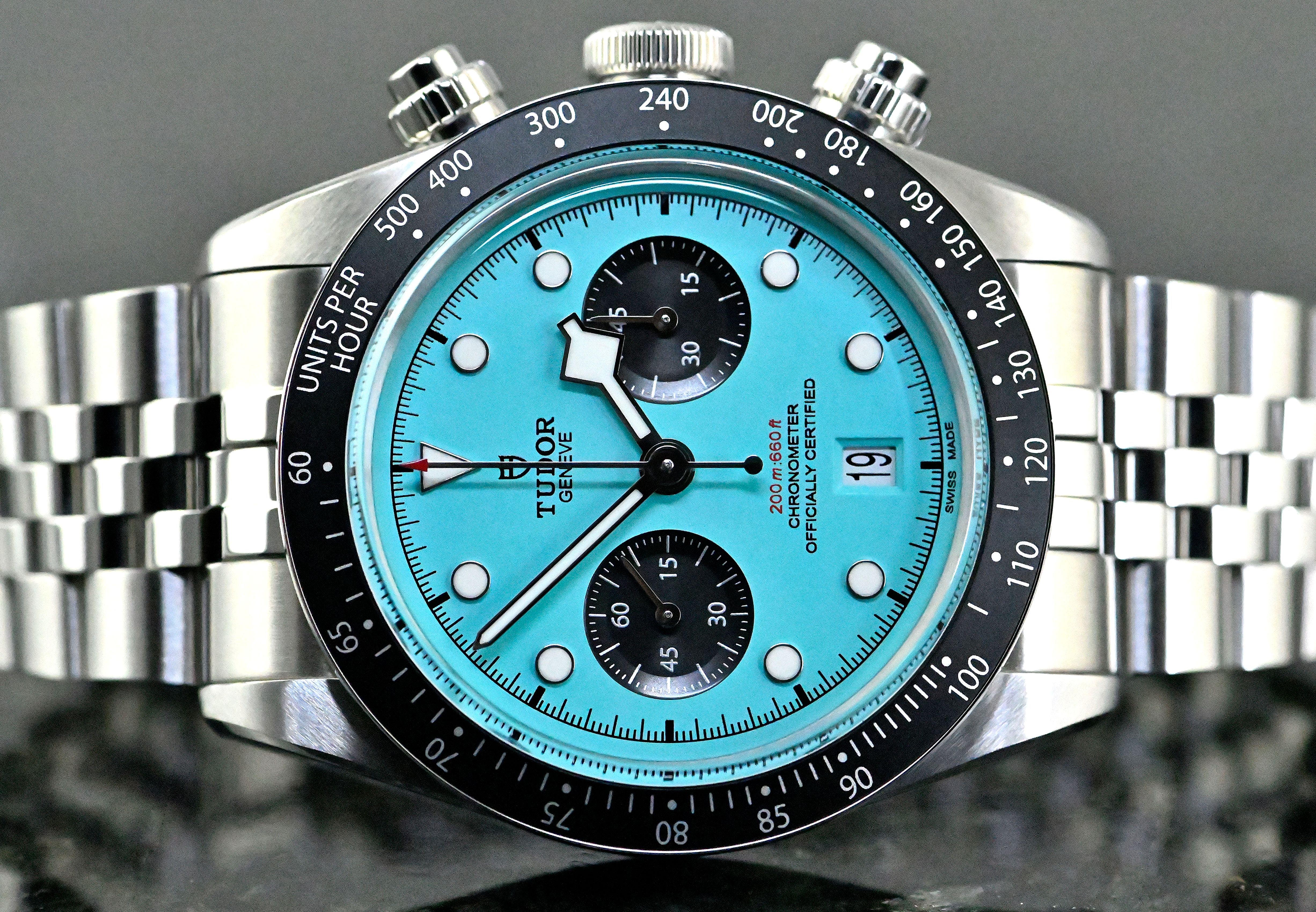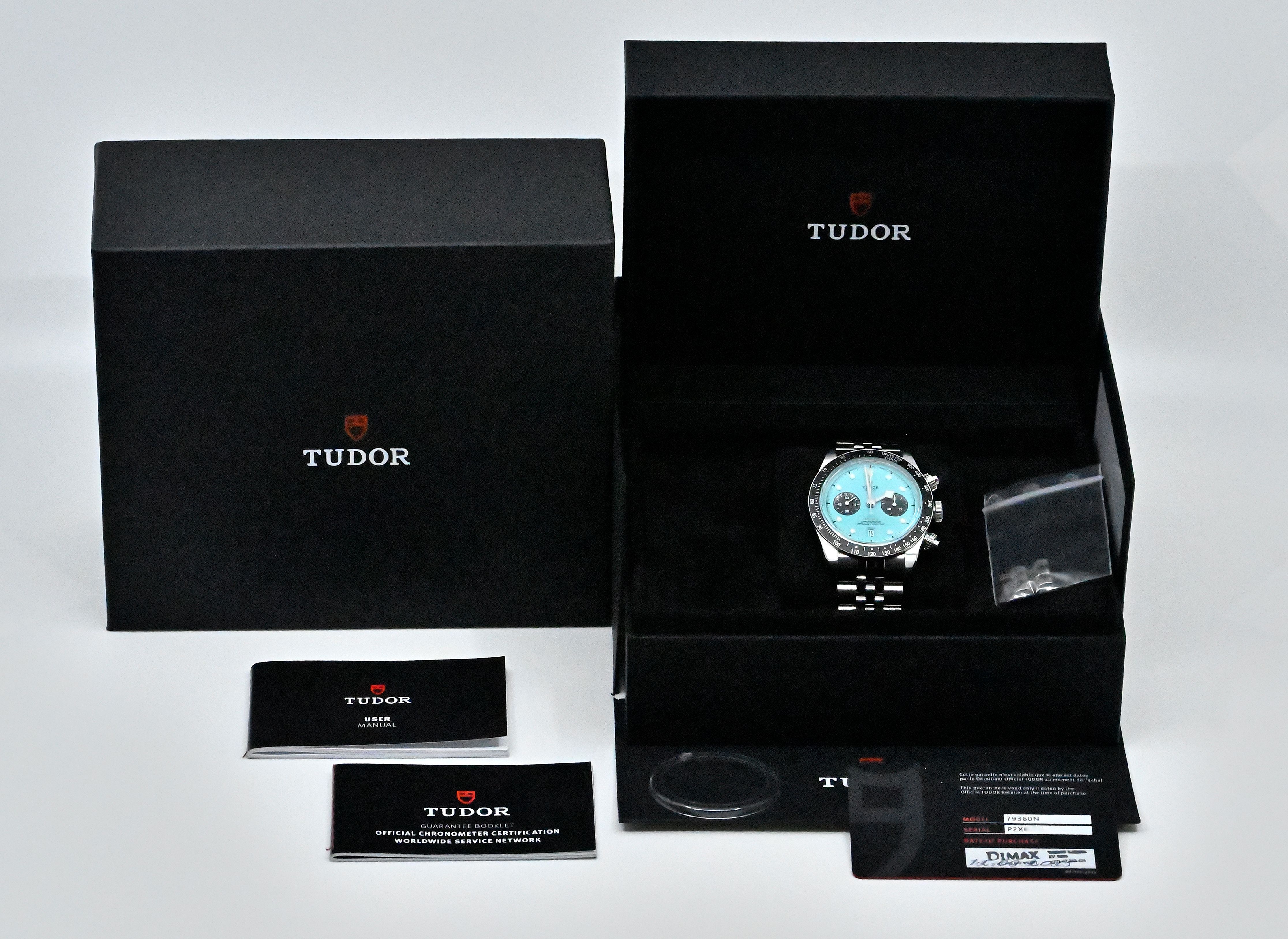 A special Tudor Black Bay Chrono Flamingo Blue | reference M79360N-0024 | in steel | Tudor automatic caliber MT5813 | sought-after turquoise toned dial known as “Flamingo Blue” in Tiffany style | former football star David Beckham, co-owner of Inter Miami, wears it | unworn condition | original Tudor steel bracelet with folding clasp | full set including the original Tudor box and outer carton — warranty certificate (sold on September 12, 2025) — booklets — two dismantled bracelet links.