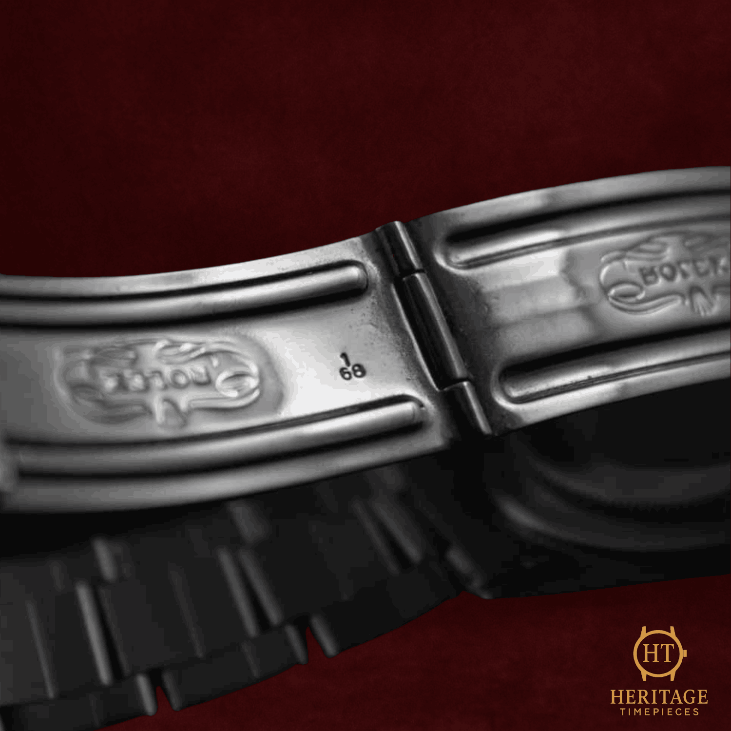 Heritage Narrative Few watches embody the romance of mid-century travel like the Rolex GMT-Master. Originally introduced in 1955 for Pan Am pilots crossing multiple time zones, the reference 1675 refined that pioneering design into one of Rolex’s most collectible classics. This 1967 example features the highly sought-after gilt dial, distinguished by its glossy black finish and gold text printing — a combination that Rolex phased out shortly after, making surviving specimens rare and prized among collectors. The warm glow of the gilt typography paired with the faded patina of the luminous hour plots gives this piece undeniable vintage character. Powered by the Rolex Calibre 1575, this GMT-Master allows tracking of two time zones simultaneously via its red 24-hour hand and bidirectional bezel. The watch retains its period-correct plexiglass crystal, stainless steel case, and Oyster bracelet, all in well-preserved condition that reflects both careful ownership and the robust construction of Rolex’s golden era. Technical Specifications Reference:1675 Year:1967 Movement:Rolex Calibre 1575, automatic, chronometer-certified, GMT 24-hour hand, date function, non-quickset Case:40 mm stainless steel Oyster case, screw-down crown, polished and brushed finish Bezel:Bidirectional aluminum insert with 24-hour scale (color fade varies naturally with age) Crystal:Acrylic (plexiglass) crystal Dial / Hands:Glossy black gilt dial with gold text, tritium luminous plots and matching hands (marked “Swiss - T < 25”) Bracelet / Clasp:Stainless steel Oyster bracelet with folding clasp Water resistance:Not guaranteed on vintage models (original factory rating: 50 m / 165 ft) Condition & Inclusions Overall grade:Pre-owned — excellent vintage condition with honest patina and strong case profile Service status:Fully functional; retains period-correct components throughout Set:Watch only — no original box or papers Shipping & Logistics Stored off-site and shipped fully insured within 1–3 business days. Worldwide shipping available; buyer responsible for any import duties or taxes. Shipping & Returns Complimentary insured worldwide shipping and a 14-day return window (watch must be returned in the same condition supplied). Every timepiece is authenticated, time-graphed, and prepared for secure transit. All shipments include a full inspection before dispatch, professional packaging, and tracking updates throughout delivery. Returns are accepted within the 14-day period for store credit or refund, subject to condition verification upon receipt.