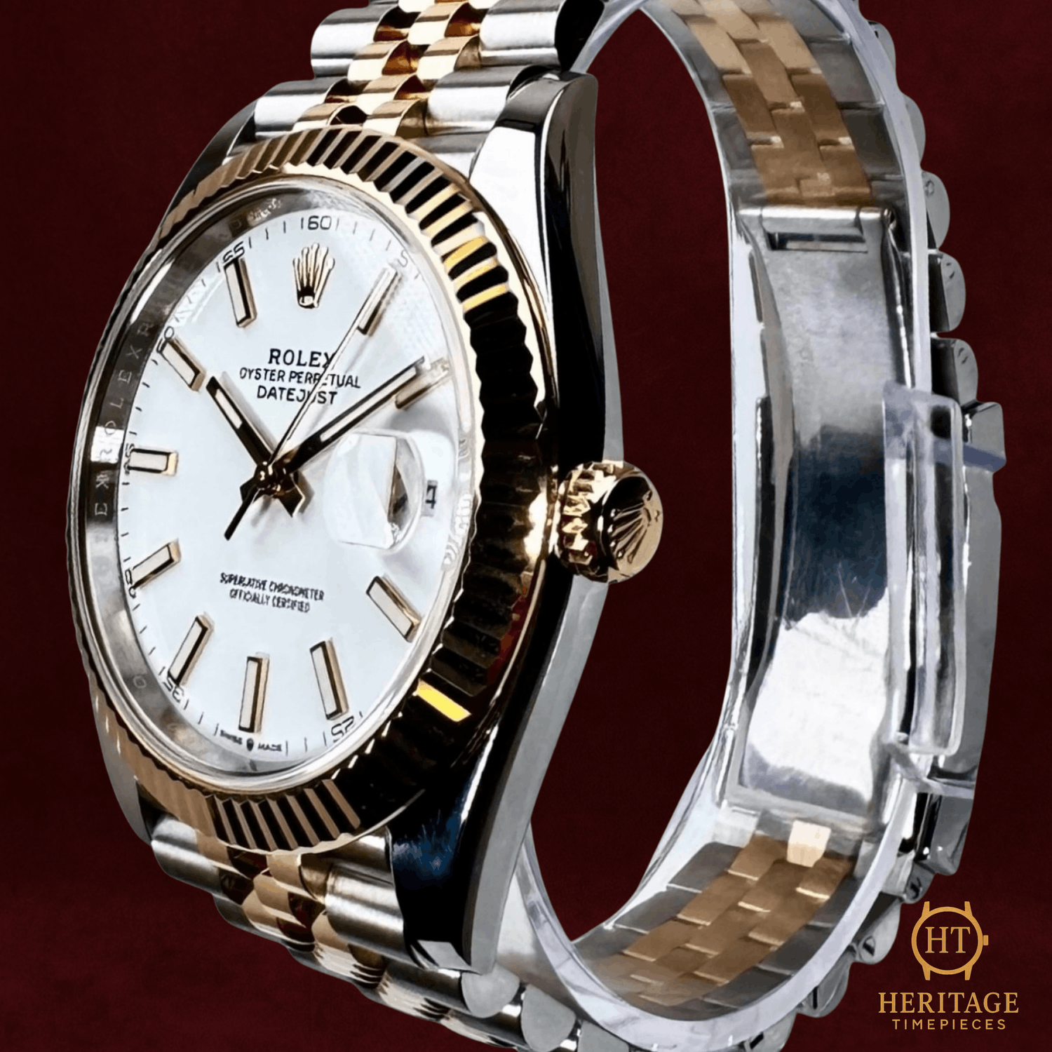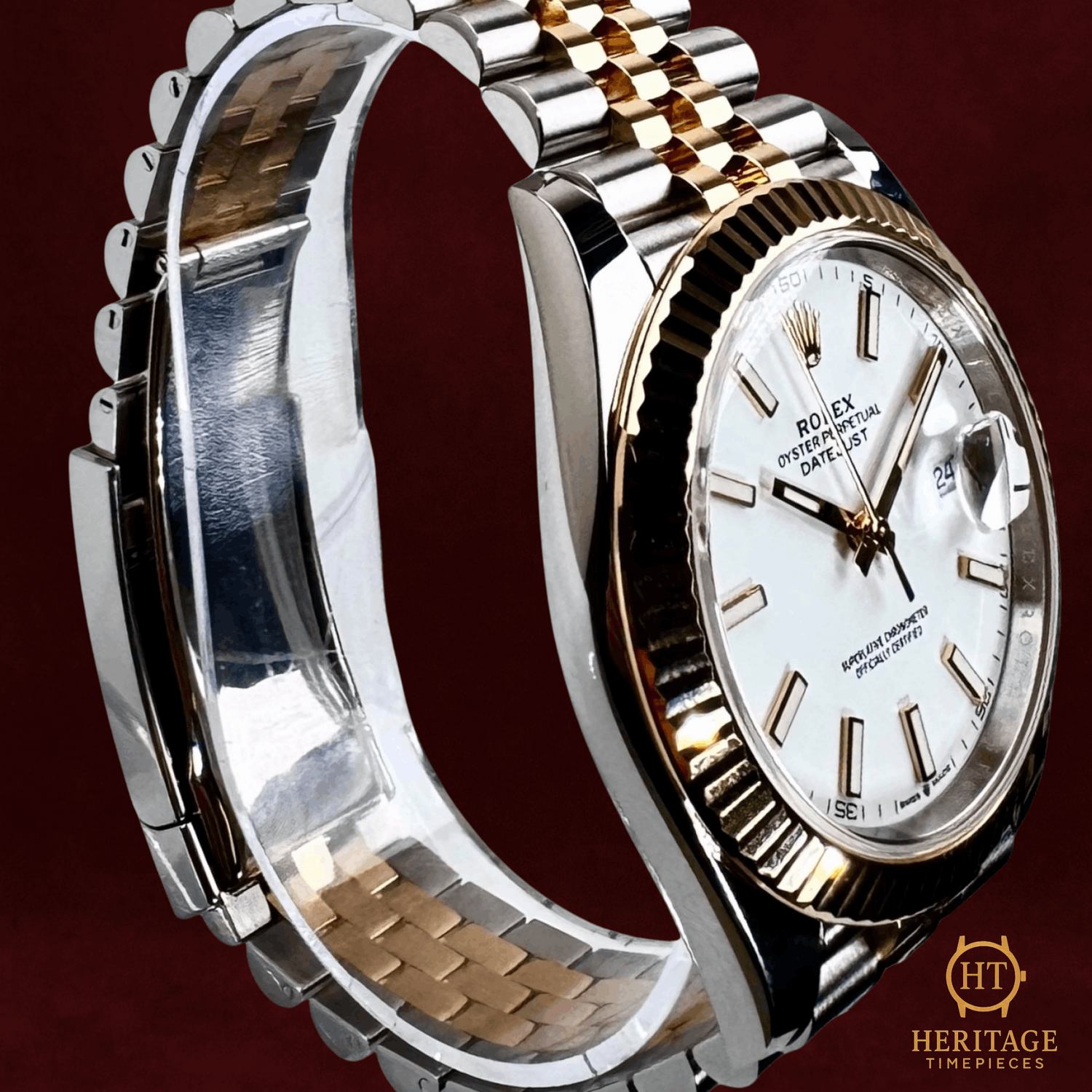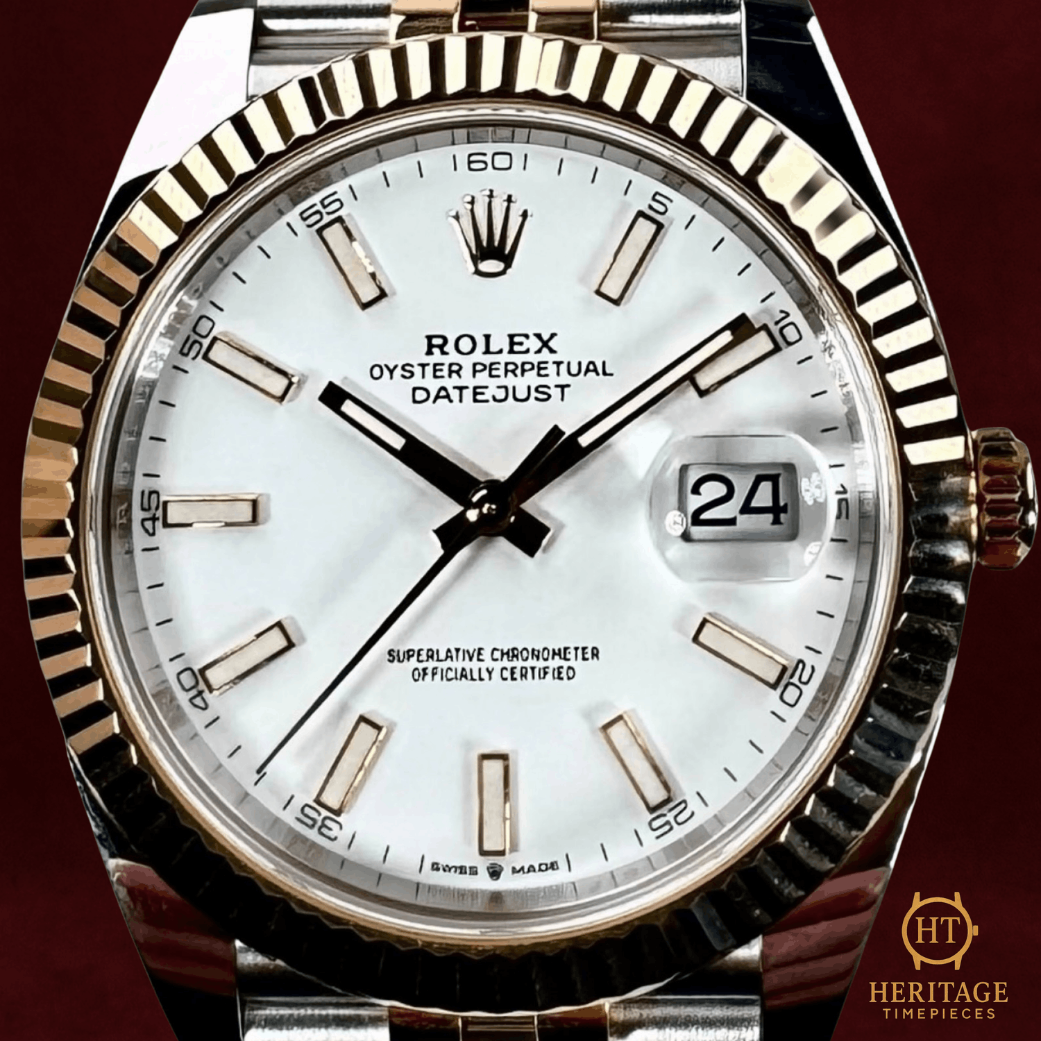 Heritage Narrative The Rolex Datejust is one of the most enduring and recognizable models in modern watchmaking, defined by timeless proportions, daily practicality, and unmistakable Rolex refinement. The Datejust 41 represents the contemporary evolution of this classic design, offering a larger case size while preserving the balance and elegance that have defined the collection for decades. This example, reference 126333, combines stainless steel with 18kt yellow gold, delivering the warmth and presence of a traditional two-tone Rolex with a clean, modern execution. The fluted yellow gold bezel adds visual depth and signature character, while the white dial with luminous index markers set in gold provides clarity, contrast, and a refined aesthetic suitable for both formal and everyday wear. Powered by Rolex’s self-winding Perpetual mechanical movement with quickset date functionality, the Datejust 41 offers dependable performance and effortless usability. The two-tone Jubilee bracelet completes the watch with comfort and elegance, reinforcing the model’s reputation as one of the most versatile watches in the Rolex lineup. Presented in mint condition, this Datejust 41 is an ideal example of contemporary Rolex design—timeless in appearance, modern in execution, and suitable for virtually any setting. Technical Specifications Brand:Rolex Model:Datejust 41 Reference:126333 Serial Number:6F6XXXXX Year:2023 Movement:Rolex self-winding Perpetual mechanical movement Complications:Quickset date Case:41 mm stainless steel case Bezel:Fluted 18kt yellow gold bezel Crystal:Scratch-resistant sapphire crystal Dial / Hands:White dial with luminous index hour markers set in goldGold hands Bracelet:18kt yellow gold & stainless steel Jubilee braceletApprox. 7 3/4 in (adjustable) Condition & Inclusions Overall Condition:Mint condition Service Status:Movement tested and functioning correctly Set:Includes: Box, Certificate / warranty card, Booklets, Tag Shipping & Logistics The watch is stored securely and shipped fully insured within 1–3 business days. Worldwide shipping is available. Any applicable import duties or taxes are the responsibility of the buyer. Shipping & Returns Complimentary insured worldwide shipping and a 14-day return window. Each timepiece is authenticated, time-tested, and professionally prepared prior to dispatch. Secure packaging, tracking, and full insurance are included with every shipment.