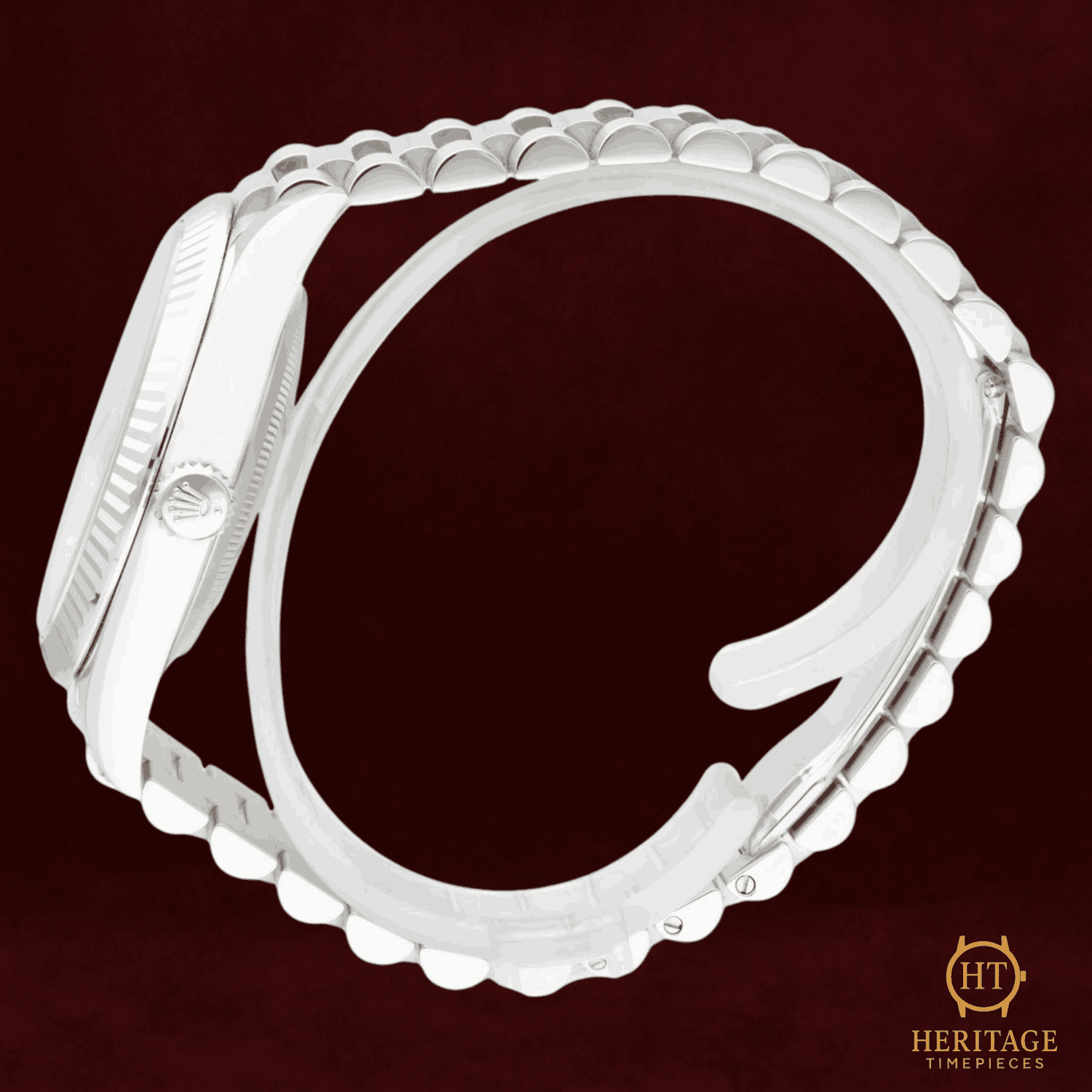 Heritage Narrative The Rolex Day-Date 40 reference 228236 represents the highest tier of Rolex’s classic lineup, combining the brand’s flagship Day-Date design with full platinum construction. As the model historically associated with Rolex’s most prestigious executions, the Day-Date is defined by its signature day display at 12 o’clock and date at 3 o’clock, paired with the iconic President bracelet. This example from 2025 is presented new and offered as a full set. The watch features a meteorite dial, distinguished by its naturally occurring crystalline pattern, making each dial visually unique. The meteorite surface introduces depth and texture that cannot be replicated through standard dial manufacturing, giving the watch a rare and highly collectible character. The clean, numeral-free layout reinforces the dial’s visual presence while preserving the classic Day-Date proportions. Powering the watch is Rolex’s in-house calibre 3255, a self-winding Perpetual mechanical movement engineered for precision, durability, and long-term reliability. Featuring instantaneous day and date functionality, the calibre 3255 incorporates Rolex’s Chronergy escapement, Parachrom hairspring, and advanced efficiency architecture, delivering a power reserve of approximately 70 hours. The 40 mm platinum Oyster case and platinum fluted bezel provide a distinctive yet understated presence, with platinum offering a unique tone and weight that sets it apart from white gold or steel. The platinum President bracelet completes the watch’s flagship identity, combining comfort, refinement, and unmistakable Day-Date design language. Presented new with its original box and warranty, this Day-Date 40 228236 offers a rare combination of Rolex’s most exclusive metal with one of its most sought-after dial materials. Technical Specifications Brand:Rolex Model:Day-Date 40 Reference:228236 Year:2025 Movement:Rolex self-winding Perpetual mechanical movement, Calibre 3255 Complications:Day displayDate Case:40 mm platinum Oyster case Bezel:Fluted platinum bezel Crystal:Scratch-resistant sapphire crystal Dial / Hands:Meteorite dialApplied luminous indicesHands Bracelet:Platinum President bracelet Clasp:Platinum deployant clasp Water Resistance:100 m / 330 ft (factory specification) Condition & Inclusions Overall Condition:New Service Status:Factory condition, movement tested and functioning correctly Set:Full set — includes box and warranty Shipping & Logistics The watch is stored securely and shipped fully insured within 1–3 business days. Worldwide shipping is available. Any applicable import duties or taxes are the responsibility of the buyer. Shipping & Returns Complimentary insured worldwide shipping and a 14-day return window. Each timepiece is authenticated, time-tested, and professionally prepared prior to dispatch. Secure packaging, tracking, and full insurance are included with every shipment.