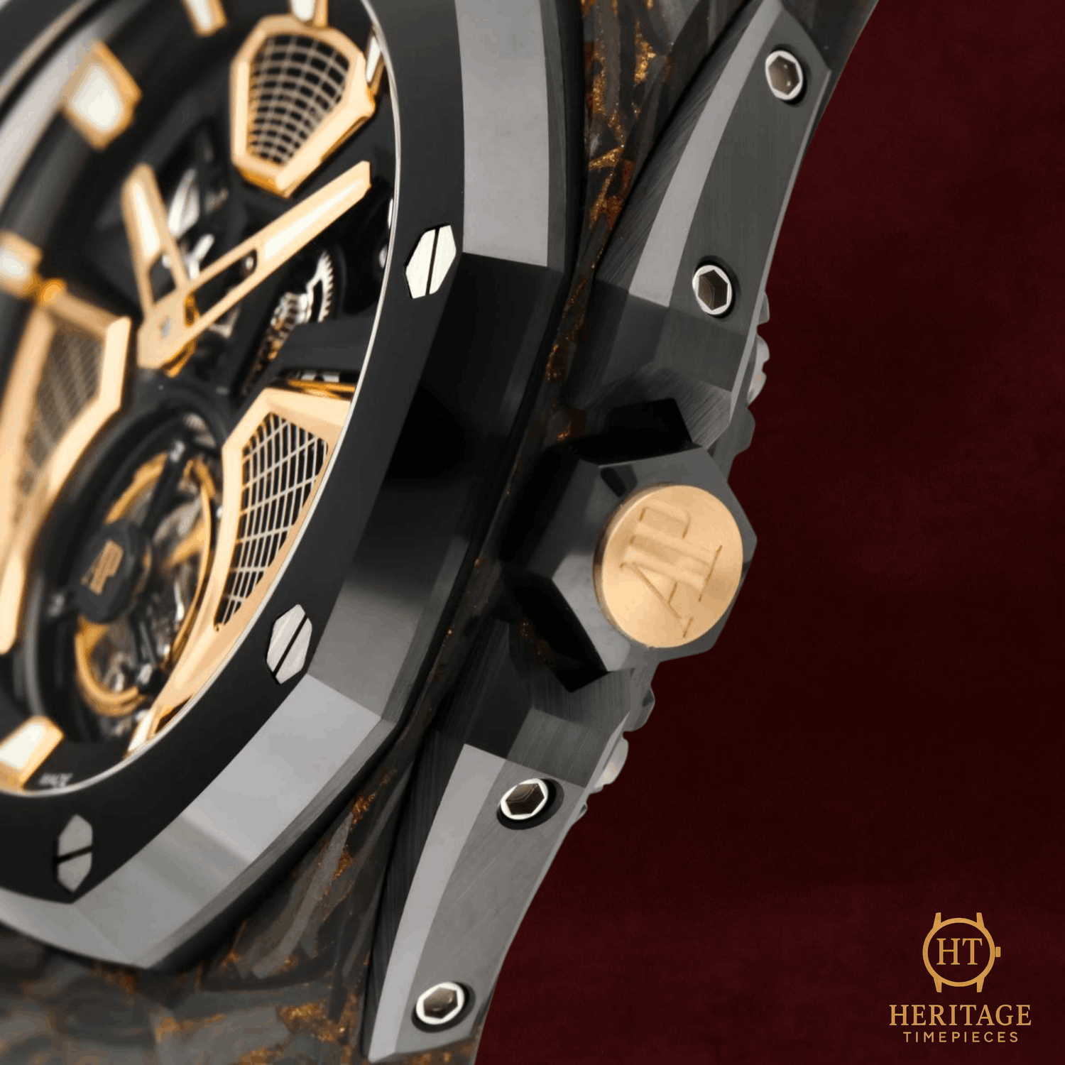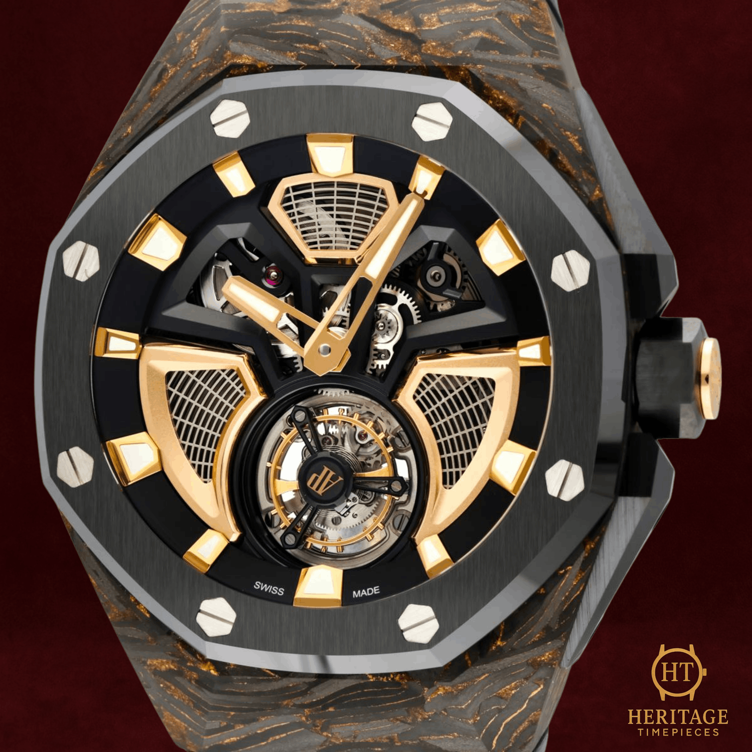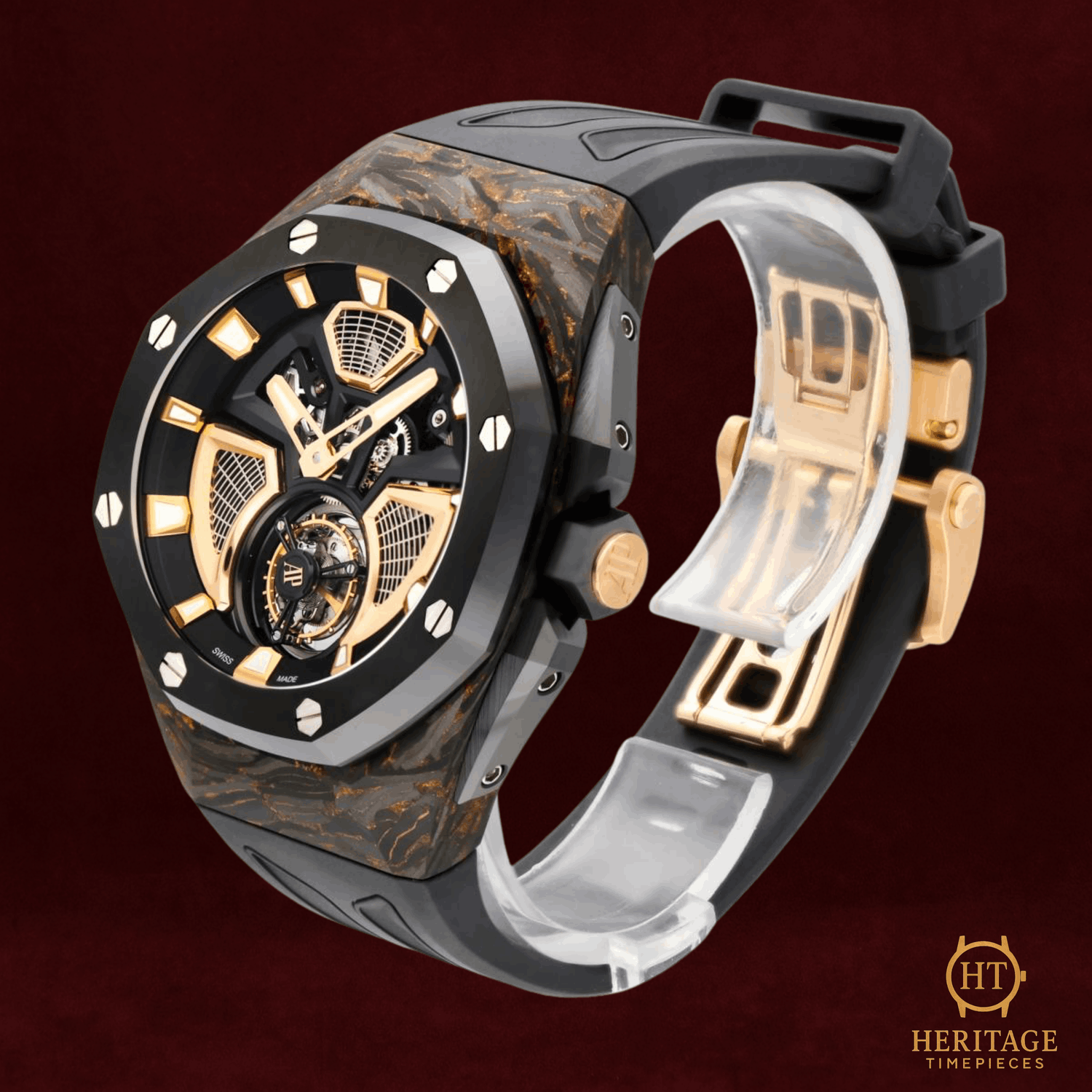 Heritage Narrative The Audemars Piguet Royal Oak Concept Flying Tourbillon is an avant-garde timepiece that showcases the brand’s most progressive approach to materials, mechanics, and design. Created as a special edition for the Middle East market, this model reflects close collaboration between Audemars Piguet and its most dedicated collectors, resulting in a bold and technically sophisticated expression of the Royal Oak Concept line. The 42 mm case is crafted from Chroma Forged Technology (CFT) carbon, a high-tech composite material developed by Audemars Piguet. The forged carbon construction reveals unique bronze-toned patterns throughout the case, ensuring that no two examples are exactly alike. A black ceramic bezel and crown guards provide contrast while reinforcing durability and lightness. The openworked dial offers an unobstructed view of the flying tourbillon and the automatic mechanical movement beneath. Pink gold accents on the inner bezel, hands, and applied elements enhance depth and legibility, while the skeletonized architecture highlights the technical complexity of the watch. A sapphire crystal and transparent caseback further showcase the movement’s refined finishing. With a power reserve of approximately 72 hours and water resistance up to 50 meters, the Royal Oak Concept Flying Tourbillon balances cutting-edge horology with real-world usability. Offered as a full set and presented in pre-owned condition, this timepiece represents a highly collectible example of Audemars Piguet’s modern haute horlogerie. Technical Specifications Brand:Audemars Piguet Model:Royal Oak Concept Flying Tourbillon Reference:26638F.OO.D002CA.01 Year:2025 Movement:Automatic mechanical movement Functions:Flying tourbillonChronograph Power Reserve:Approximately 72 hours Case:42 mm CFT carbon case Bezel:Black ceramic bezel Dial:Transparent openworked dialNo numerals Crystal:Sapphire crystalSapphire caseback Bracelet / Strap:Black rubber strap Clasp:Pink gold folding clasp Water Resistance:50 m Condition & Inclusions Overall Condition:Pre-owned Set:Full set — includes box and papers Warranty:Manufacturer warranty included Shipping & Logistics The watch is stored securely and shipped fully insured within 1–3 business days. Worldwide shipping is available. Any applicable import duties or taxes are the responsibility of the buyer. Shipping & Returns Complimentary insured worldwide shipping and a 14-day return window. Each timepiece is authenticated, time-tested, and professionally prepared prior to dispatch. Secure packaging, tracking, and full insurance are included with every shipment.