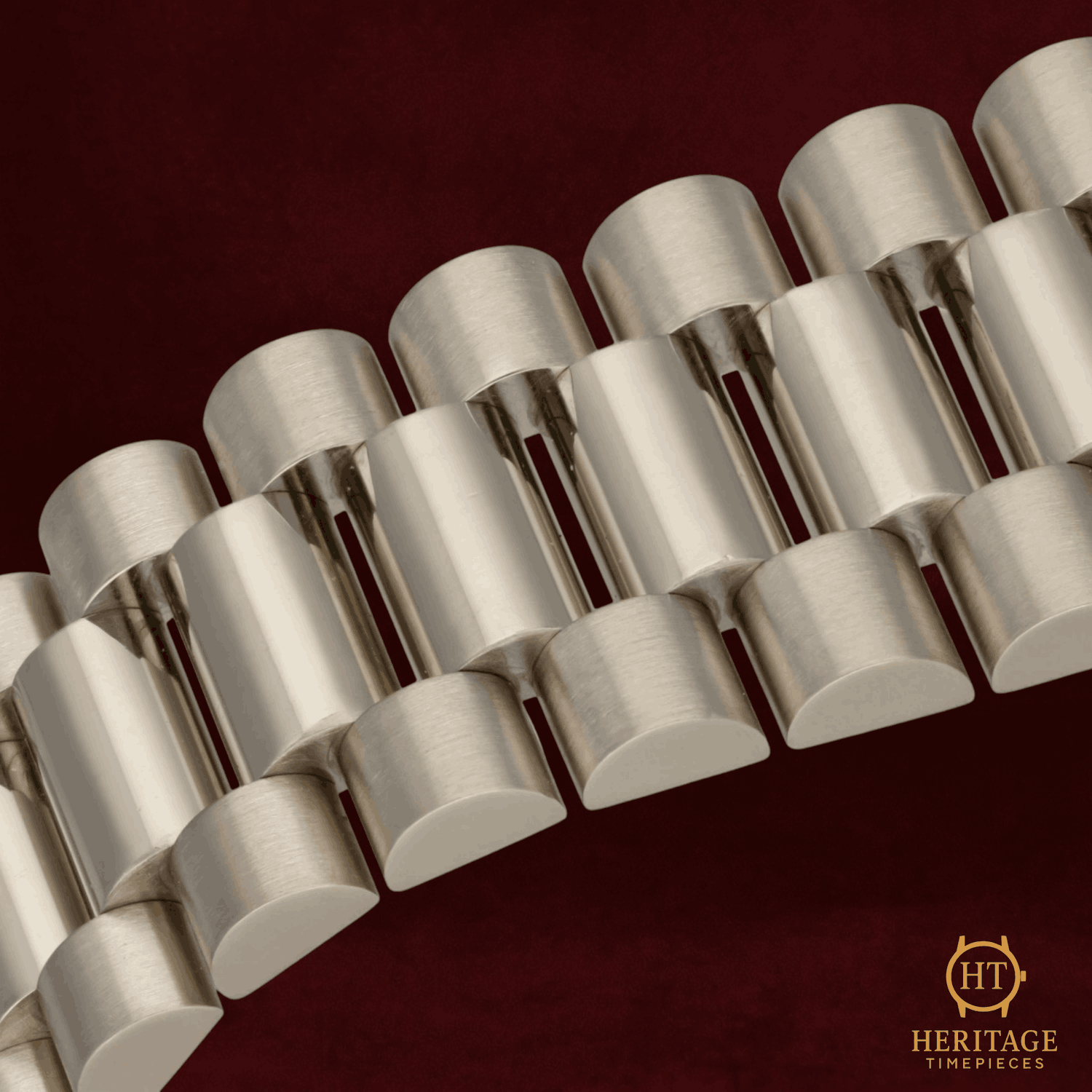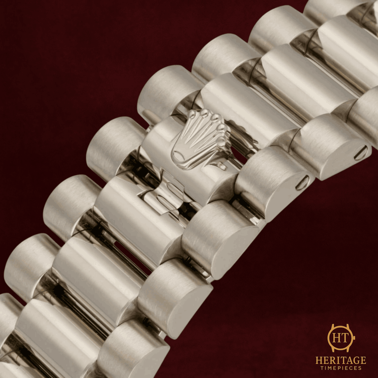 Heritage Narrative The Rolex Oyster Perpetual Day-Date 40, reference 228239, represents one of the most iconic expressions of Rolex’s prestige line, crafted entirely in 18 kt white gold. Introduced as the modern 40 mm evolution of the Day-Date collection, this reference combines contemporary proportions with the unmistakable design codes that have defined the model since its debut in 1956. This 2019 example features a silver dial with Roman numeral hour markers, framed by Rolex’s signature fluted bezel in white gold. The balanced dial layout places the day display in full at 12 o’clock and the date at 3 o’clock beneath the Cyclops lens, preserving the instantly recognizable Day-Date identity. Powering the watch is Rolex’s calibre 3255, a new-generation self-winding mechanical movement developed and manufactured entirely in-house. Featuring Chronergy escapement architecture and an approximate 70-hour power reserve, the calibre 3255 delivers outstanding precision, durability, and long-term reliability. The watch is fitted with the iconic President bracelet, crafted in solid 18 kt white gold with semi-circular three-piece links, offering both comfort and refinement. Presented as a full set and in pre-owned condition, this Day-Date 40 remains a cornerstone reference within the modern Rolex collection. Technical Specifications Brand:Rolex Model:Oyster Perpetual Day-Date 40 Reference:228239 Year:2019 Movement:Rolex self-winding Perpetual mechanical movementCalibre 3255 Complications:Day display at 12 o’clockDate display at 3 o’clock Case:40 mm Oyster case in 18 kt white gold Bezel:Fluted bezel in 18 kt white gold Crystal:Scratch-resistant sapphire crystal with Cyclops lens Dial / Hands:Silver dialRoman numeral hour markersLuminous hands Bracelet:President bracelet in 18 kt white gold Clasp:Concealed folding Crownclasp in 18 kt white gold Water Resistance:100 m Condition & Inclusions Overall Condition:Pre-owned Set:Full set — includes box and papers Warranty:Manufacturer warranty included (as supplied) Shipping & Logistics The watch is stored securely and shipped fully insured within 1–3 business days. Worldwide shipping is available. Any applicable import duties or taxes are the responsibility of the buyer. Shipping & Returns Complimentary insured worldwide shipping and a 14-day return window. Each timepiece is authenticated, time-tested, and professionally prepared prior to dispatch. Secure packaging, tracking, and full insurance are included with every shipment.
