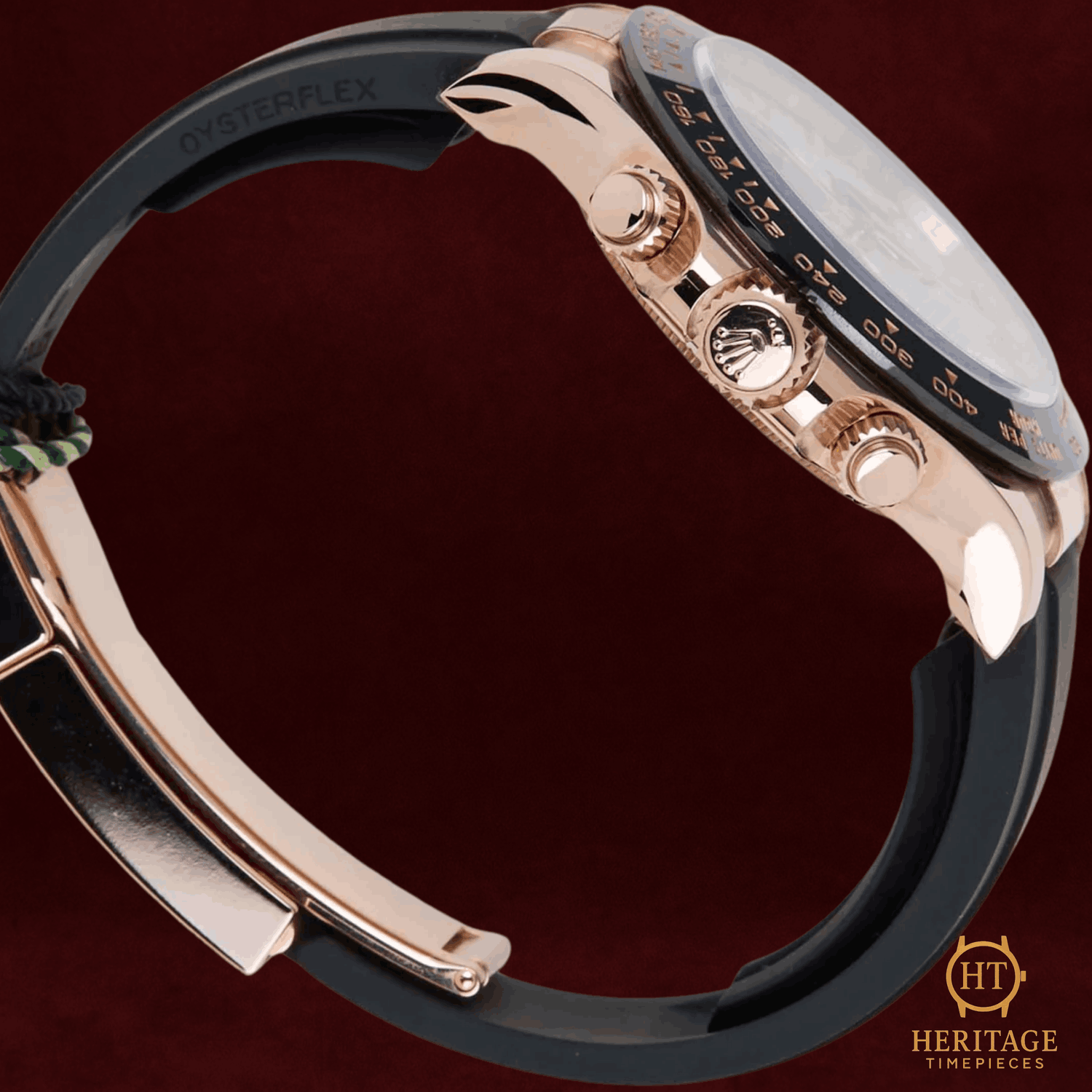 Heritage Narrative The Rolex Cosmograph Daytona reference 116515LN represents one of the most desirable modern Daytona configurations, combining precious metal construction with a sport-forward Oysterflex setup. As part of Rolex’s Daytona lineage rooted in professional timing and racing heritage, the 116515LN stands out for its balance of performance, wearability, and unmistakable Daytona identity. This example, first sold in December 2022, is presented in 99% new condition and offered as a full set. The watch features a meteorite dial, characterized by its naturally occurring crystalline pattern, making each dial visually unique. The meteorite surface adds depth and texture while maintaining the classic Daytona three-register chronograph layout, resulting in a highly collectible configuration. Powering the watch is Rolex’s calibre 4130, a self-winding Perpetual mechanical chronograph movement known for its reliability, efficiency, and long-term durability. The movement offers practical everyday performance while supporting the Daytona’s professional chronograph function. The 40 mm 18kt Everose gold Oyster case is paired with a black Cerachrom tachymeter bezel, providing high scratch resistance and lasting color stability. Completing the configuration is Rolex’s Oysterflex bracelet, a patented elastomer strap reinforced with flexible metal blades, designed to combine the comfort of rubber with the security and structure expected from a Rolex sports watch. Presented complete with its original box and warranty card and covered by international Rolex warranty until December 2027, this Daytona 116515LN offers one of the most sought-after modern Daytona combinations: precious metal, Oysterflex versatility, and meteorite rarity. Technical Specifications Brand:Rolex Model:Cosmograph Daytona Reference:116515LN Year:December 2022 Movement:Rolex self-winding Perpetual mechanical chronograph movement, Calibre 4130 Complications:ChronographSmall secondsTachymeter scale Case:40 mm 18kt Everose gold Oyster case Bezel:Black Cerachrom tachymeter bezel Crystal:Scratch-resistant sapphire crystal Dial / Hands:Meteorite dialChronograph countersApplied hour markersHands Bracelet:Rolex Oysterflex bracelet (black elastomer) Clasp:18kt Everose gold deployant clasp Water Resistance:100 m / 330 ft (factory specification) Condition & Inclusions Overall Condition:Pre-owned — mint condition (99% new) Service Status:Movement tested and functioning correctly Set:Full set — includes box and papersIncludes international Rolex warranty valid until December 2027 Shipping & Logistics The watch is stored securely and shipped fully insured within 1–3 business days. Worldwide shipping is available. Any applicable import duties or taxes are the responsibility of the buyer. Shipping & Returns Complimentary insured worldwide shipping and a 14-day return window. Each timepiece is authenticated, time-tested, and professionally prepared prior to dispatch. Secure packaging, tracking, and full insurance are included with every shipment.