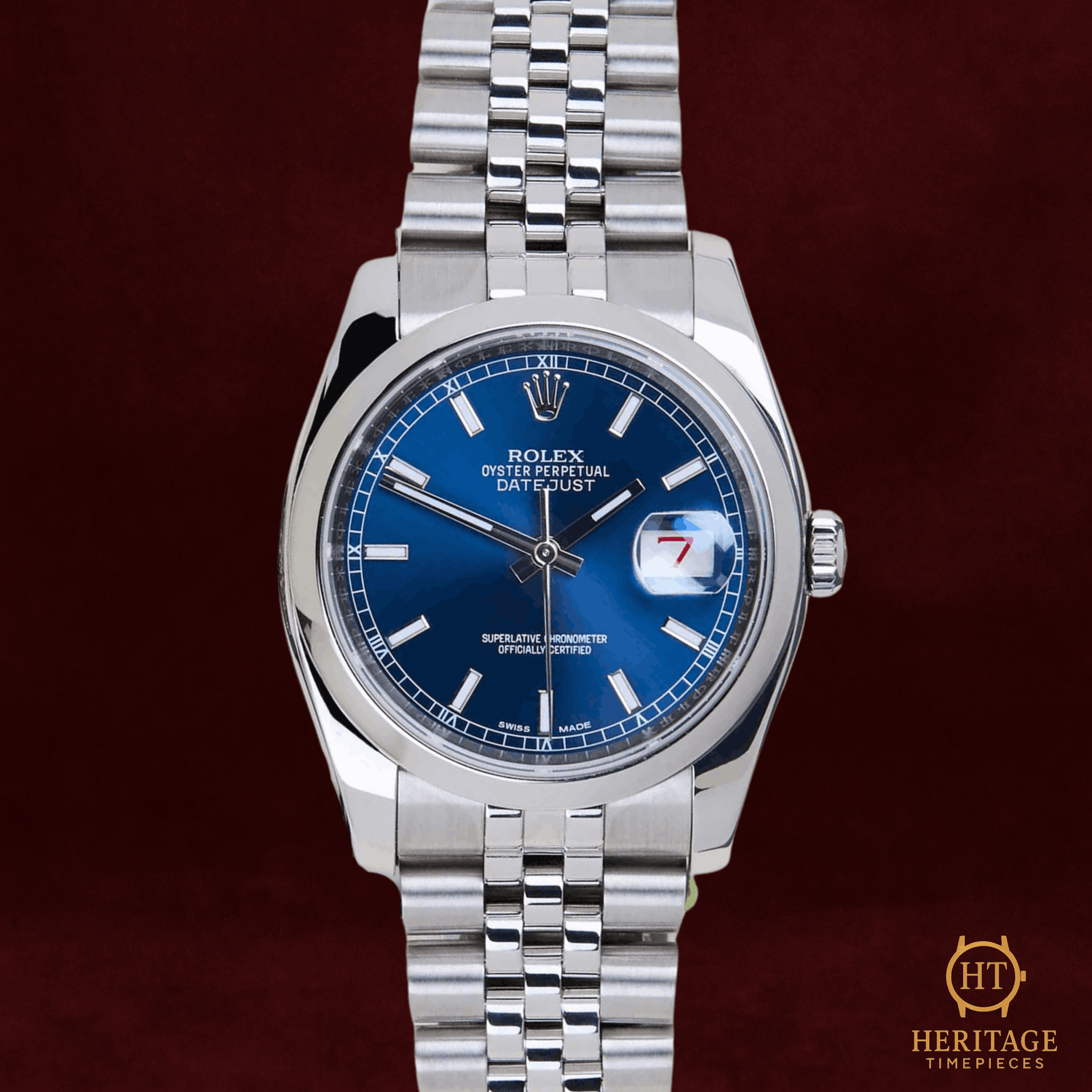Heritage Narrative The Rolex Datejust 36 reference 116200 represents a modern interpretation of one of Rolex’s most enduring designs. Crafted in stainless steel and paired with the Jubilee bracelet, the watch reflects the balanced proportions and everyday versatility that have defined the Datejust collection for decades. This example features a deep blue dial complemented by a roulette date wheel, adding a subtle and distinctive detail appreciated among collectors. Technical Specifications Reference:116200 Year:August 2015 Movement:Rolex automatic self-winding movement with date Case:36 mm Oyster case in stainless steel Bezel:Smooth stainless steel bezel Crystal:Scratch-resistant sapphire crystal with Cyclops date magnifier Dial / Hands:Blue dial with applied hour markers and luminous hands Bracelet / Clasp:Rolex Jubilee bracelet in stainless steel with folding clasp Water resistance:100 m (manufacturer specification) Condition & Inclusions Overall grade:Pre-owned — mint condition Service status:Movement tested and functioning correctly Set:Full set — original box and warranty card Shipping & Logistics Stored off-site and shipped fully insured within 1–3 business days.Worldwide shipping available; buyer responsible for any import duties or taxes. Shipping & Returns Complimentary insured worldwide shipping and a 14-day return window (watch must be returned in the same condition supplied). Each timepiece is authenticated, time-tested, and professionally prepared prior to dispatch. All shipments include secure packaging, tracking, and full insurance coverage.