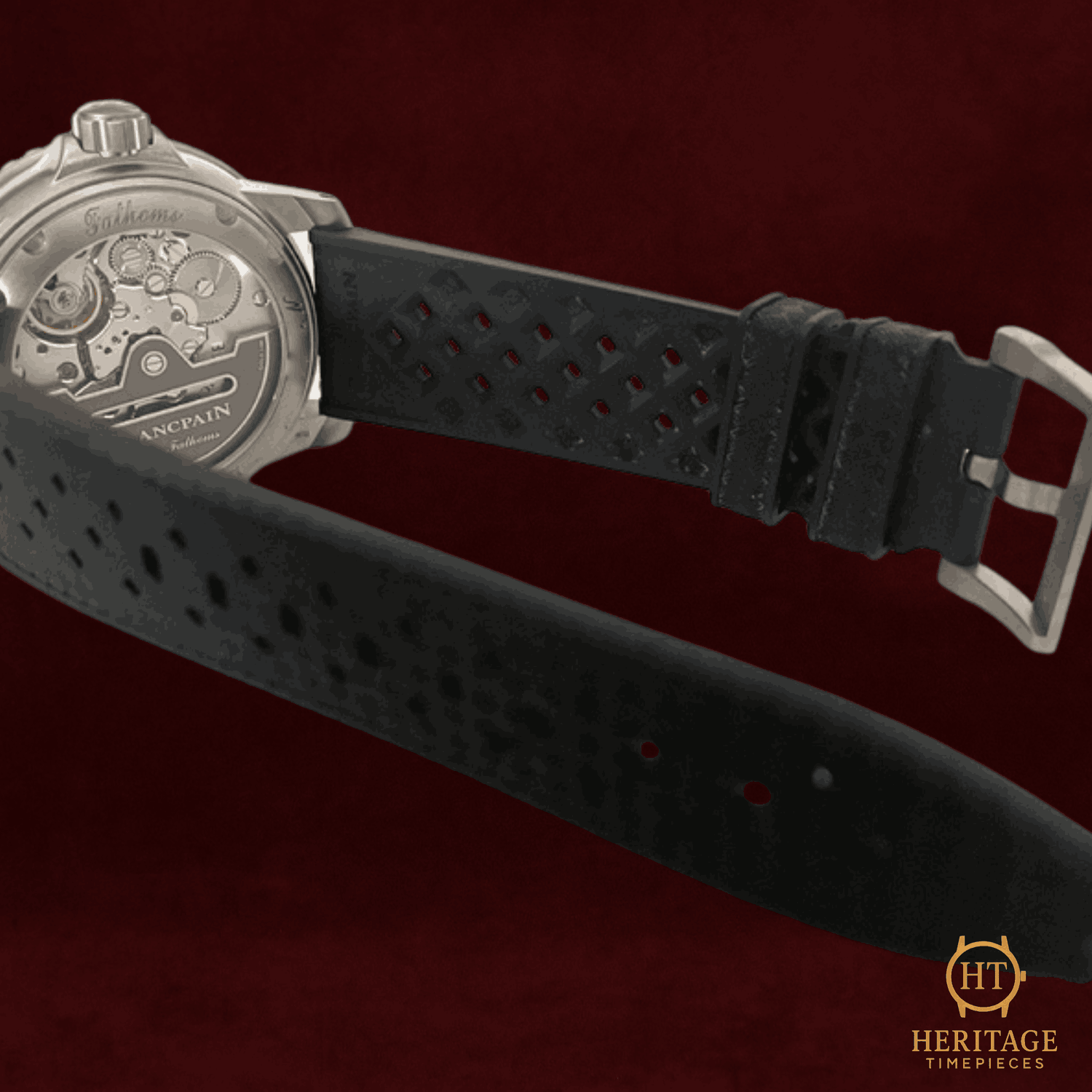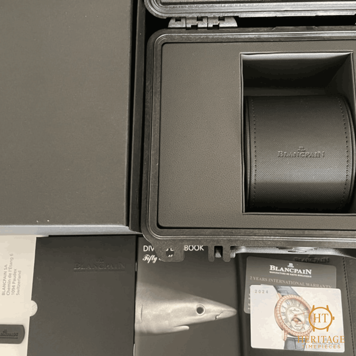 Heritage Narrative The Blancpain Fifty Fathoms Bathyscaphe reference 5010-12B30-B64A represents the modern evolution of one of the earliest true dive watches ever created. Rooted in Blancpain’s historic Fifty Fathoms lineage from 1953, the Bathyscaphe offers a more contemporary and versatile interpretation while preserving the collection’s core tool-watch DNA. Technical Specifications Reference:5010-12B30-B64A Year:December 2024 Movement:Blancpain automatic self-winding movement Case:42.3 mm stainless steel case Bezel:Unidirectional rotating bezel Crystal:Scratch-resistant sapphire crystal Dial / Hands:Black dial with luminous markers and hands Bracelet / Clasp:Tropic rubber strap with tang buckle Water resistance:300 m (manufacturer specification) Condition & Inclusions Overall grade:Pre-owned — excellent condition Service status:Running within specification Set:Full set — original box and warranty card Warranty:Blancpain international warranty until December 2026 Shipping & Logistics Stored off-site and shipped fully insured within 1–3 business days.Worldwide shipping available; buyer responsible for any import duties or taxes. Shipping & Returns Complimentary insured worldwide shipping and a 14-day return window (watch must be returned in the same condition supplied). Each timepiece is authenticated, time-tested, and professionally prepared prior to dispatch. All shipments include secure packaging, tracking, and full insurance coverage.