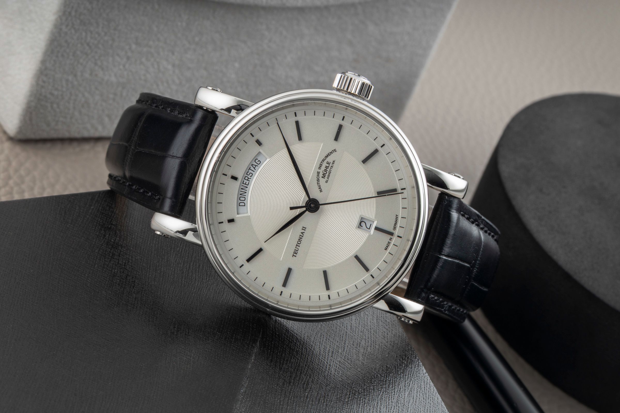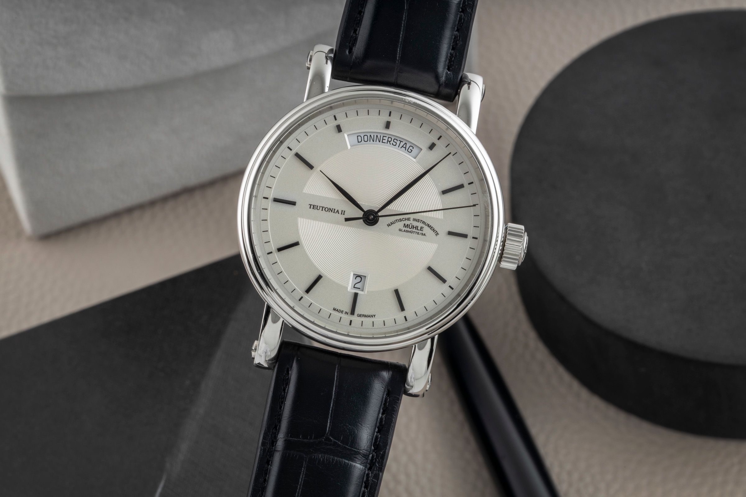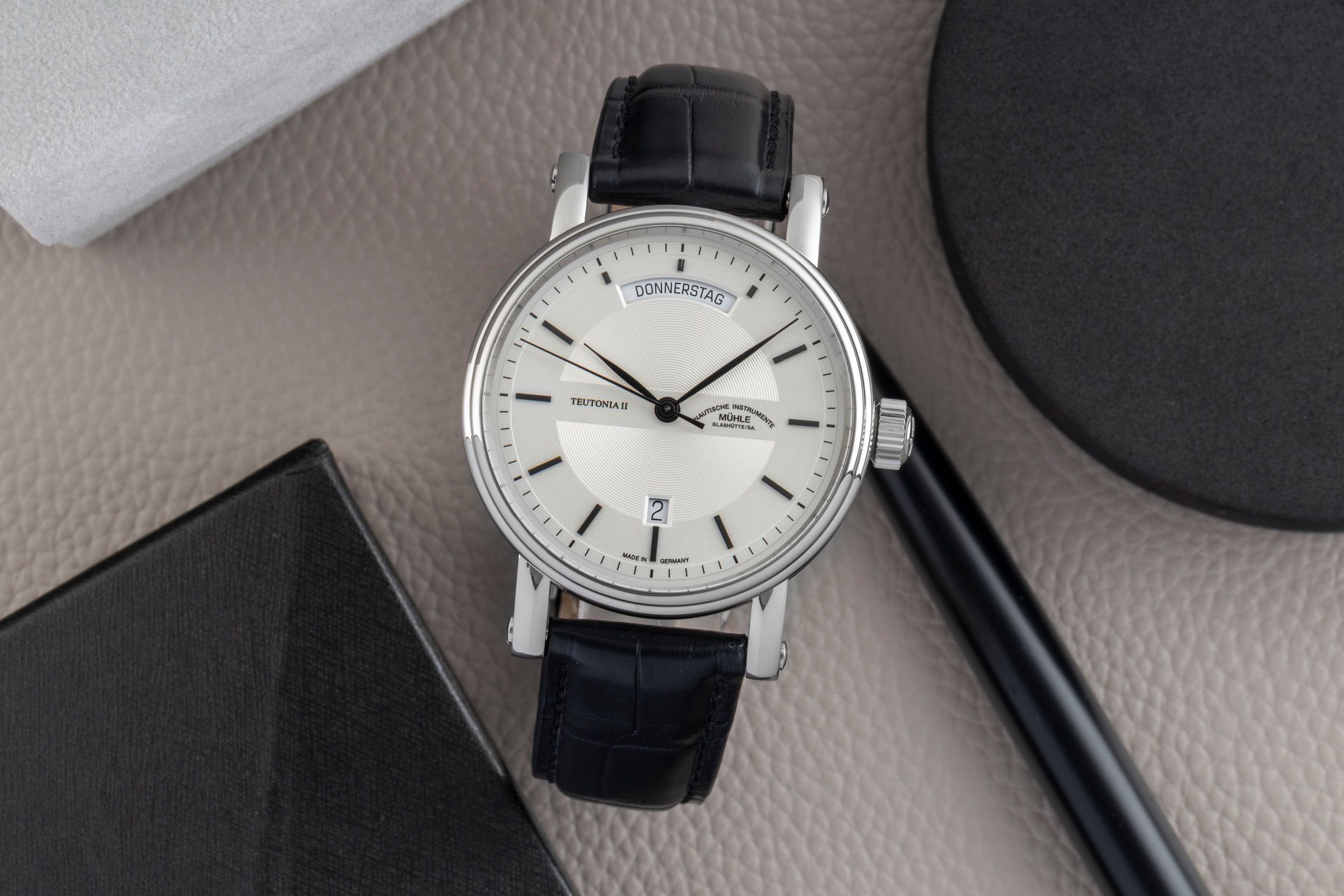 Alternative title: Mühle Glashütte M1-33-65-LB Teutonia II; Mühle Teutonia II Stahl Automatik Herrenuhr Ref. M1-33-65LB Box & Papiere 2025 [2601854]
