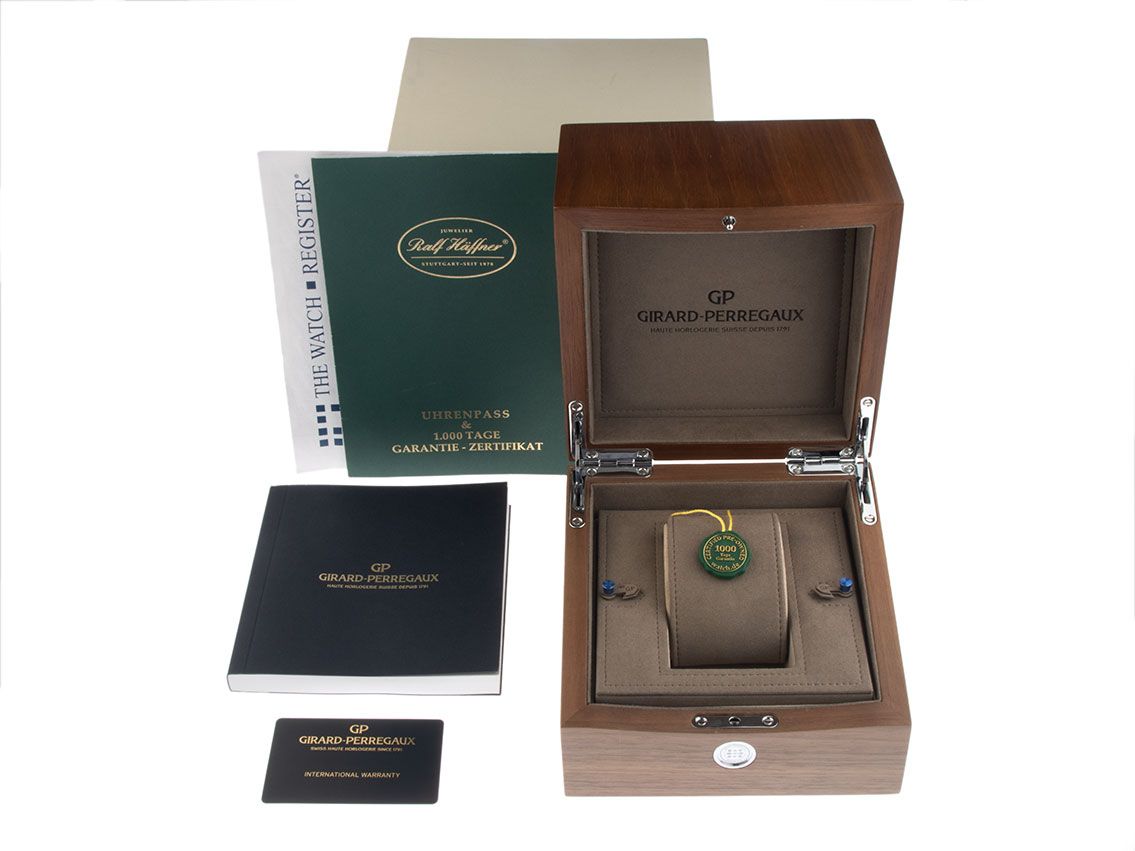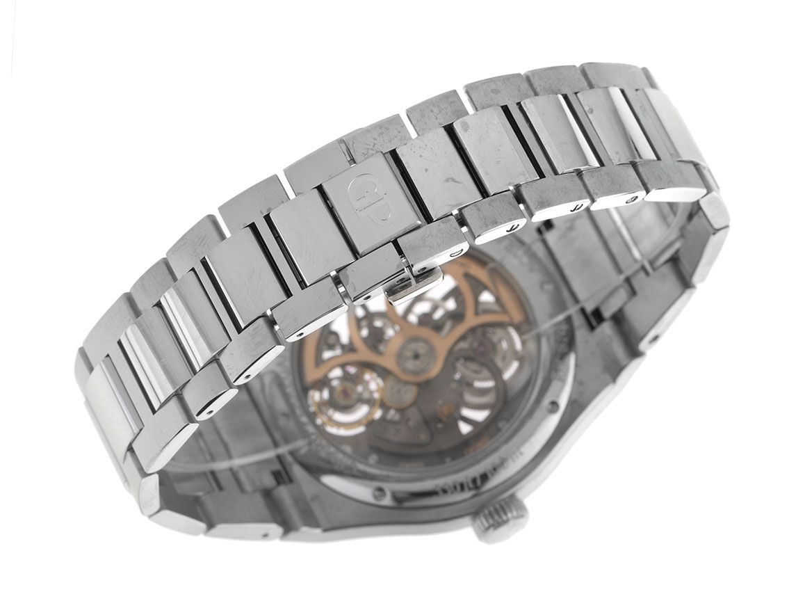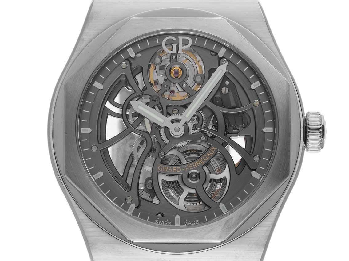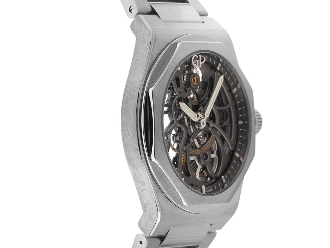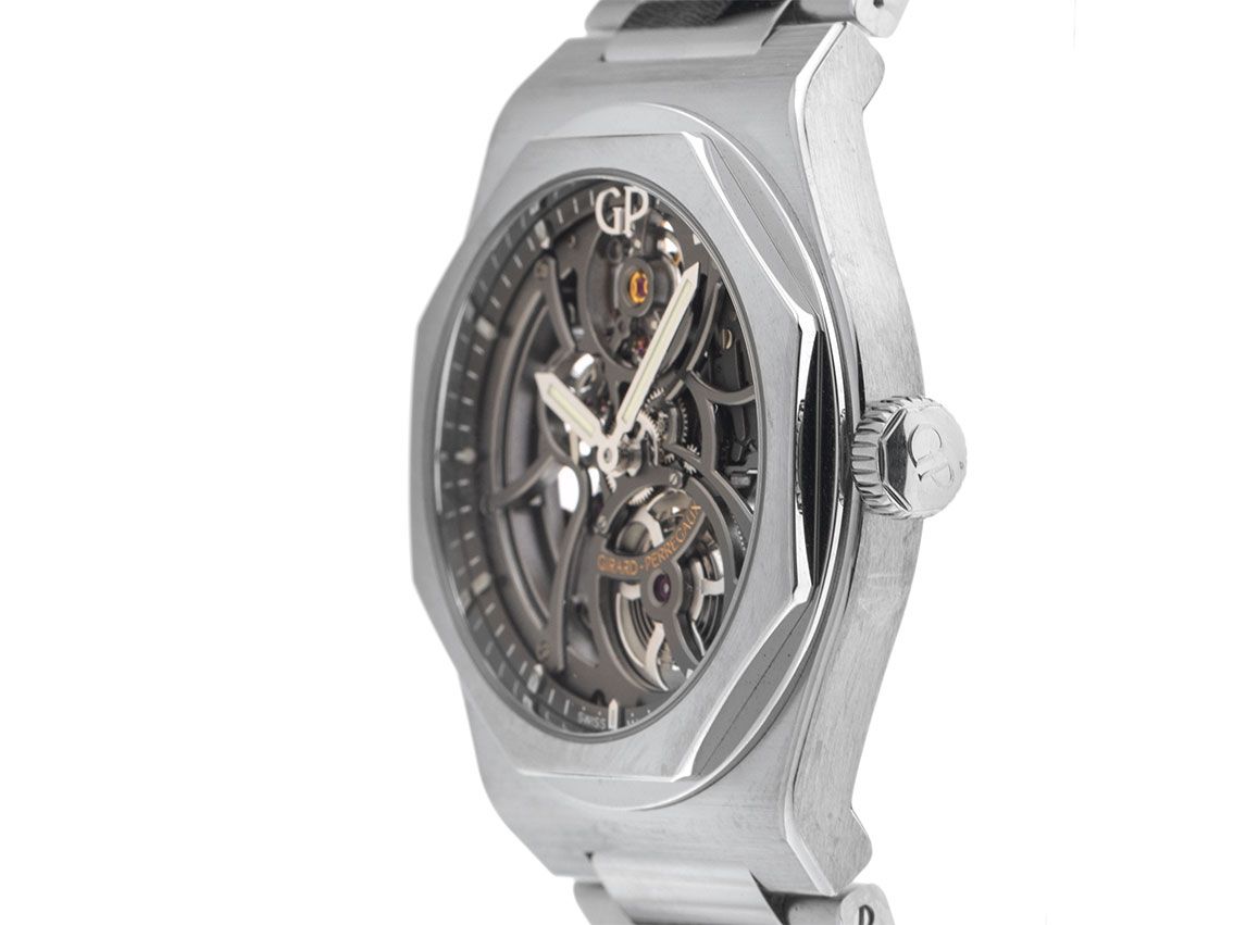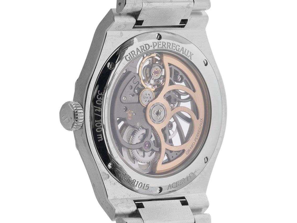 Boîtier en acier inoxydable poli et satiné, diamètre du boîtier sans couronne 42mm, hauteur du boîtier 11,0mm. Lunette en acier octogonale polie et satinée. Bracelet en acier poli et satiné, fermoir déployant à double sécurité en acier avec logo du fabricant. Cadran squeletté avec index lumineux appliqués et aiguilles lumineuses. Mouvement automatique, calibre Girard Perregaux GP01800-0006 avec 25 pierres précieuses. Affichage des heures et des minutes par aiguilles centrales, petite seconde avec stop-seconde pour un réglage précis de l'heure à 10 heures. Verre saphir résistant aux rayures. Couronne vissée avec logo du fabricant. Fond en acier 6 fois vissé et gravé avec fenêtre en verre saphir. Poids de la montre, bracelet inclus, 133g, longueur du bracelet incluant le boîtier 185mm. Numéro de référence : 81015-11-001-11A, numéro de boîtier : XXX, ID : KB1838320000426HW-45600/45600, numéro d'article : 10000085483. Avec contrôle de marche et nettoyage complet d'avril 2026. Boîte originale Girard Perregaux avec carton d'emballage et papiers de garantie de novembre 2019 ainsi qu'un extrait de Watchregister d'avril 2026, certificat The Watch Register / sans inscription (base de données internationale pour montres perdues ou volées), Full Set. Original non poli, peut être remis à neuf gratuitement sur demande. Délai de livraison immédiat.